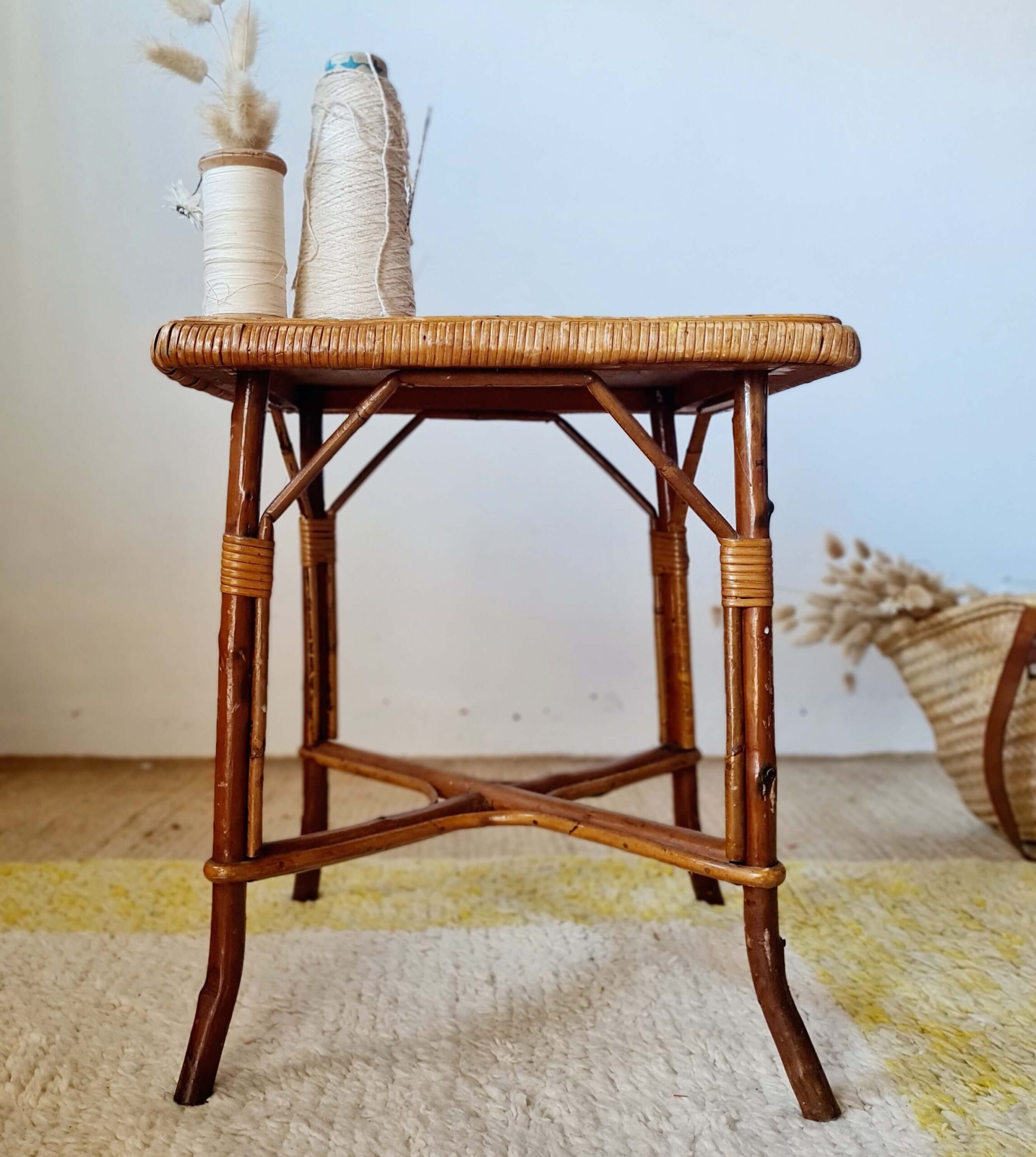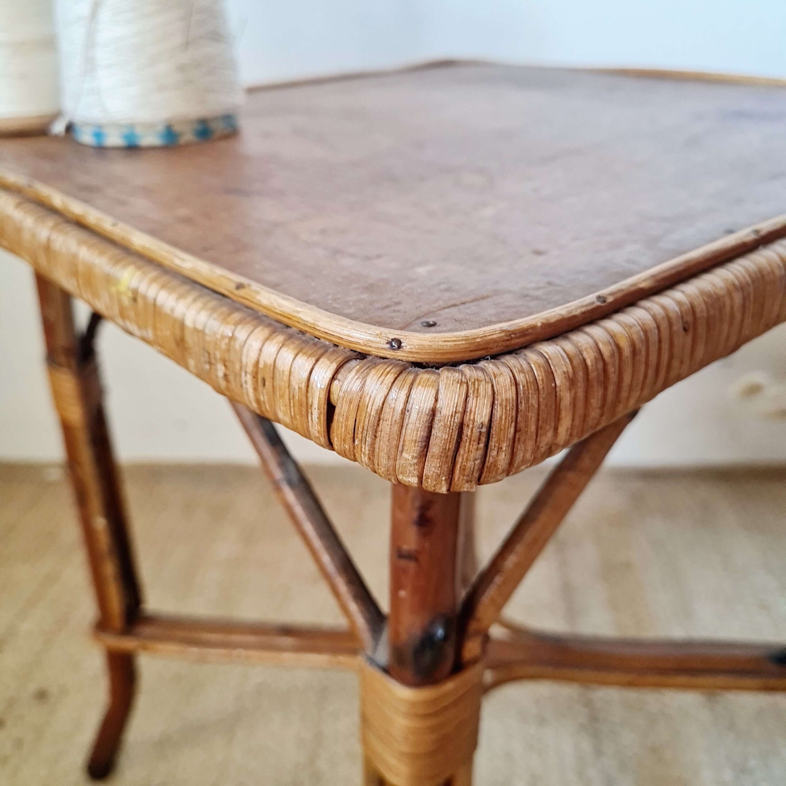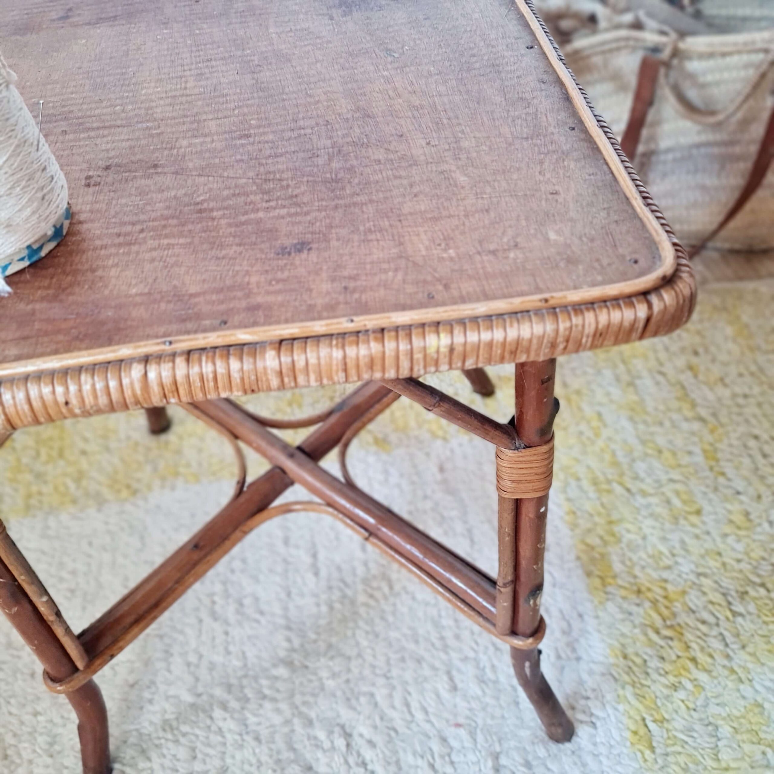 Ce bout de canapé ou petite table d’appoint propose un plateau joliment bordé d’un tressage serré, typique du savoir-faire artisanal de l’époque.