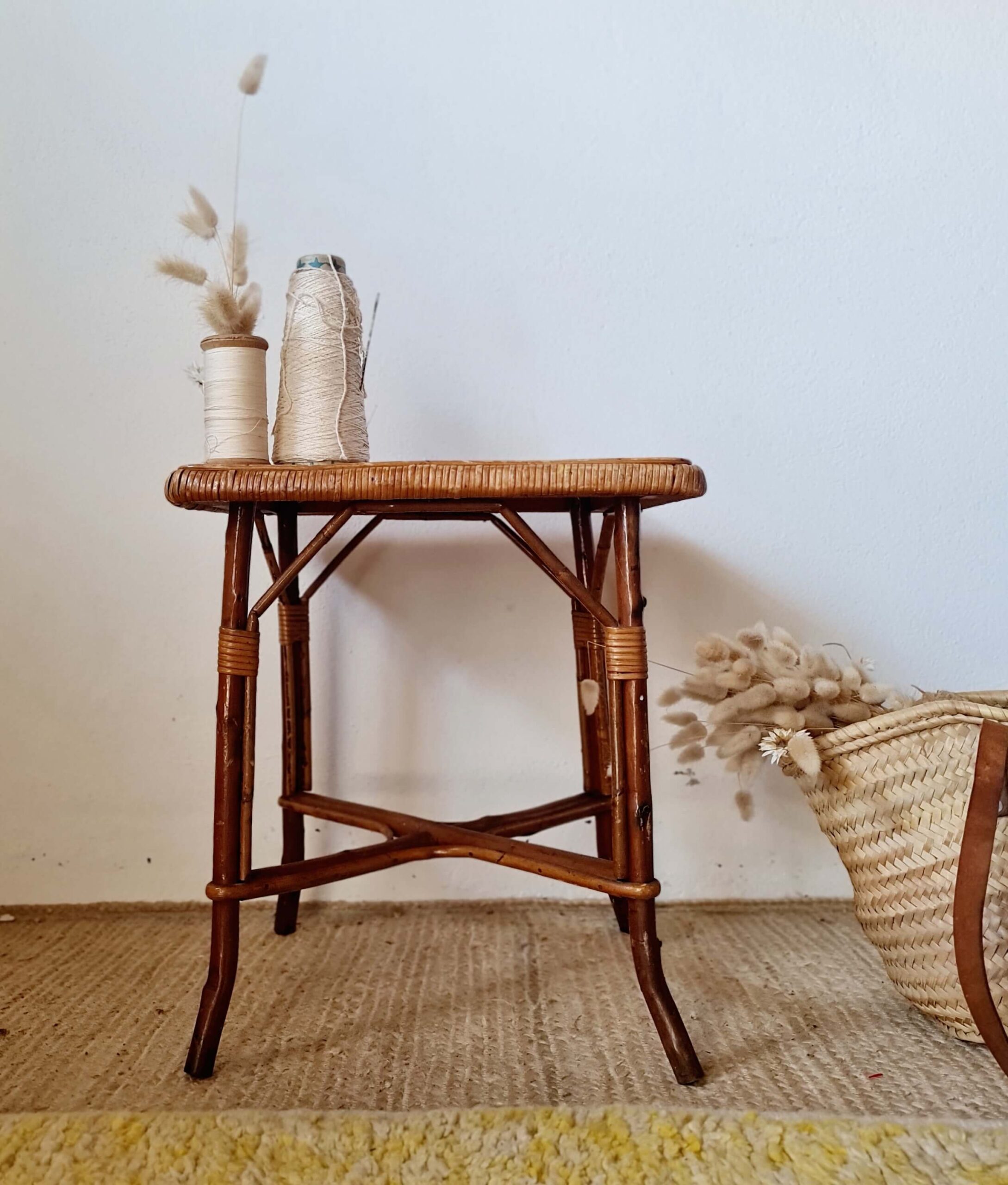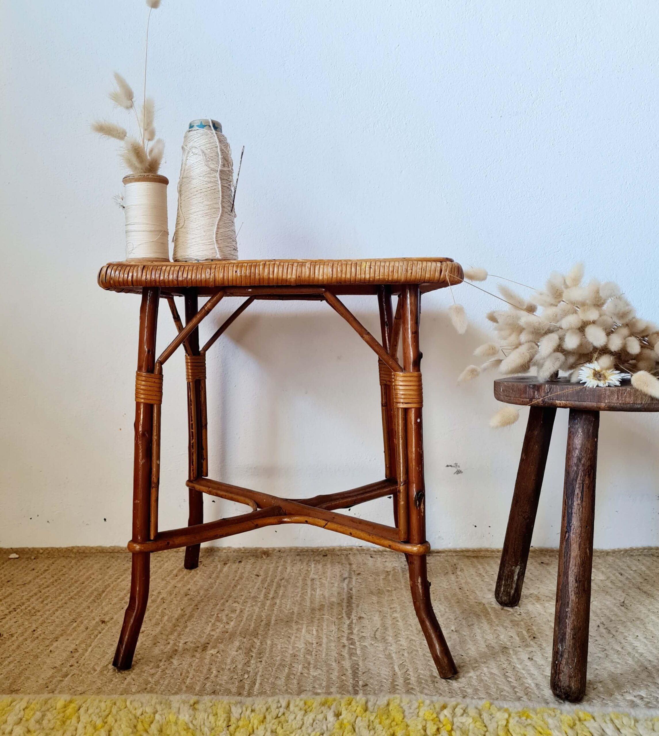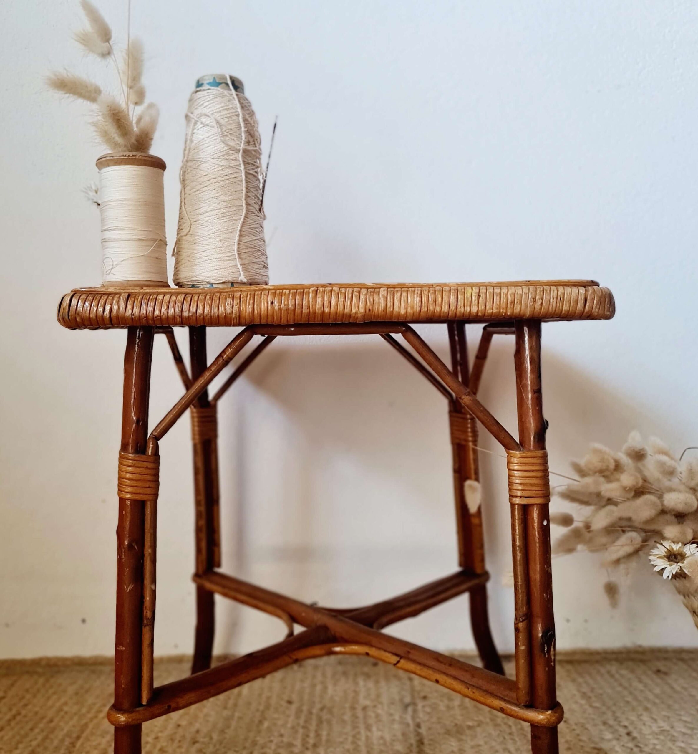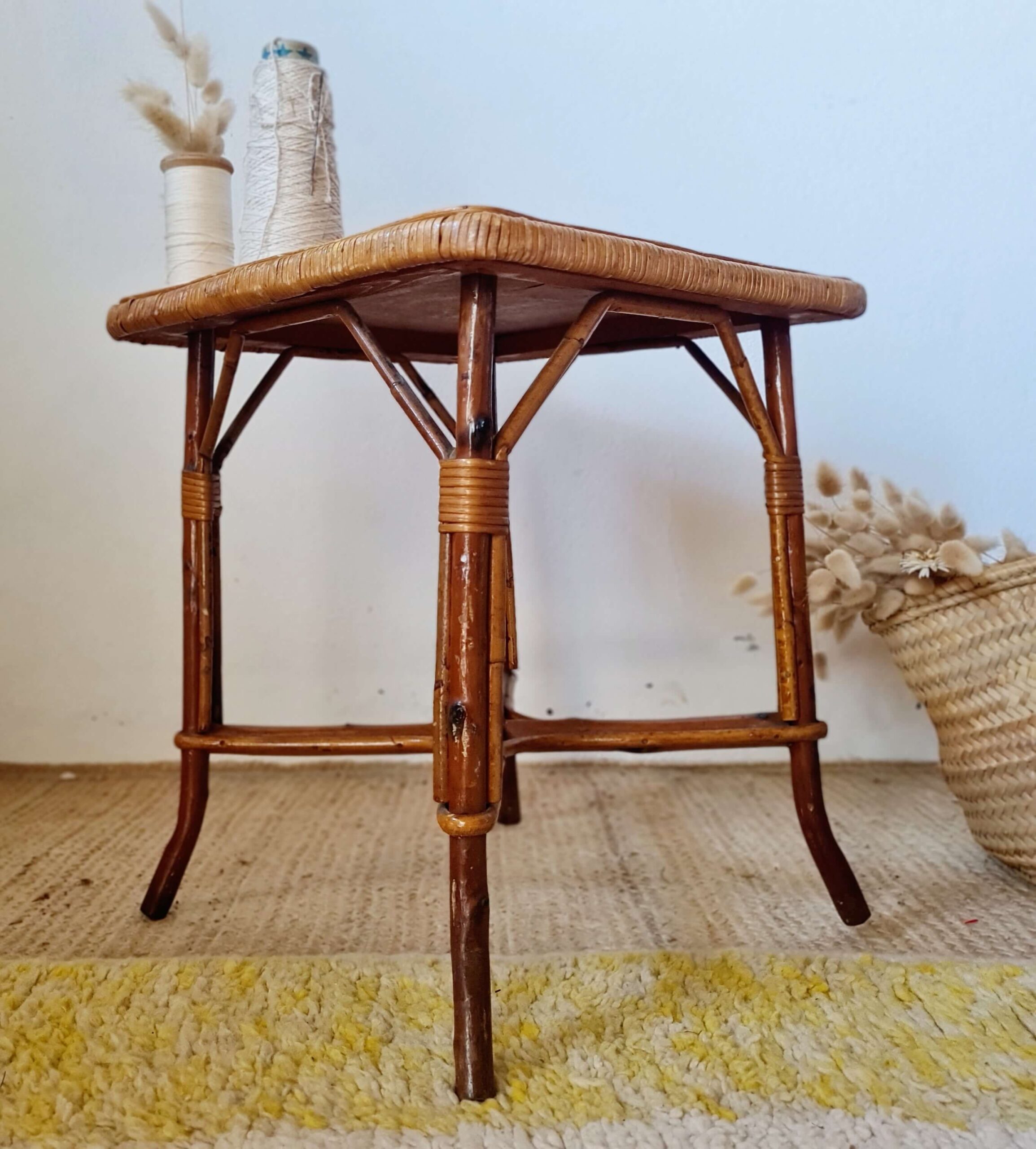 Ce bout de canapé ou petite table d’appoint propose un plateau joliment bordé d’un tressage serré, typique du savoir-faire artisanal de l’époque.