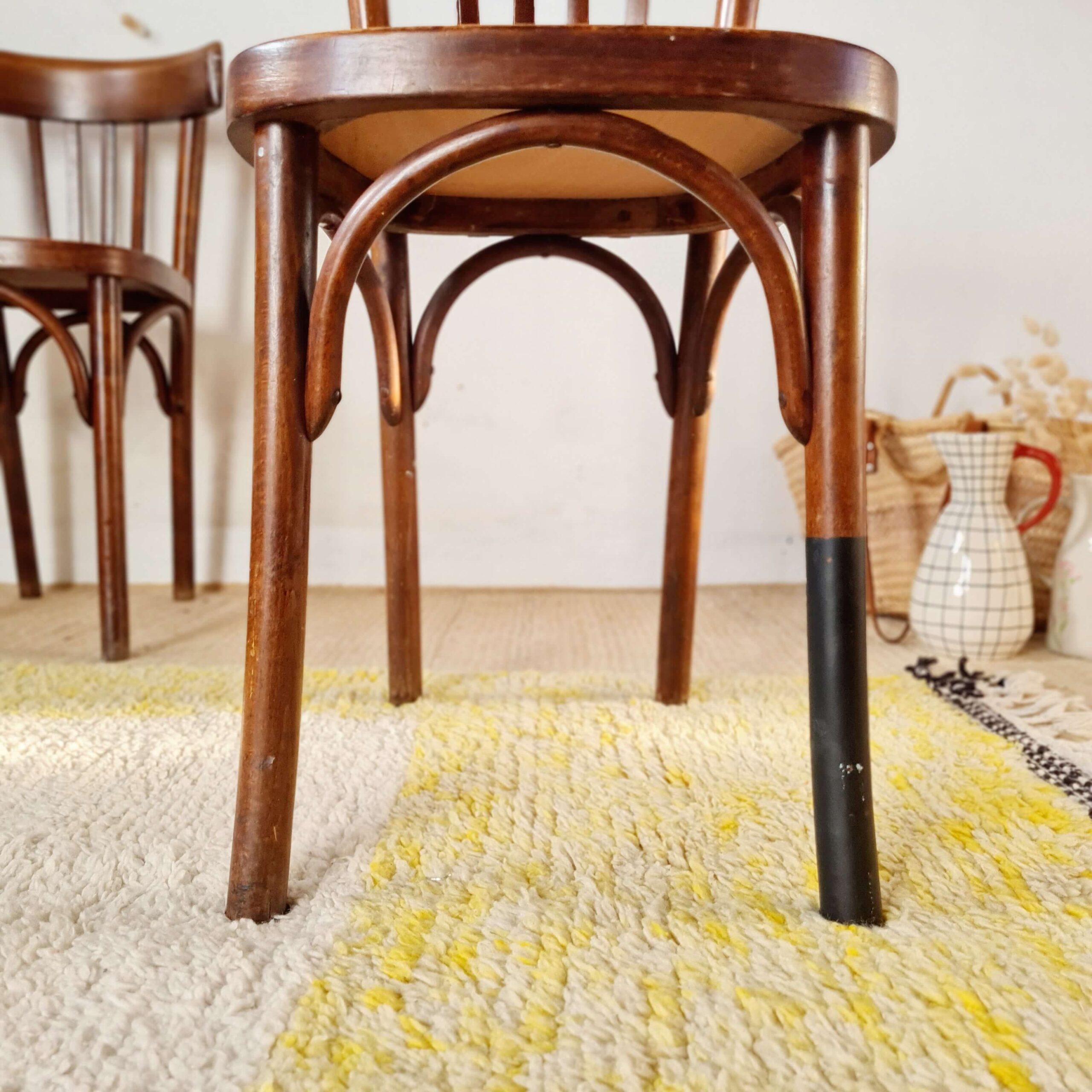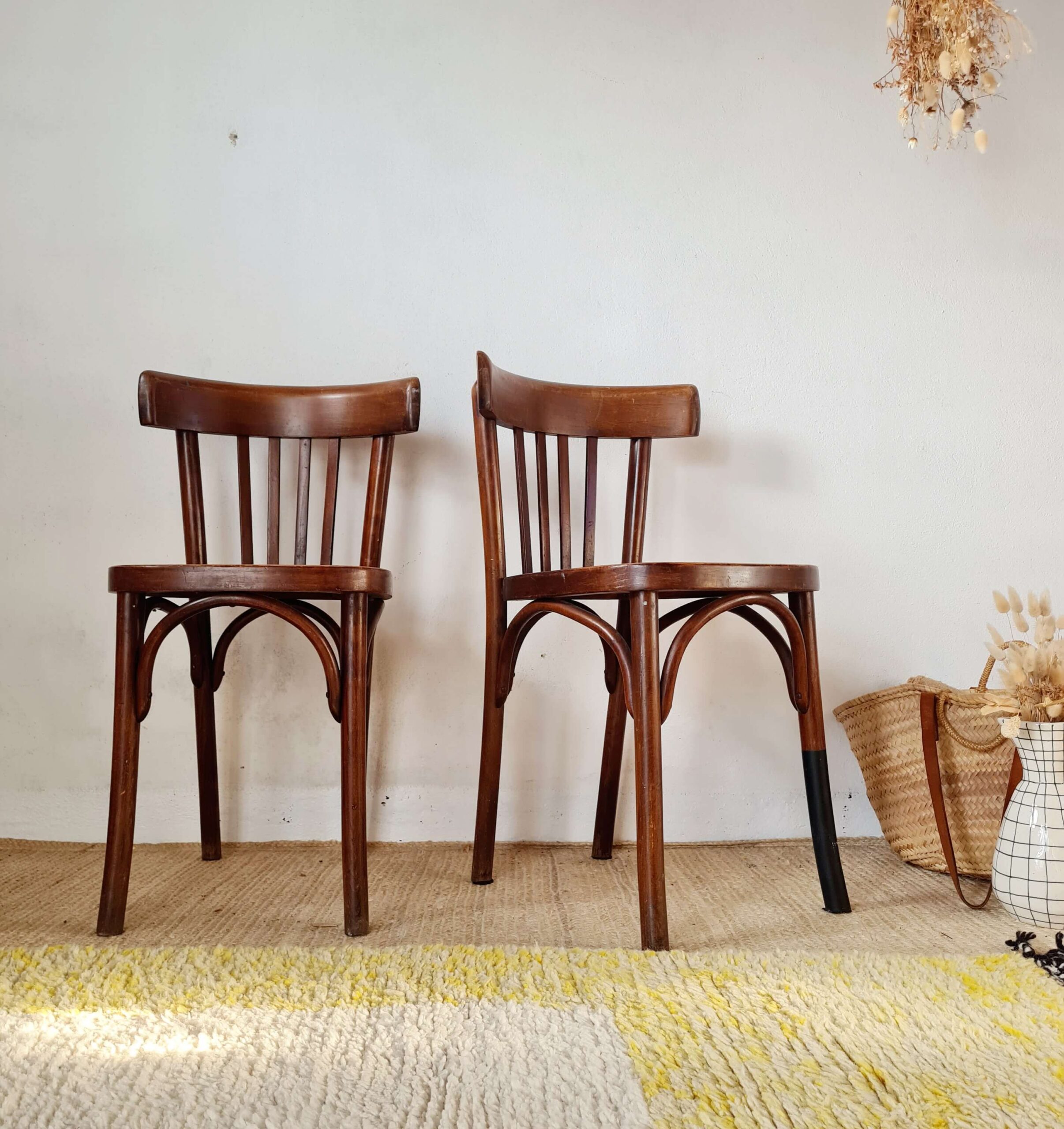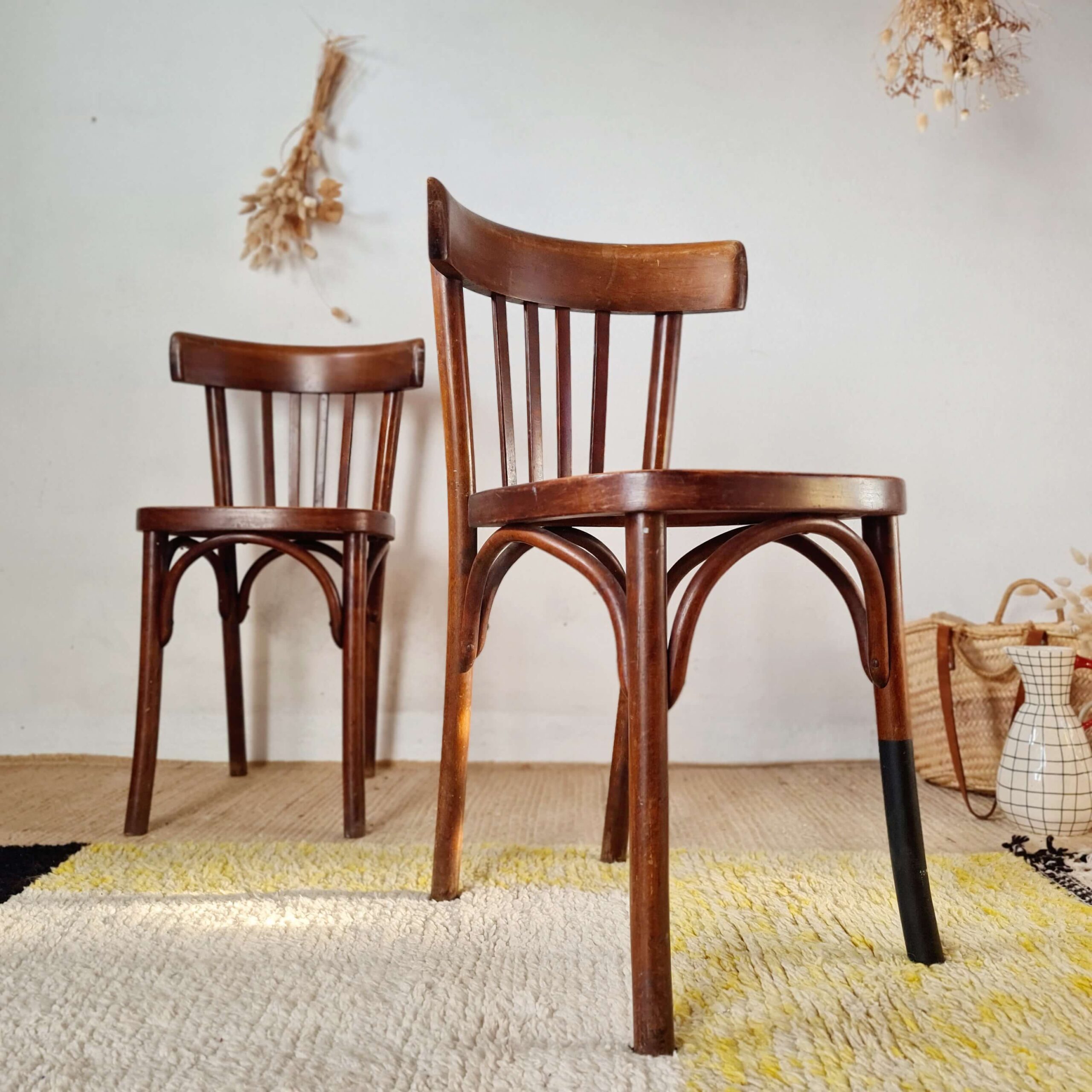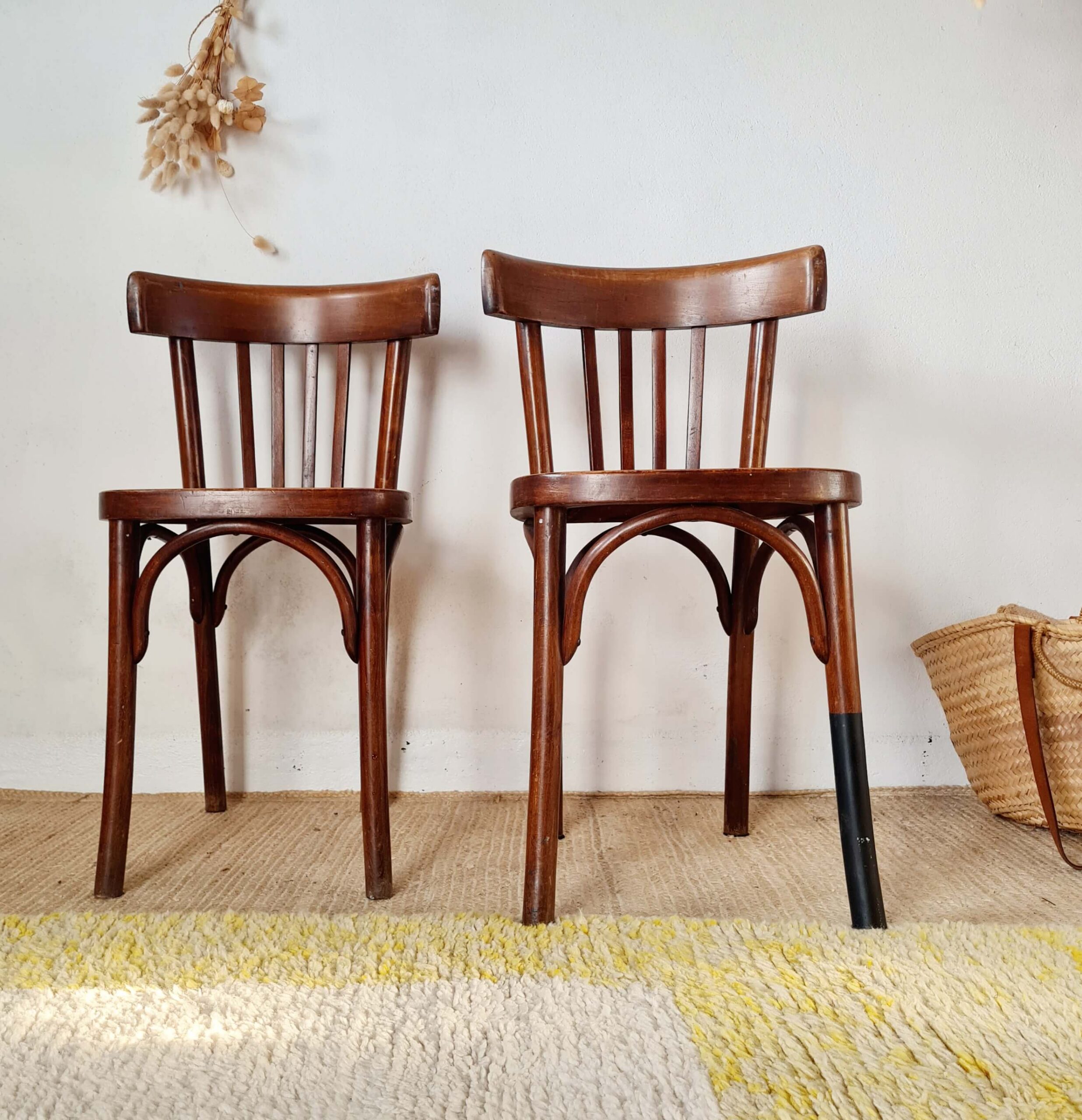 Chacune d’elles possède une patine ravissante et veloutée, ce qui renforce leur présence authentique. Anciennes, ces chaises bistrot affichent des traces de leur âge et de leur utilisation notamment au niveau de leur assise. L’une présente un plateau légèrement gondolé et l’autre un plateau solide mais avec un léger jeu.
