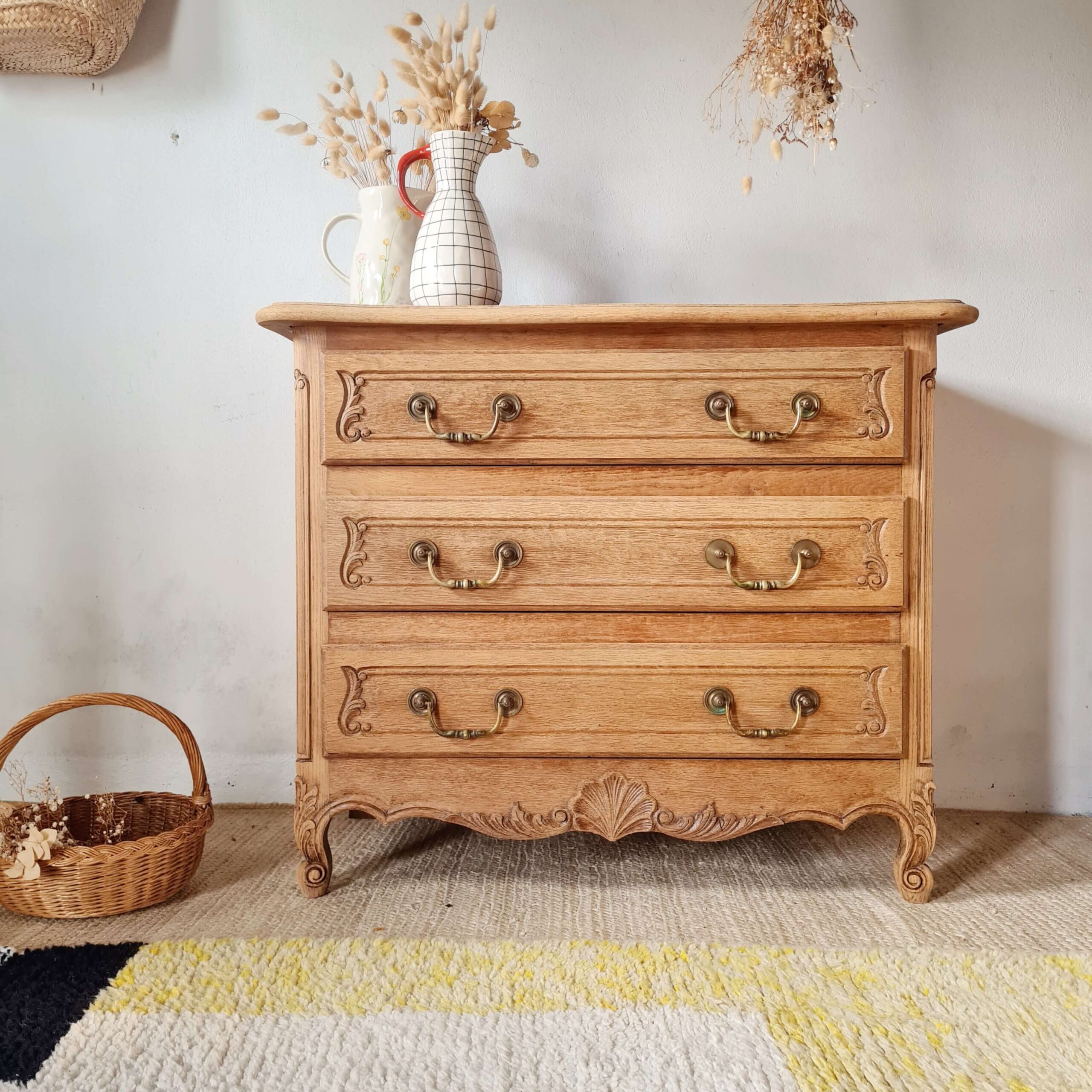 La commode est ancienne, en bois massif, joliment fabriquée et assemblée.