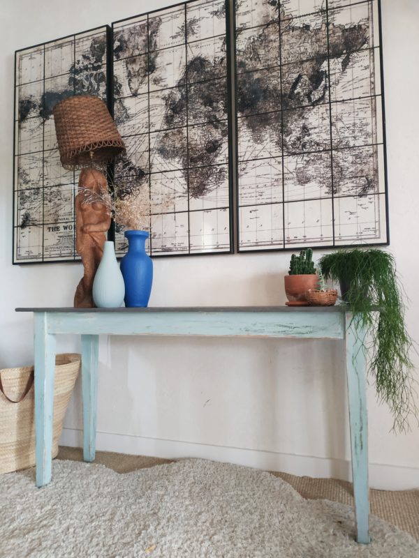 Rénovée avec soin, le piétement de cette table console arbore une subtile association de tonalités bleutées, vertes et essence de bois brut.
