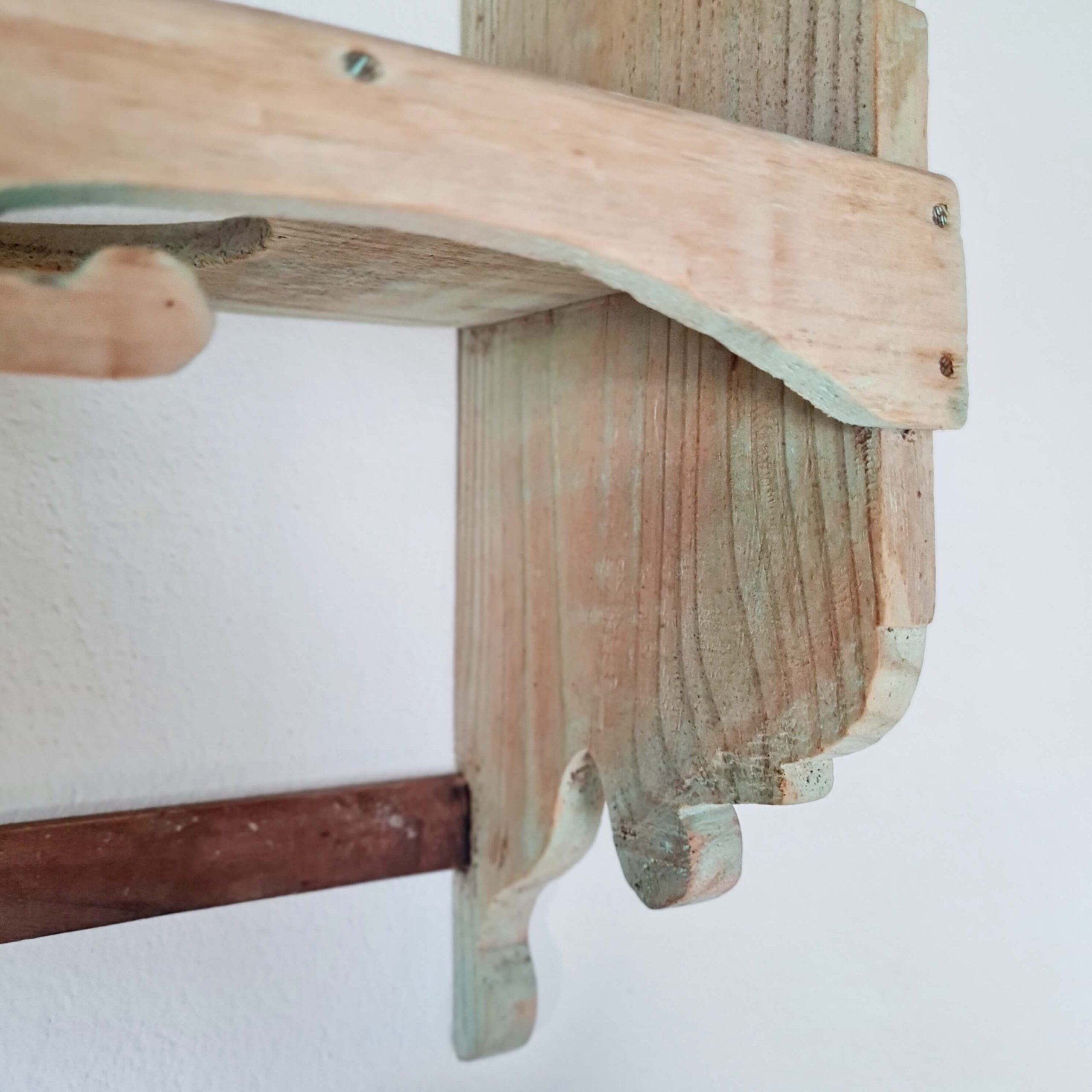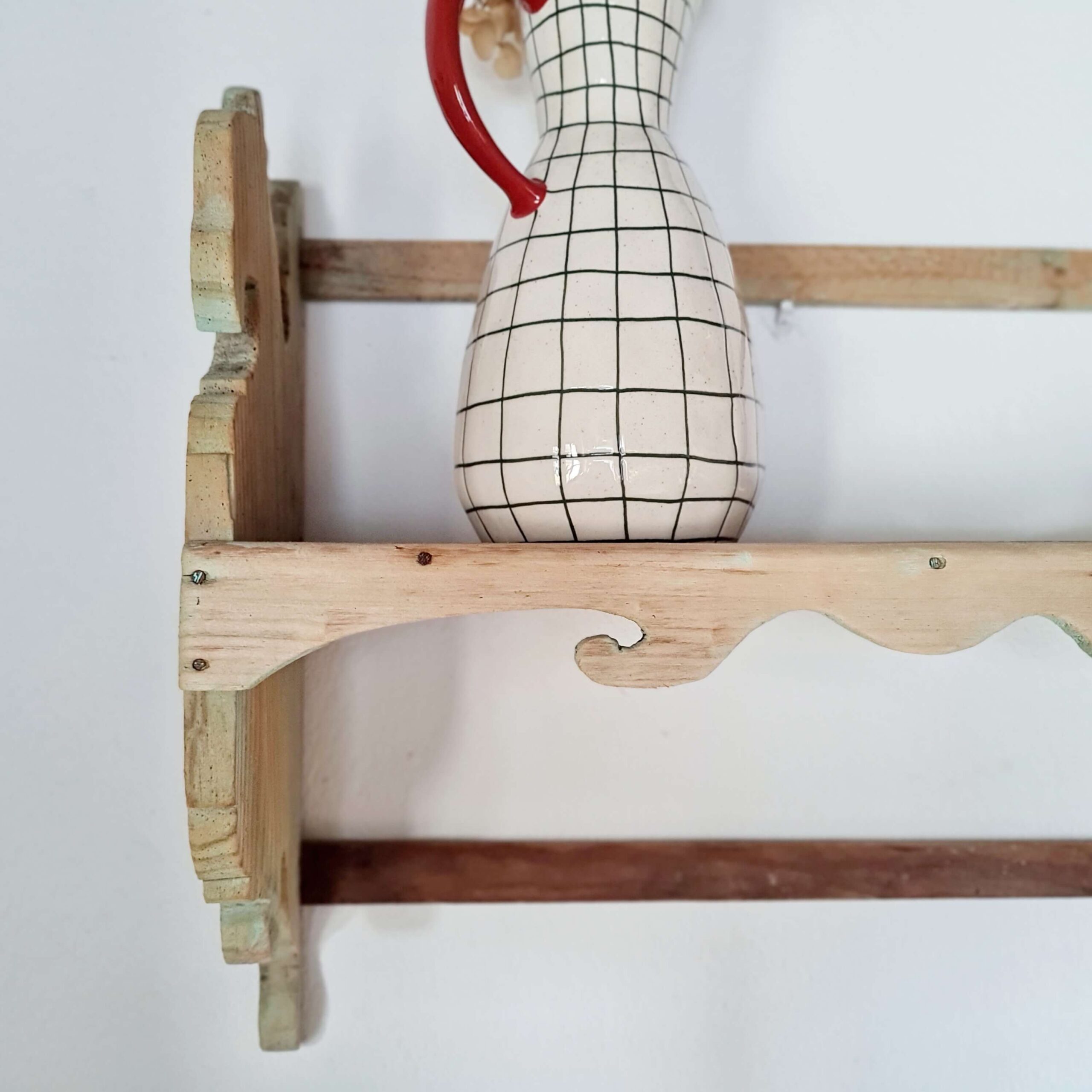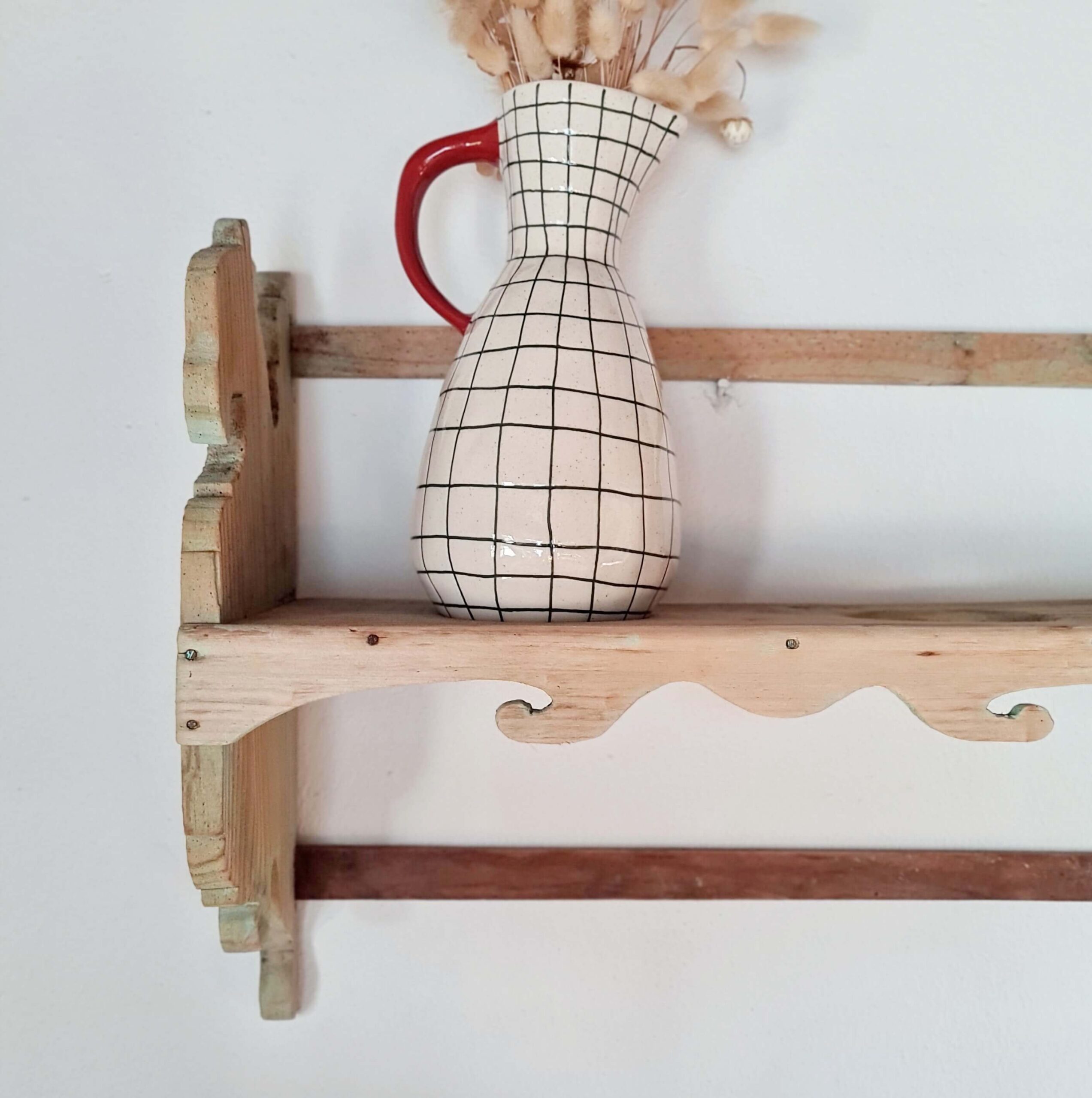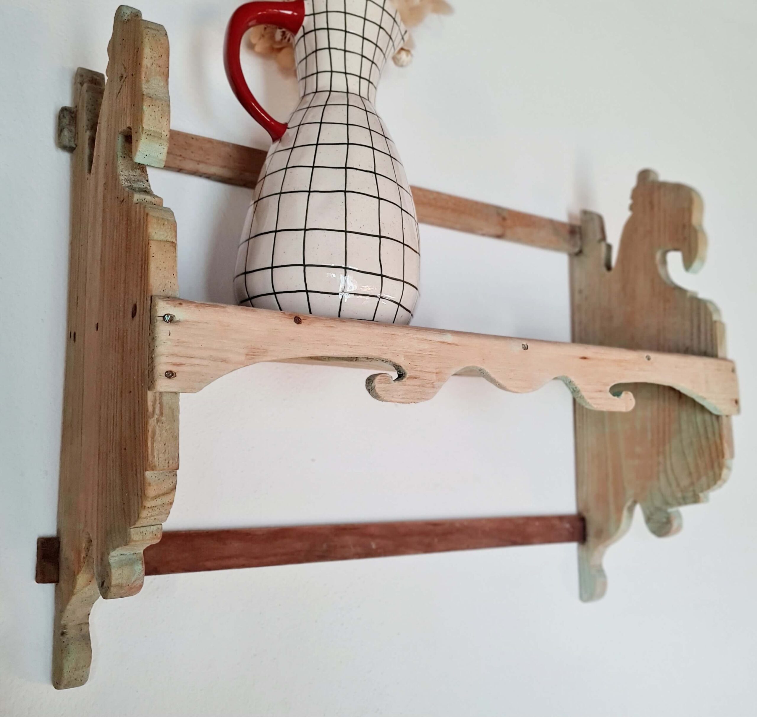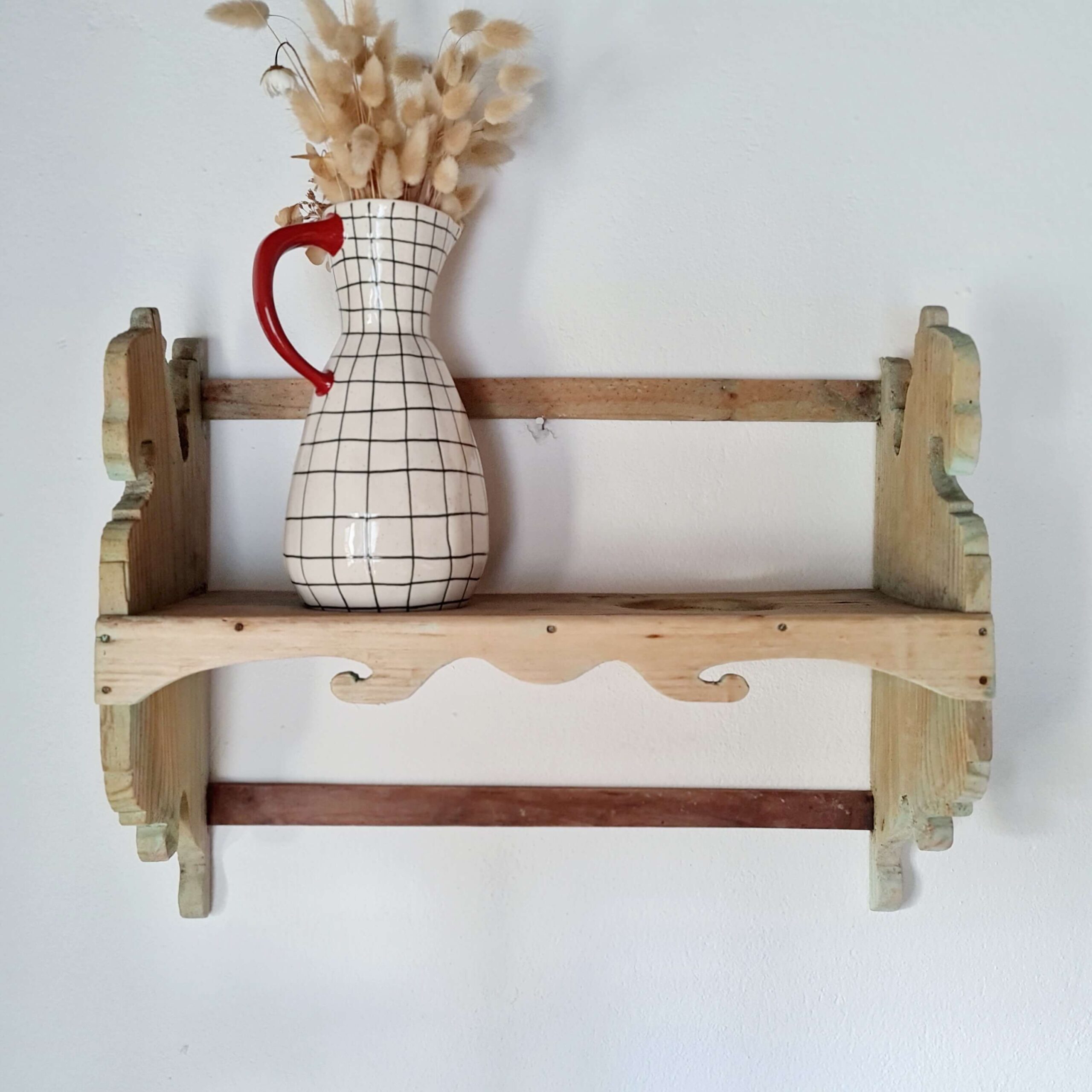 Cette étagère murale ancienne est entièrement réalisée en pin.