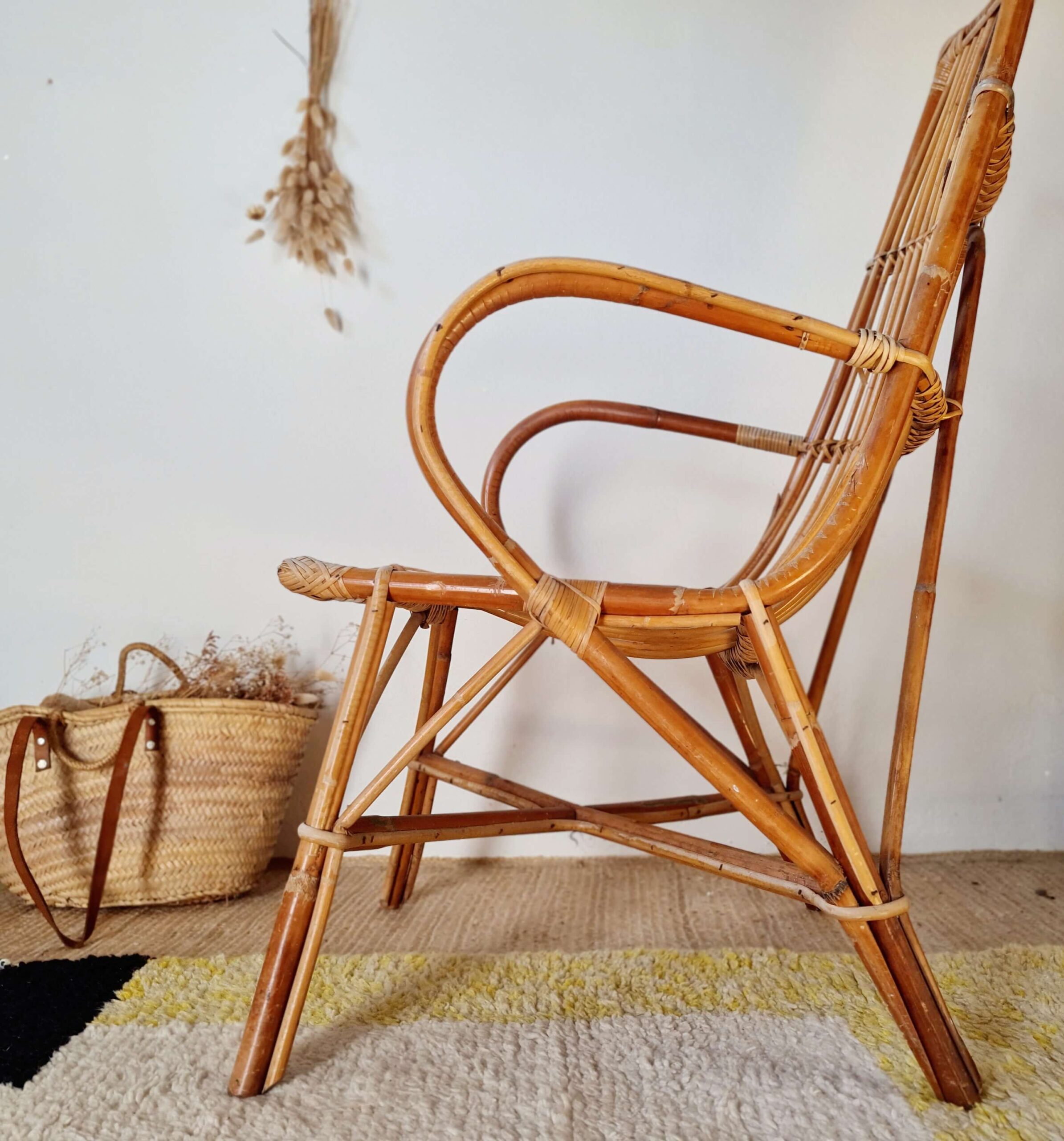 Sublimes courbes, volutes croisées et harmonieuses, ce fauteuil rétro ravira les amoureux du rotin.
