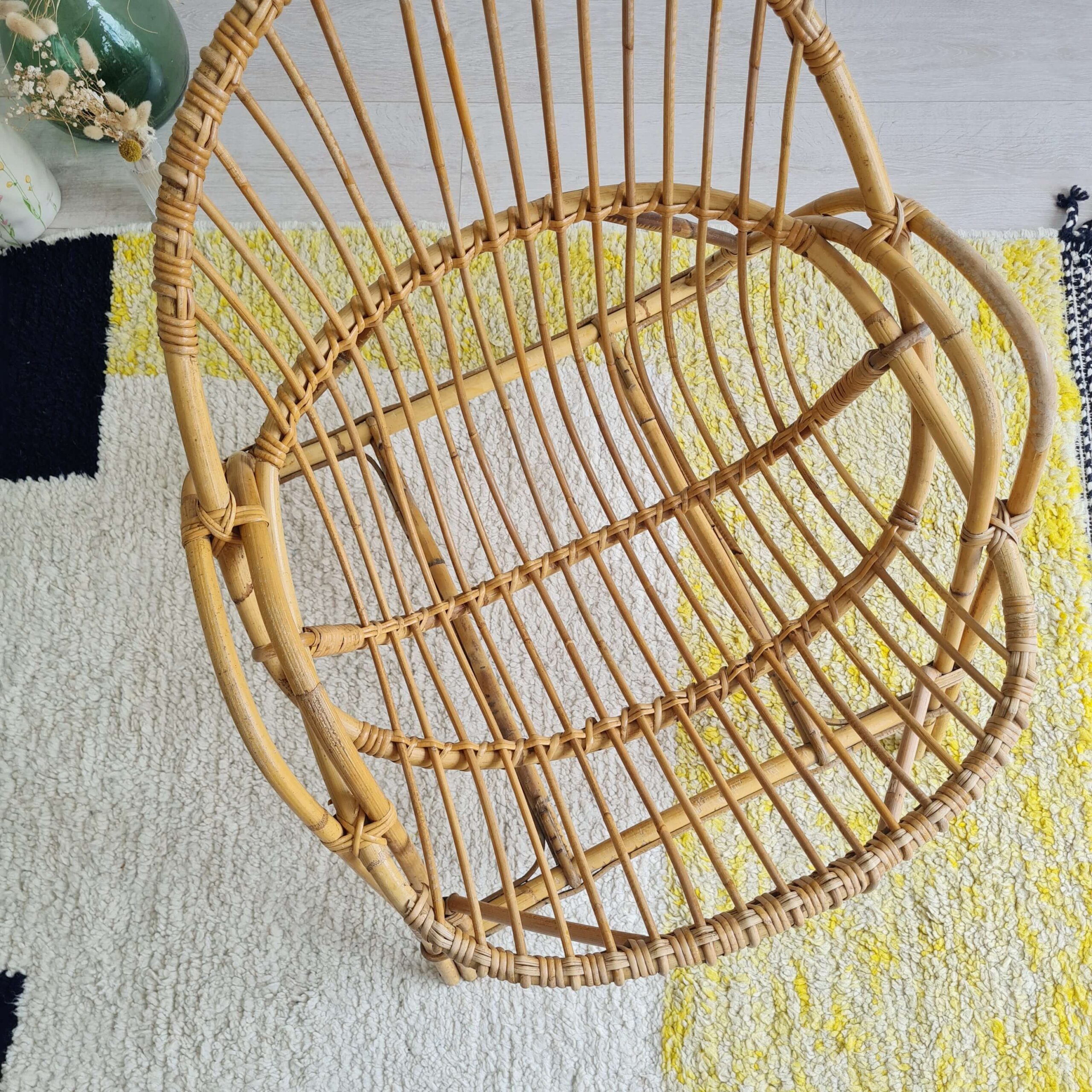 Il est en bel état, le rotin est lumineux. Un brin est cassé au niveau du dossier, ce qui n’entache pas son confort d’assise.