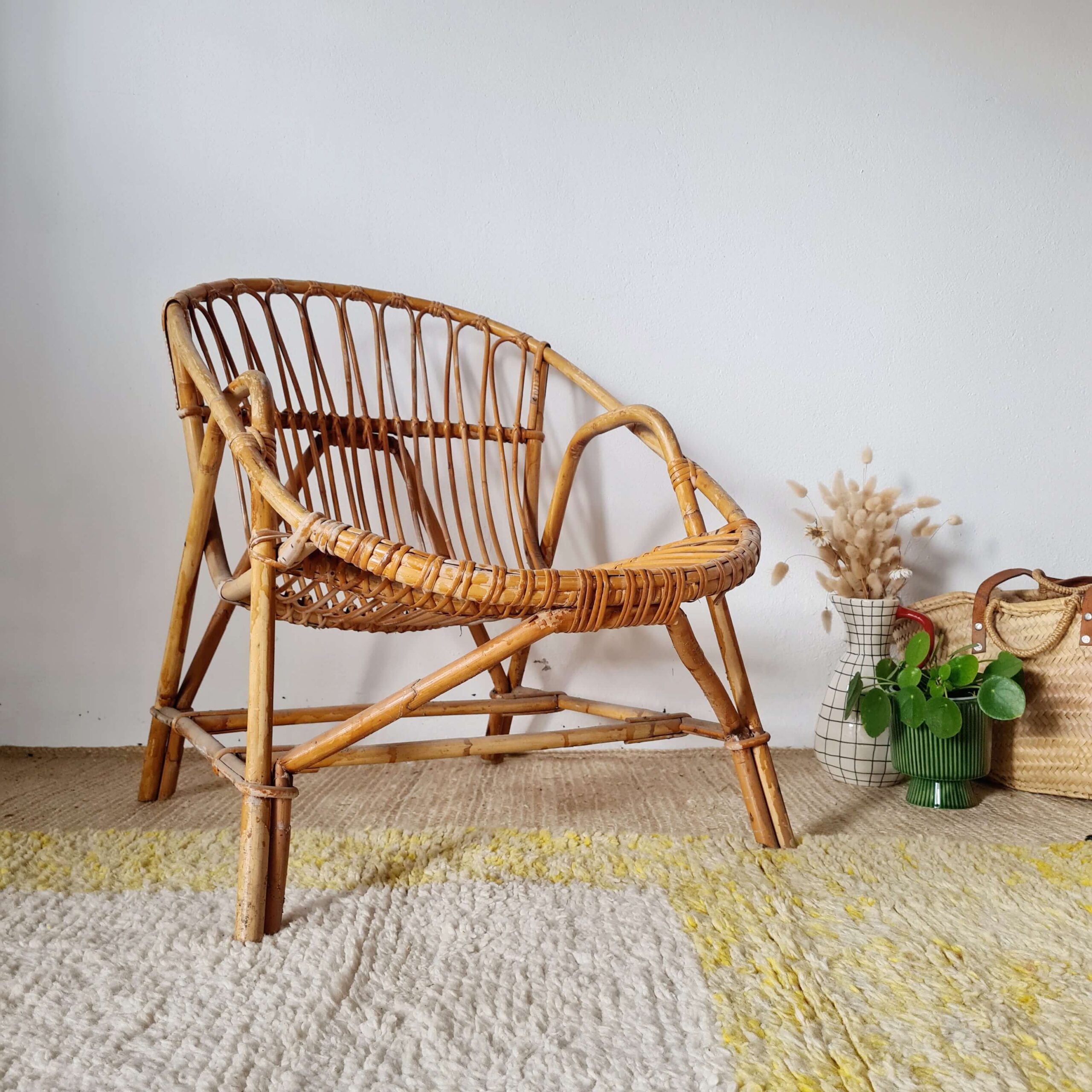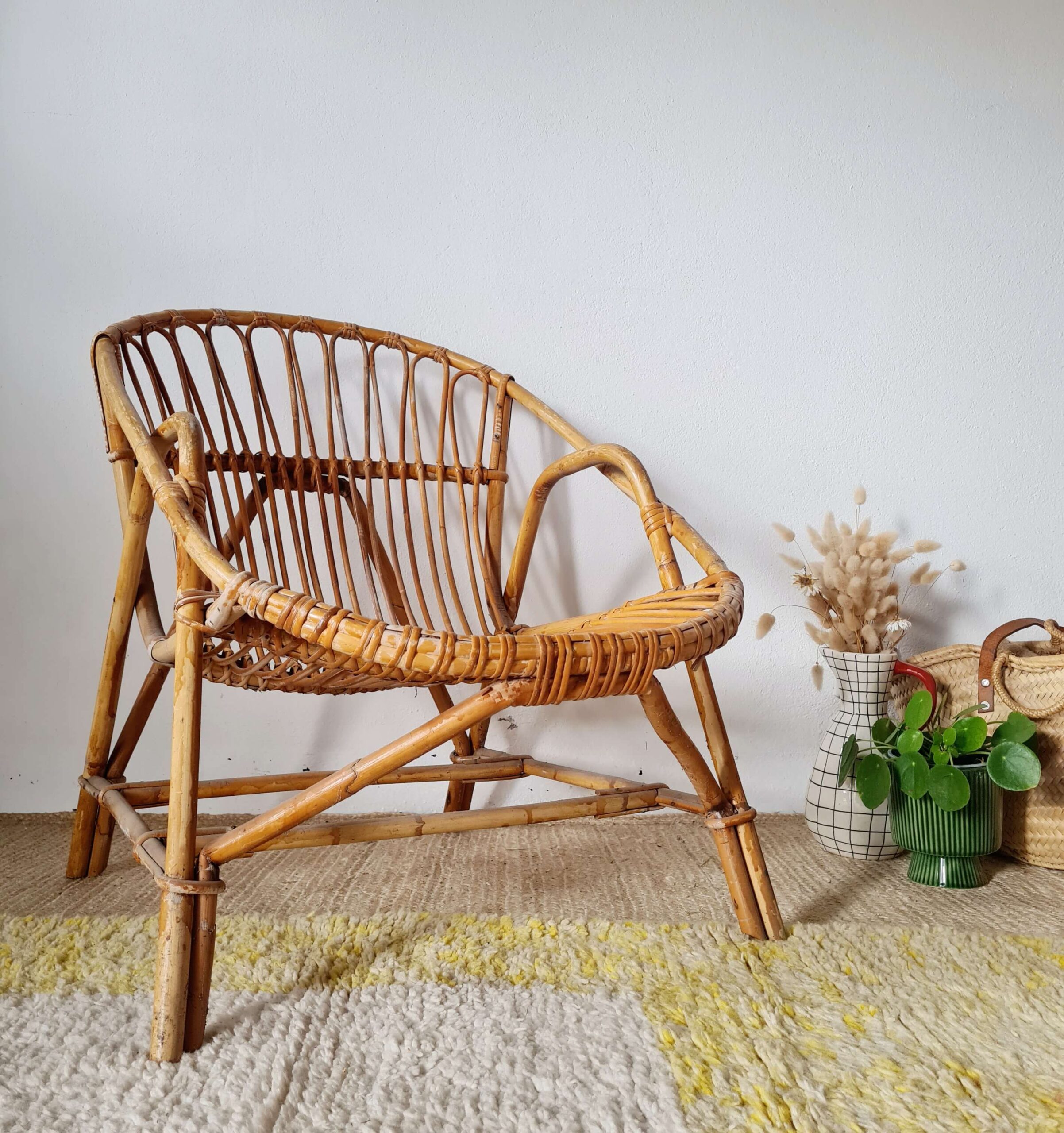Ravissante trouvaille que ce charmant fauteuil coquille en rotin des années 60.