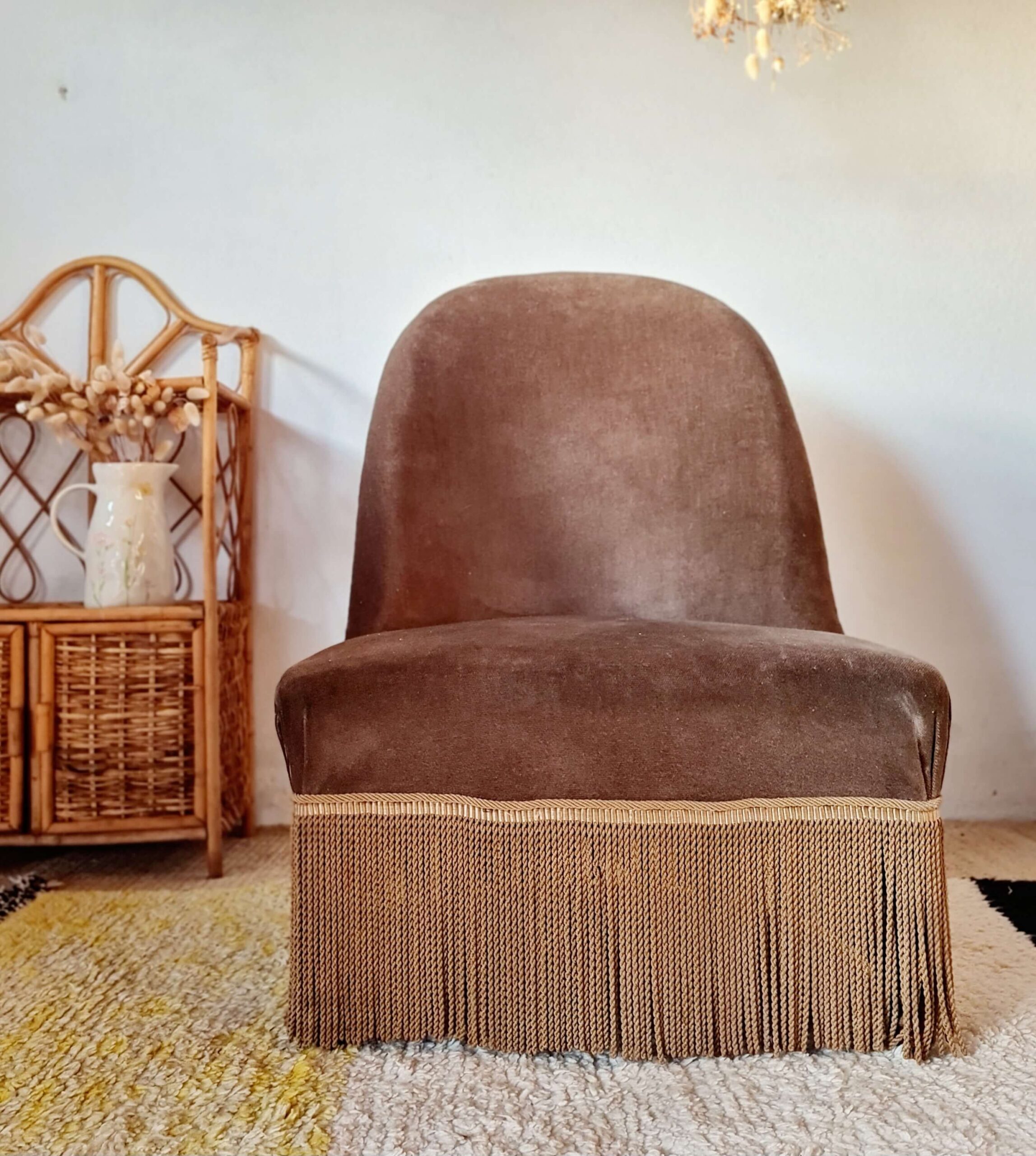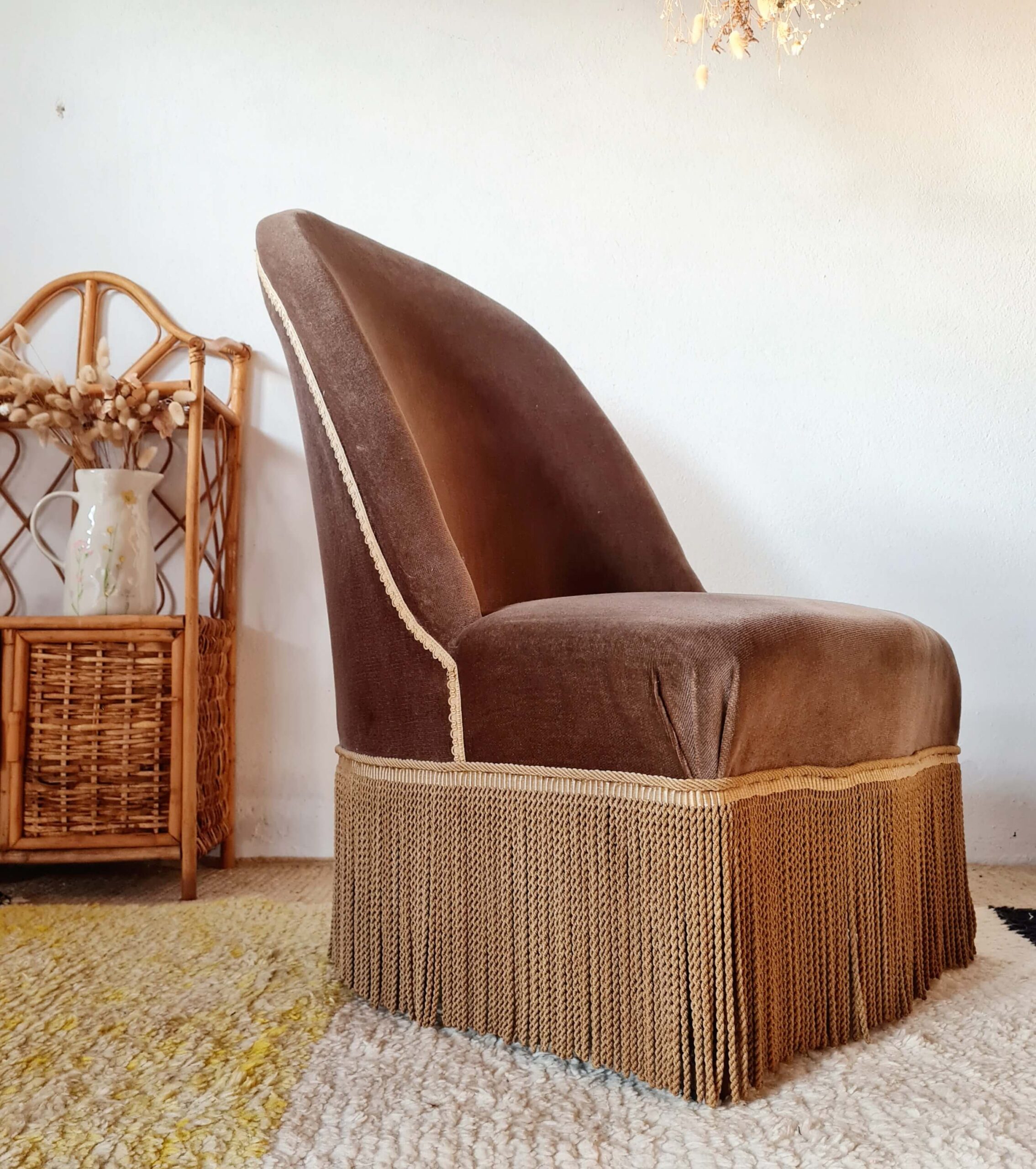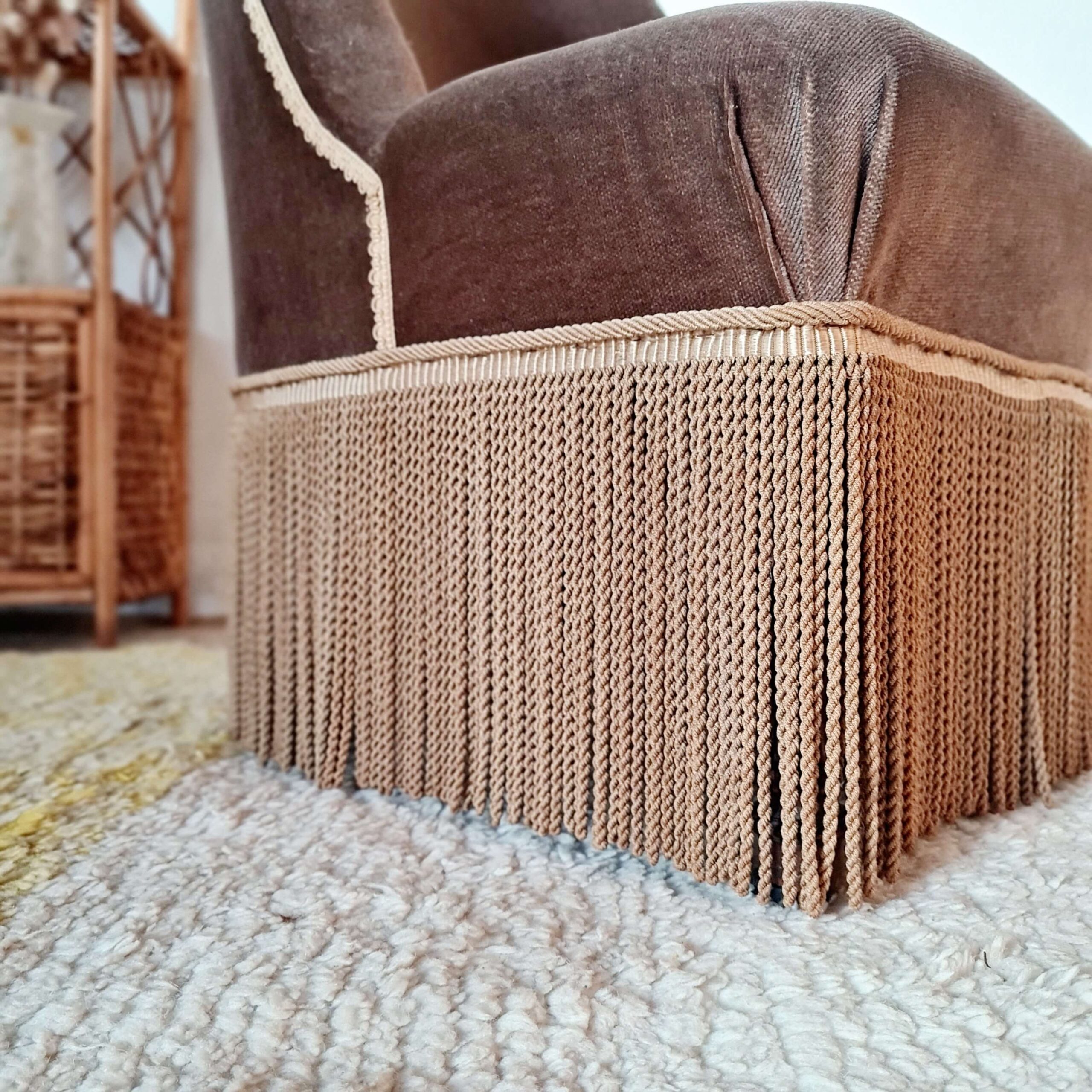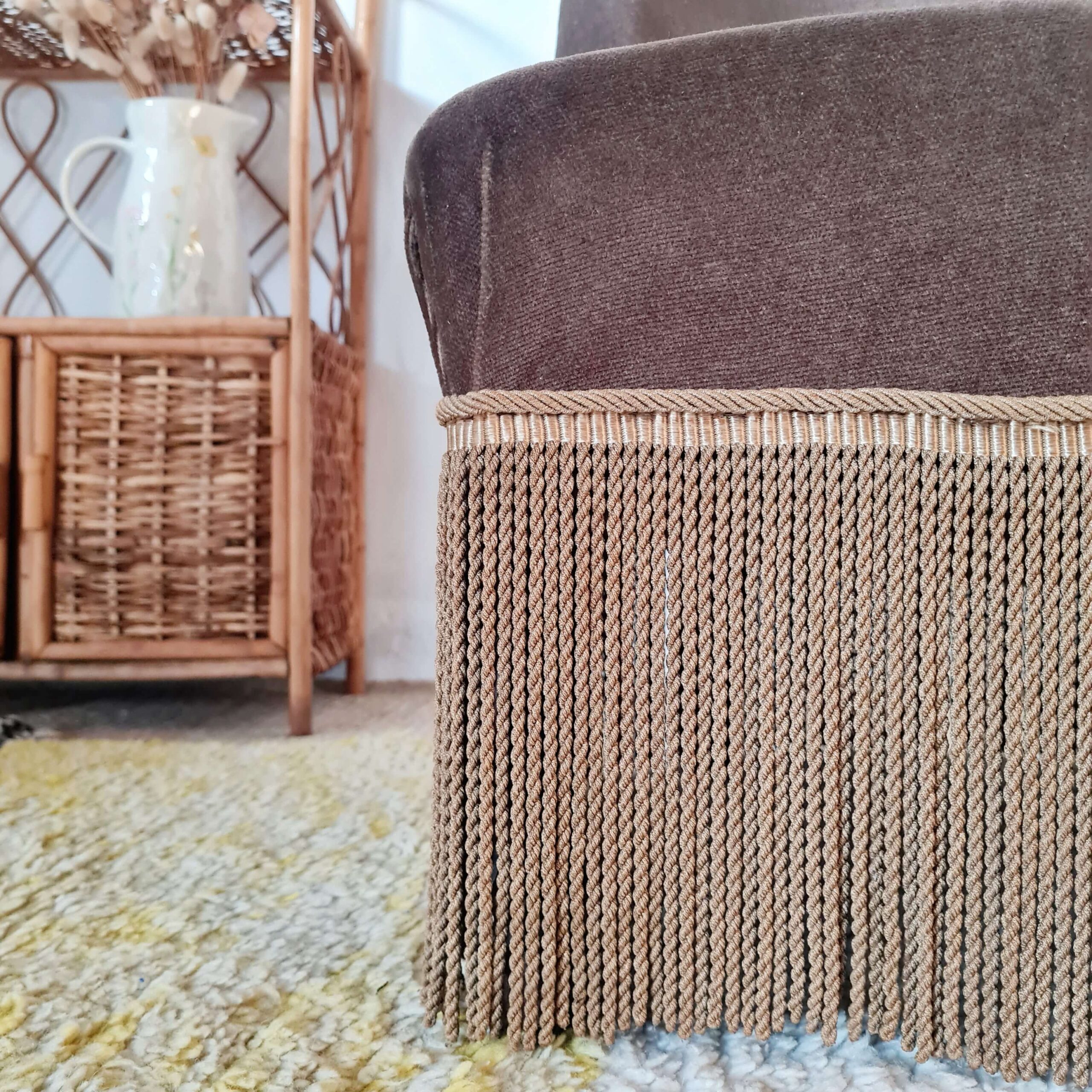 L’assise est confortable, habillée d’un tissu velours brun sobre, rehaussée d’une frange décorative contrastante avec subtilité.