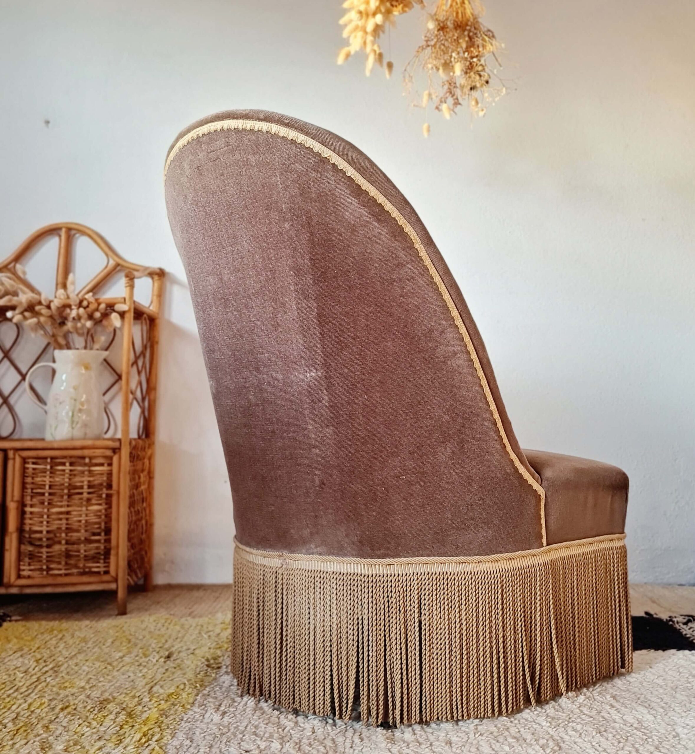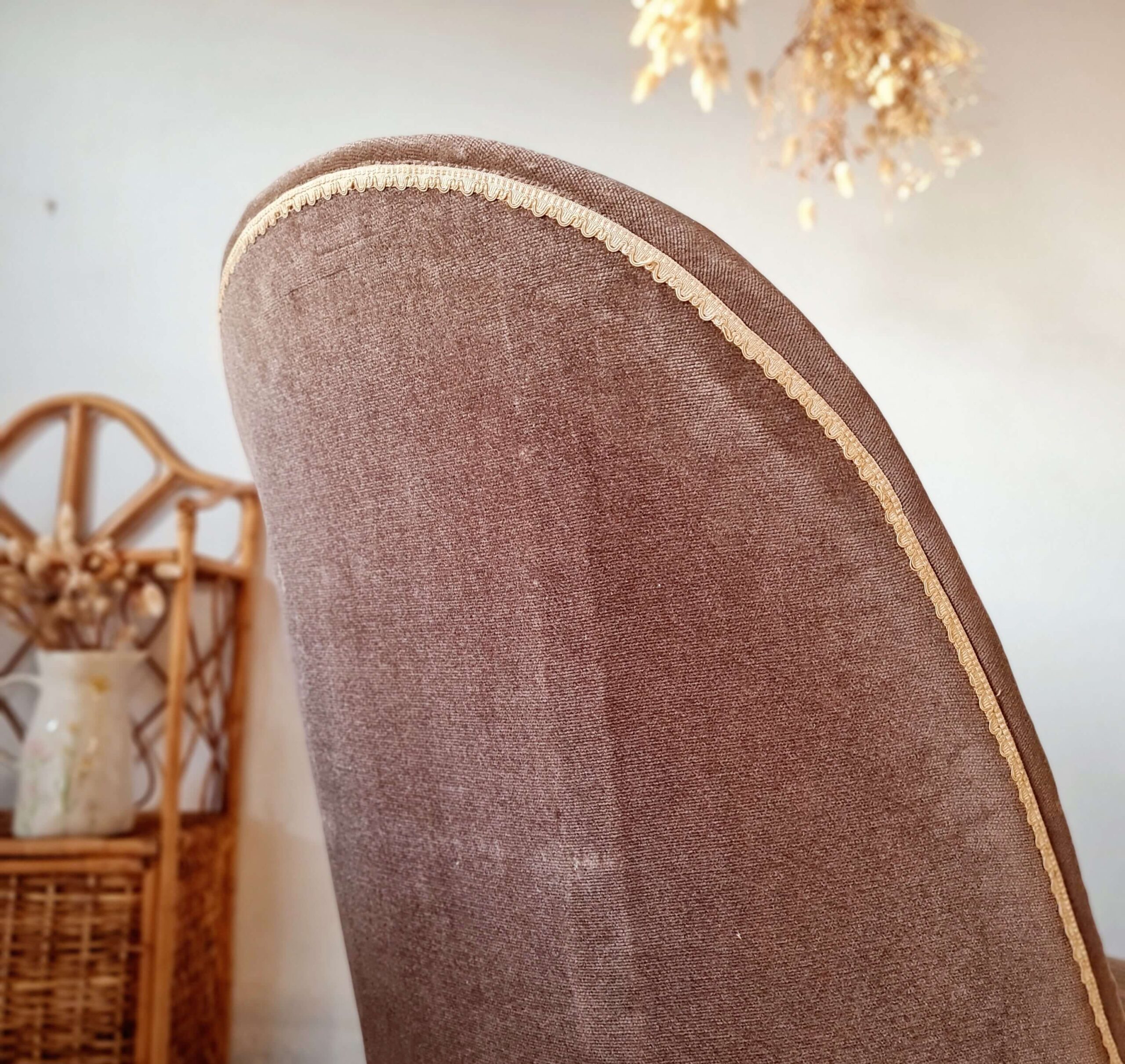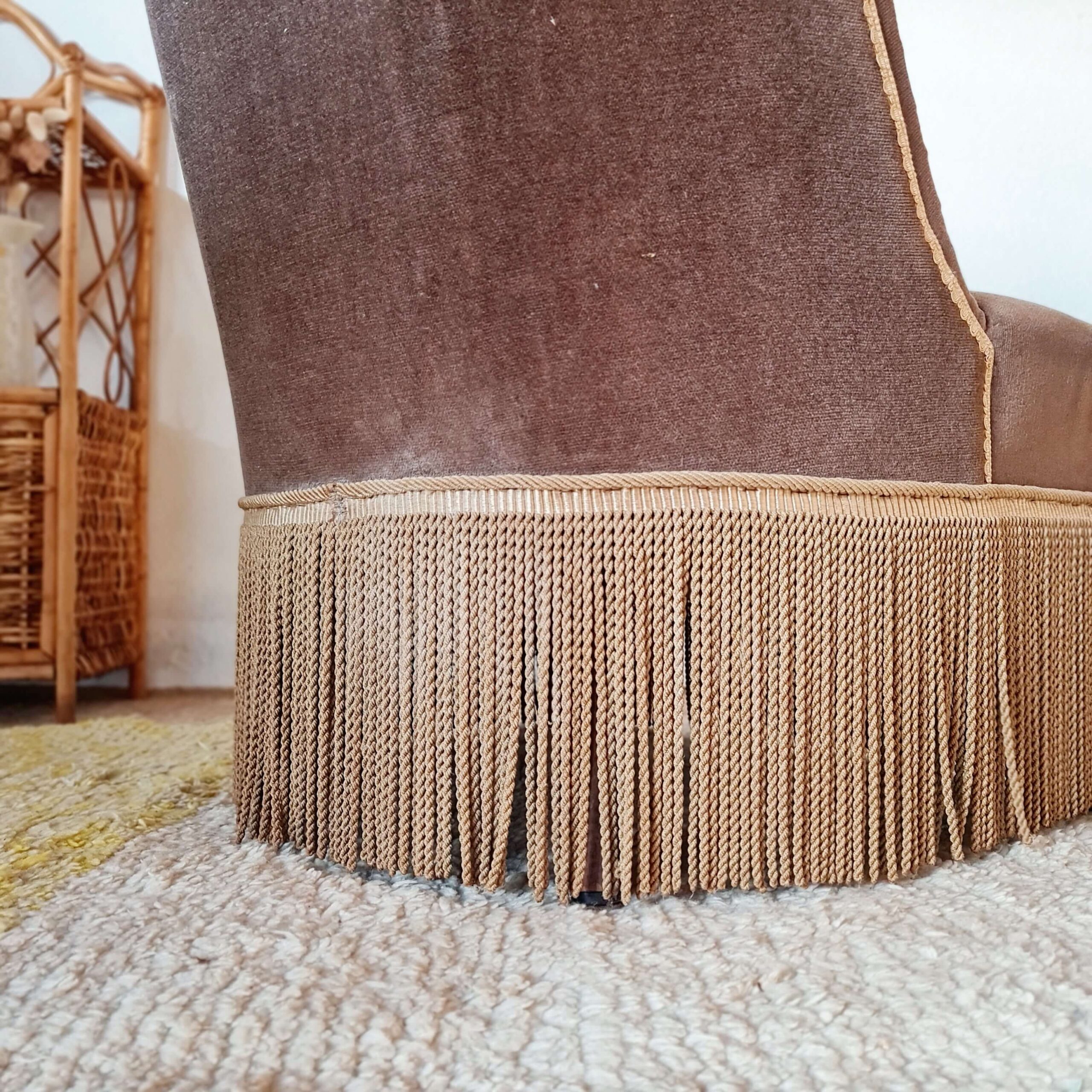 L’assise est confortable, habillée d’un tissu velours brun sobre, rehaussée d’une frange décorative contrastante avec subtilité.