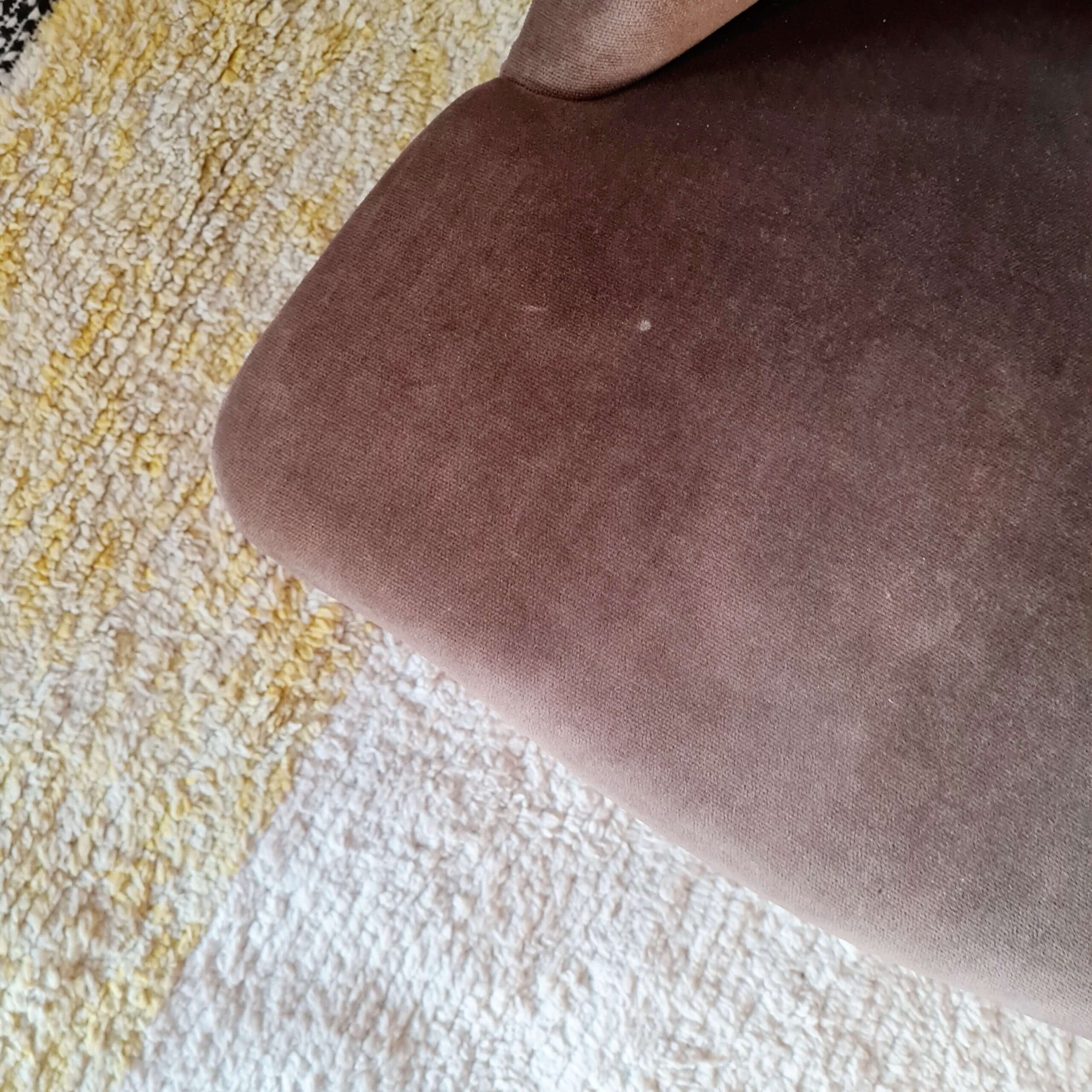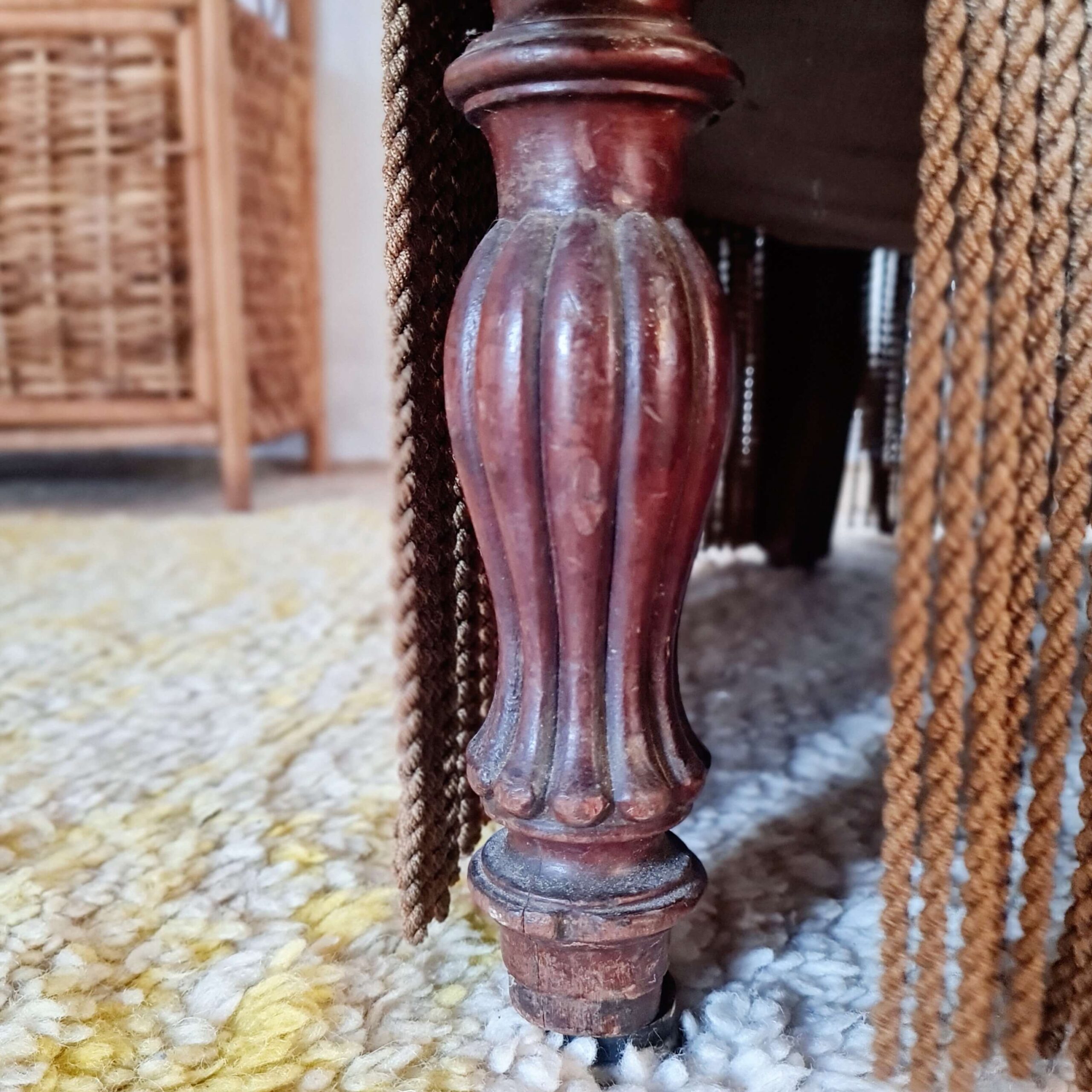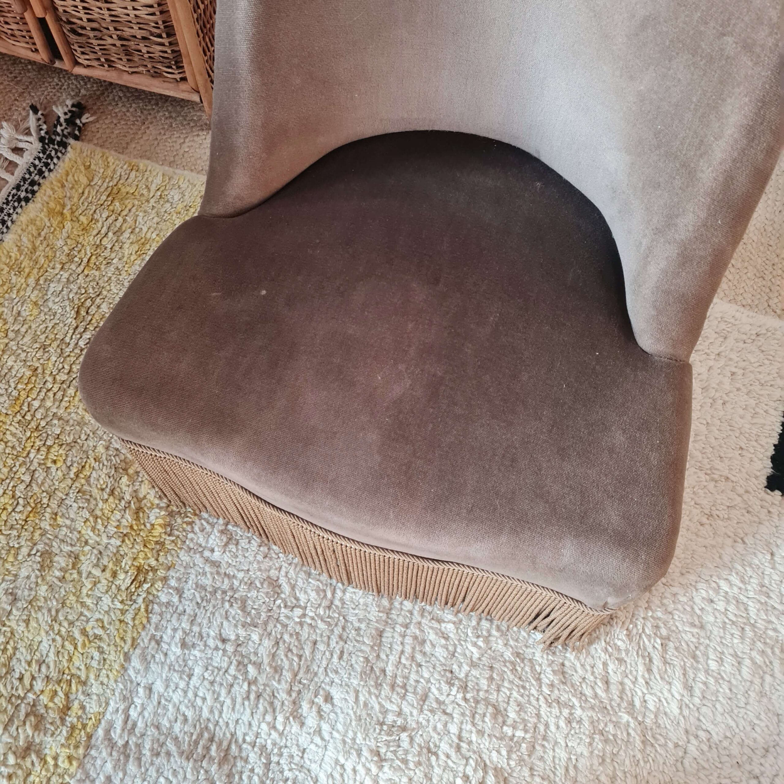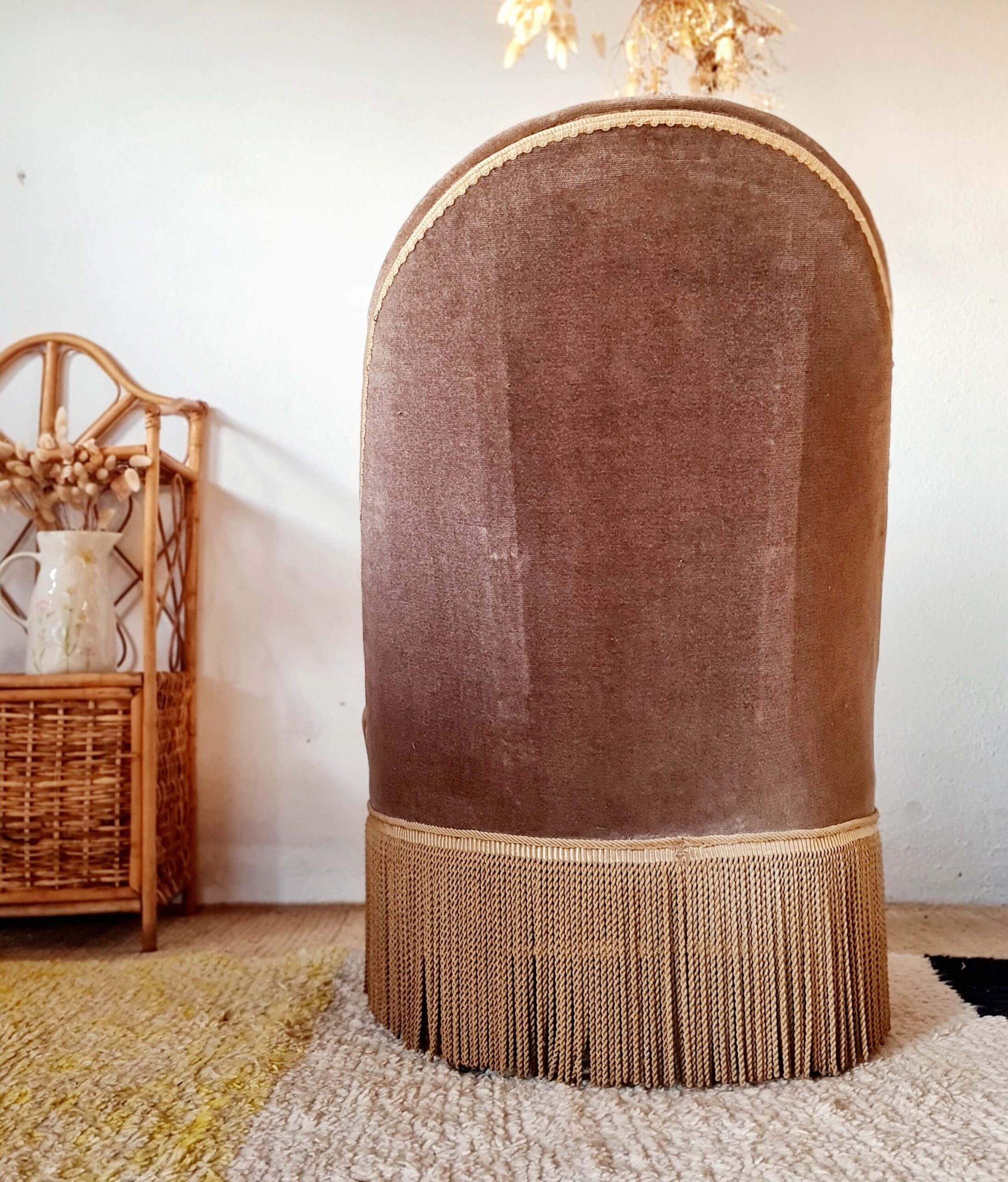 L’assise est confortable, habillée d’un tissu velours brun sobre, rehaussée d’une frange décorative contrastante avec subtilité.