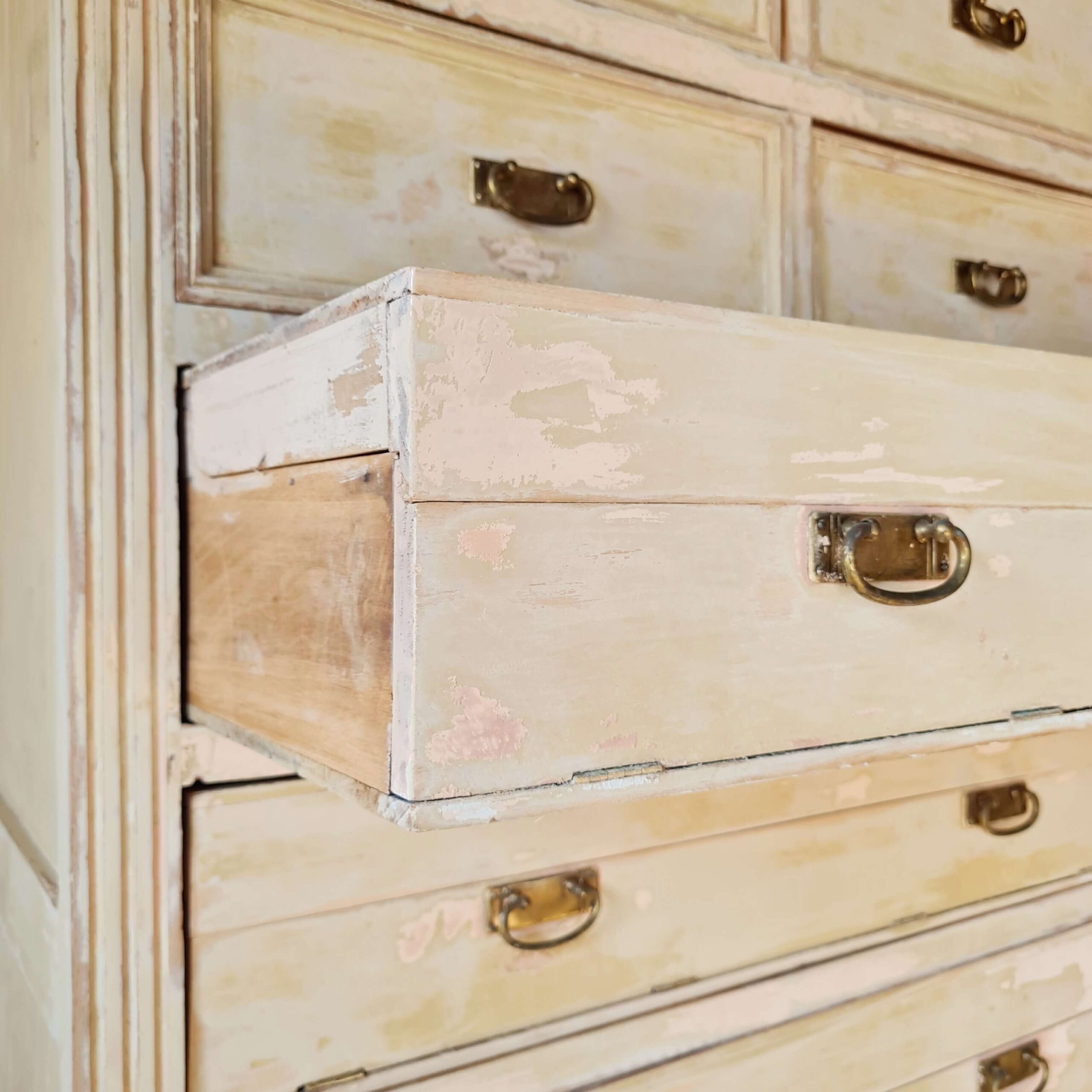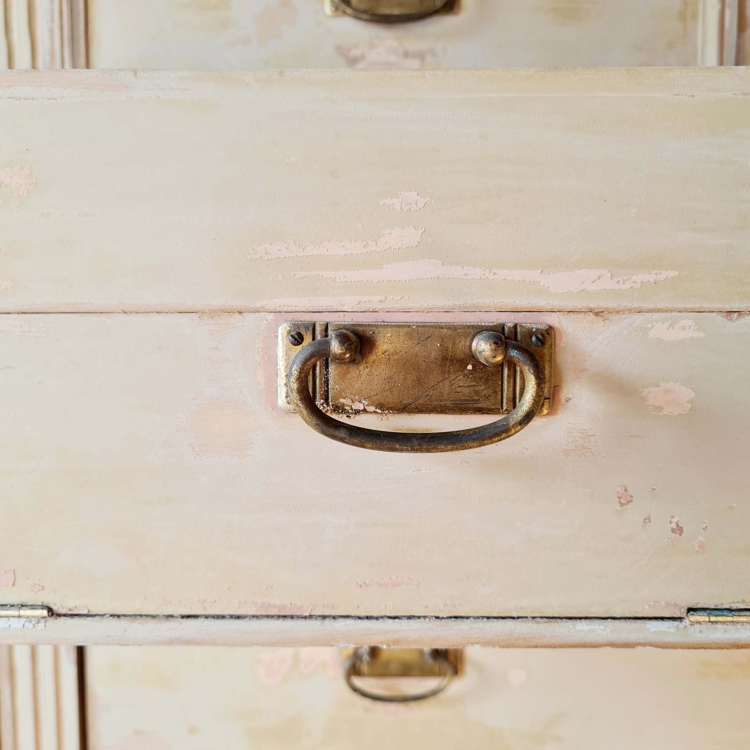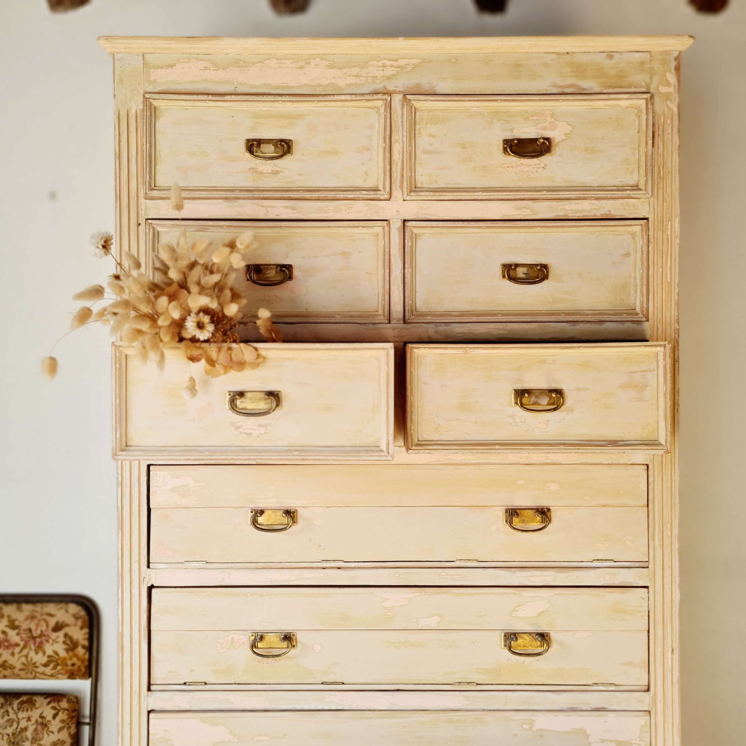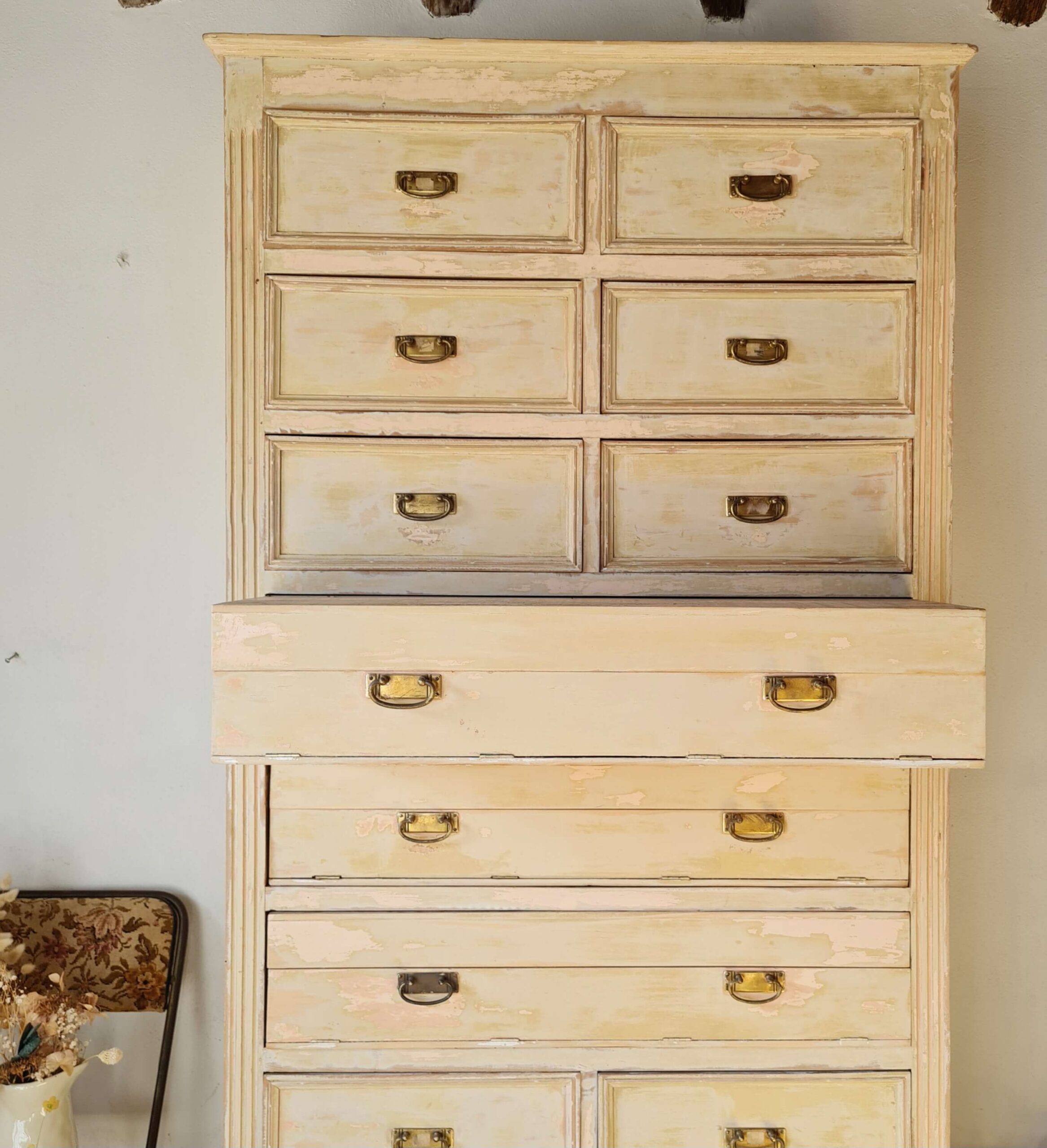 Cet ancien meuble de métier fut entièrement dépoussiéré, nettoyé, décapé et poncé pour ainsi acquérir ces couleurs douces.