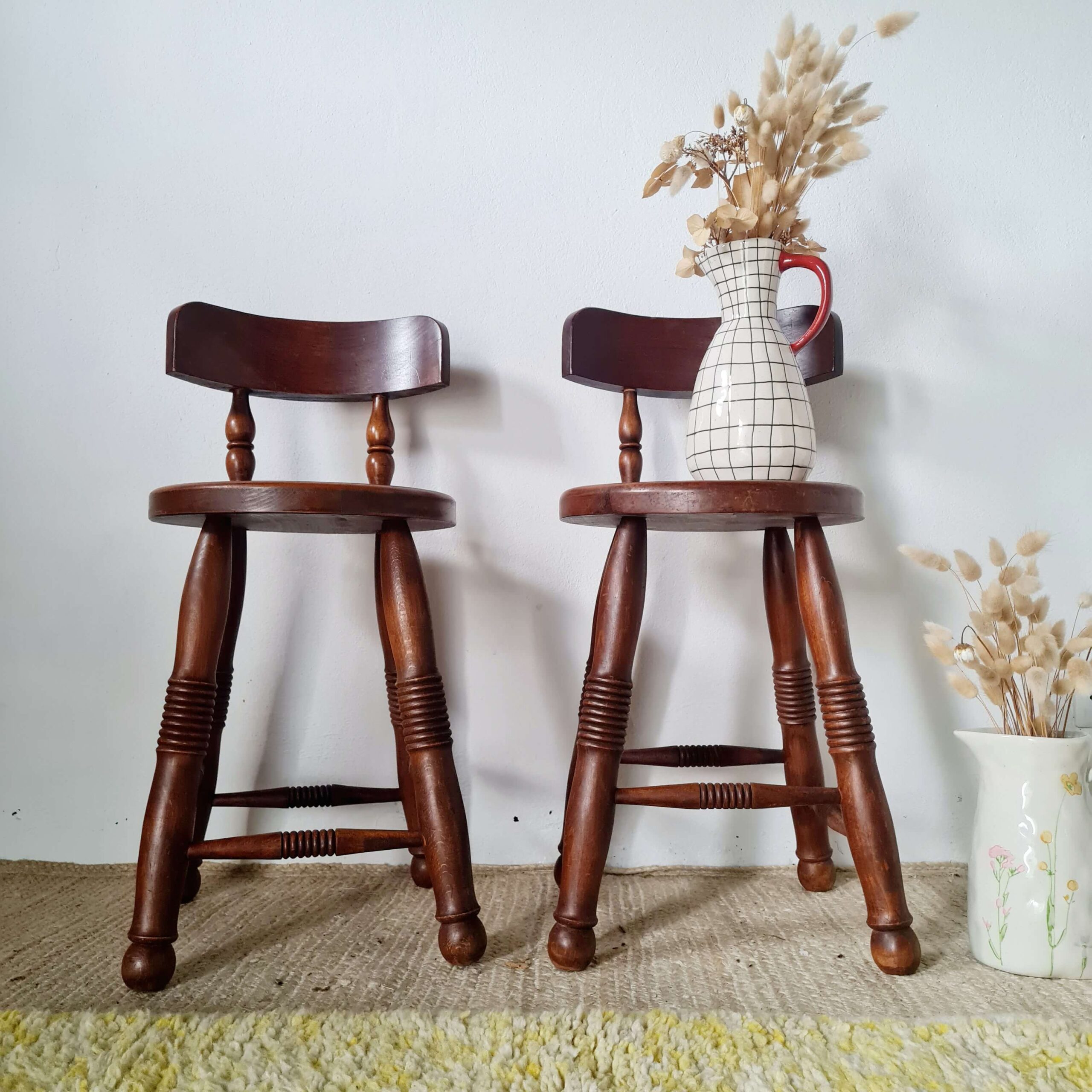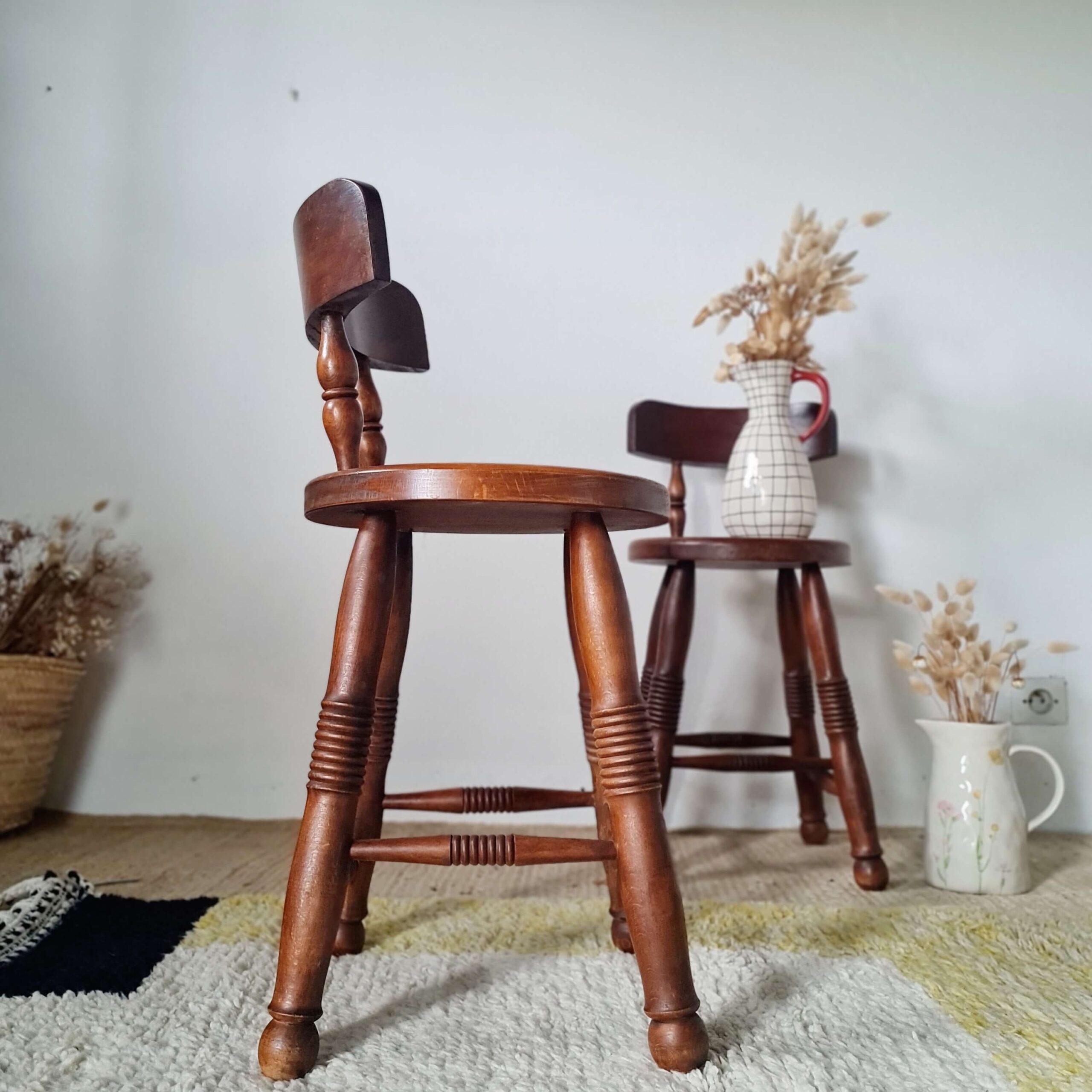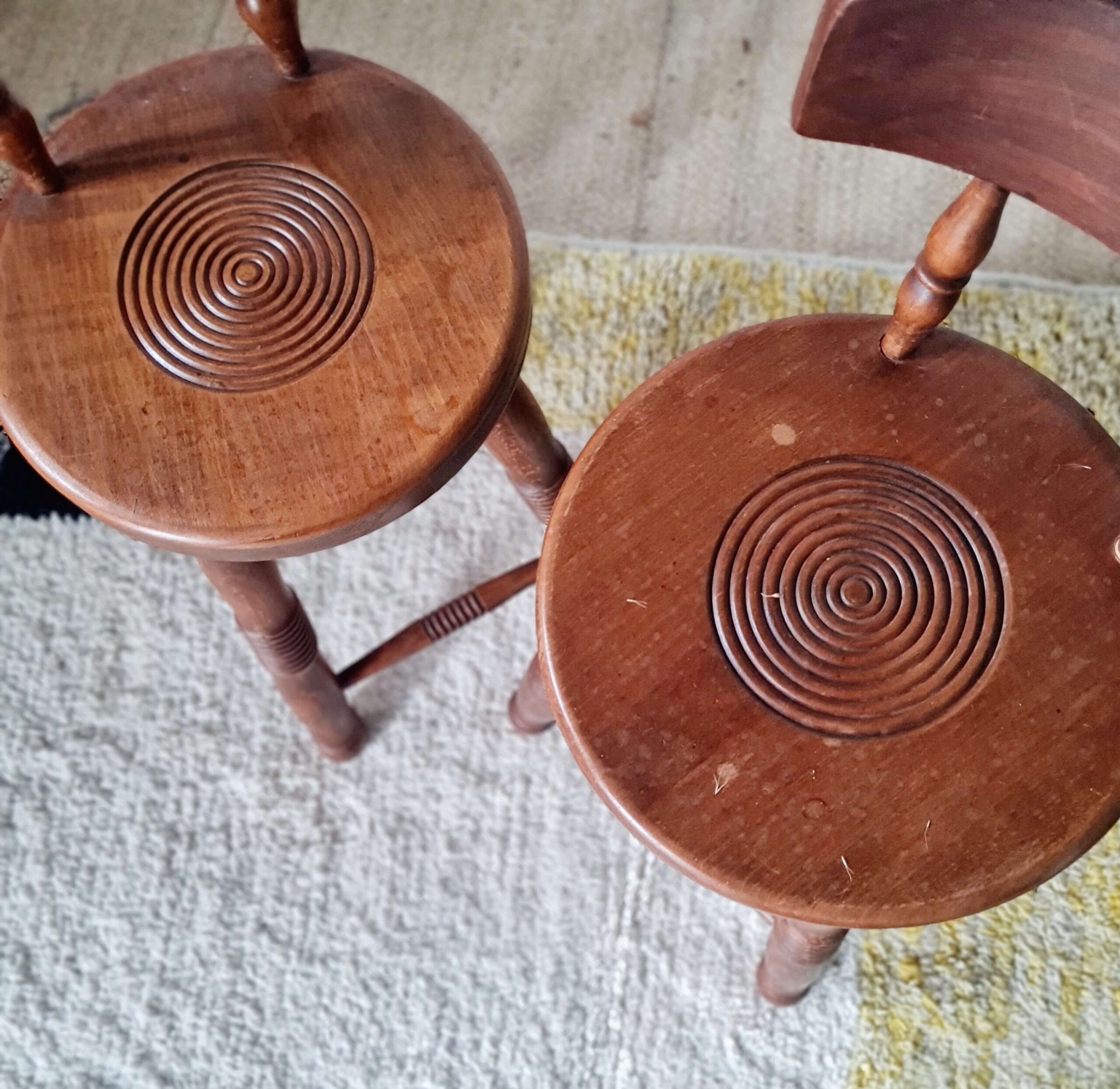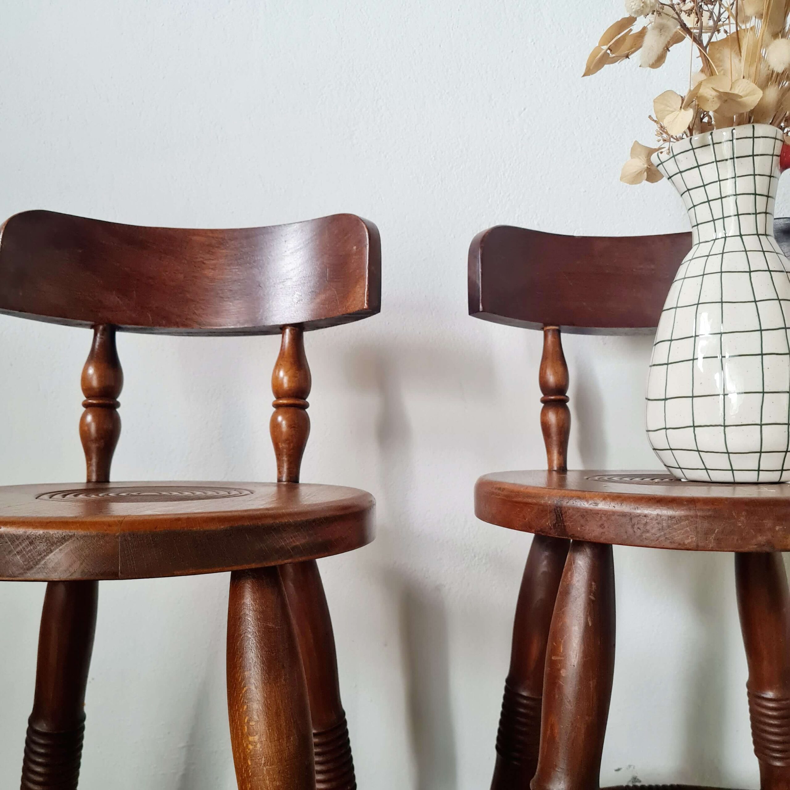 Tout en chêne, cette paire de chaises en chêne d’art populaire date du milieu du siècle dernier.
