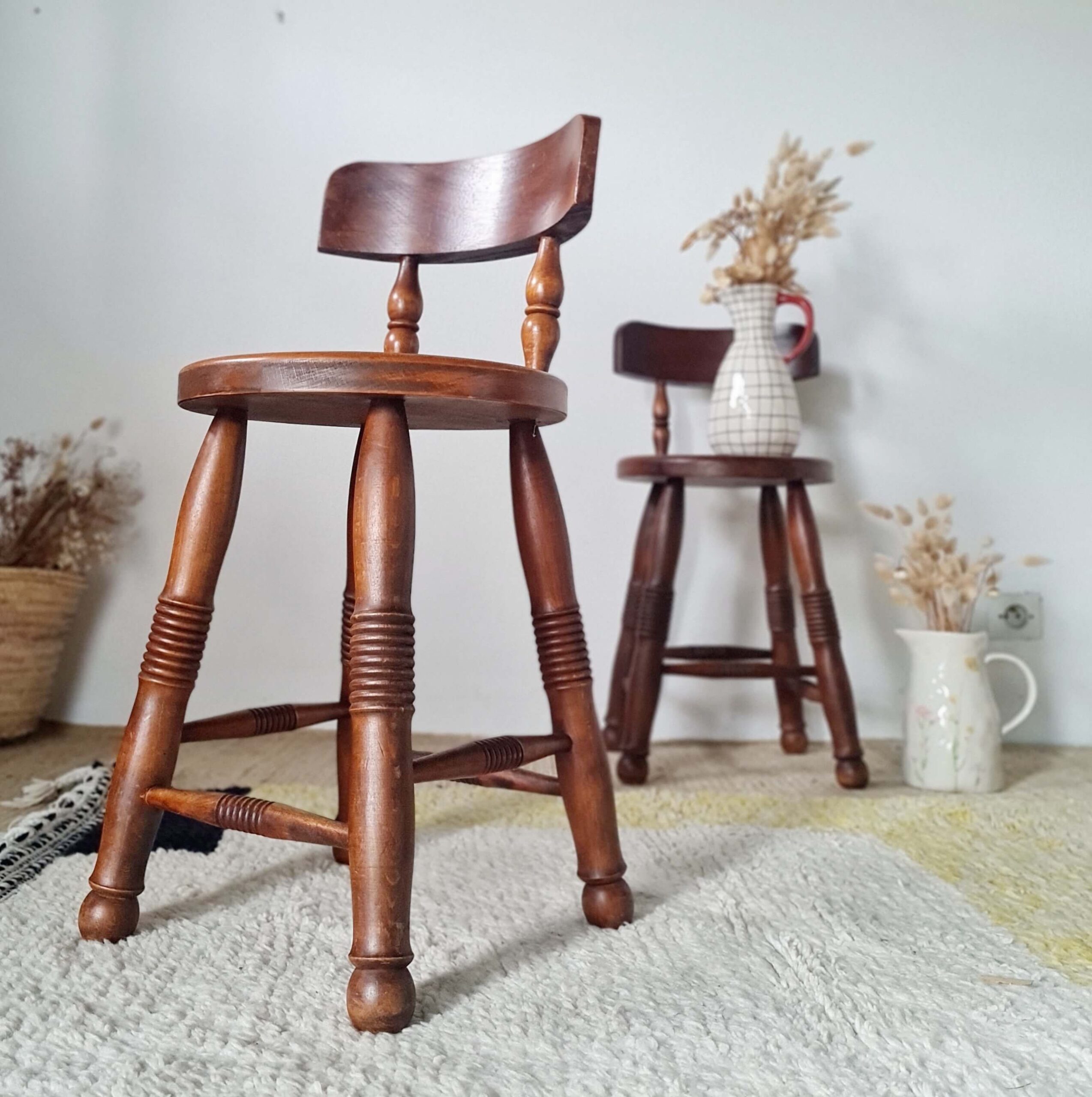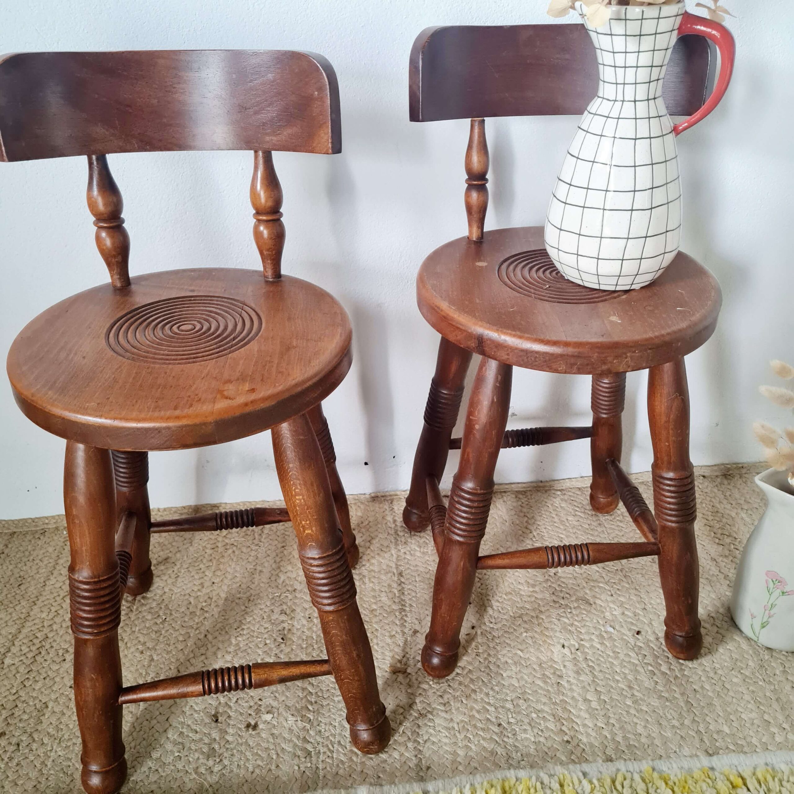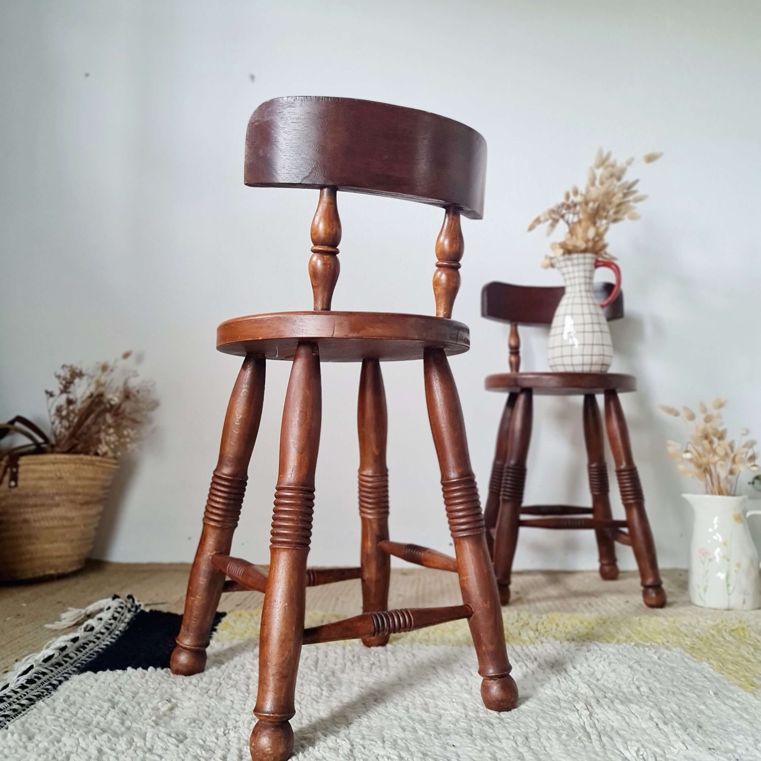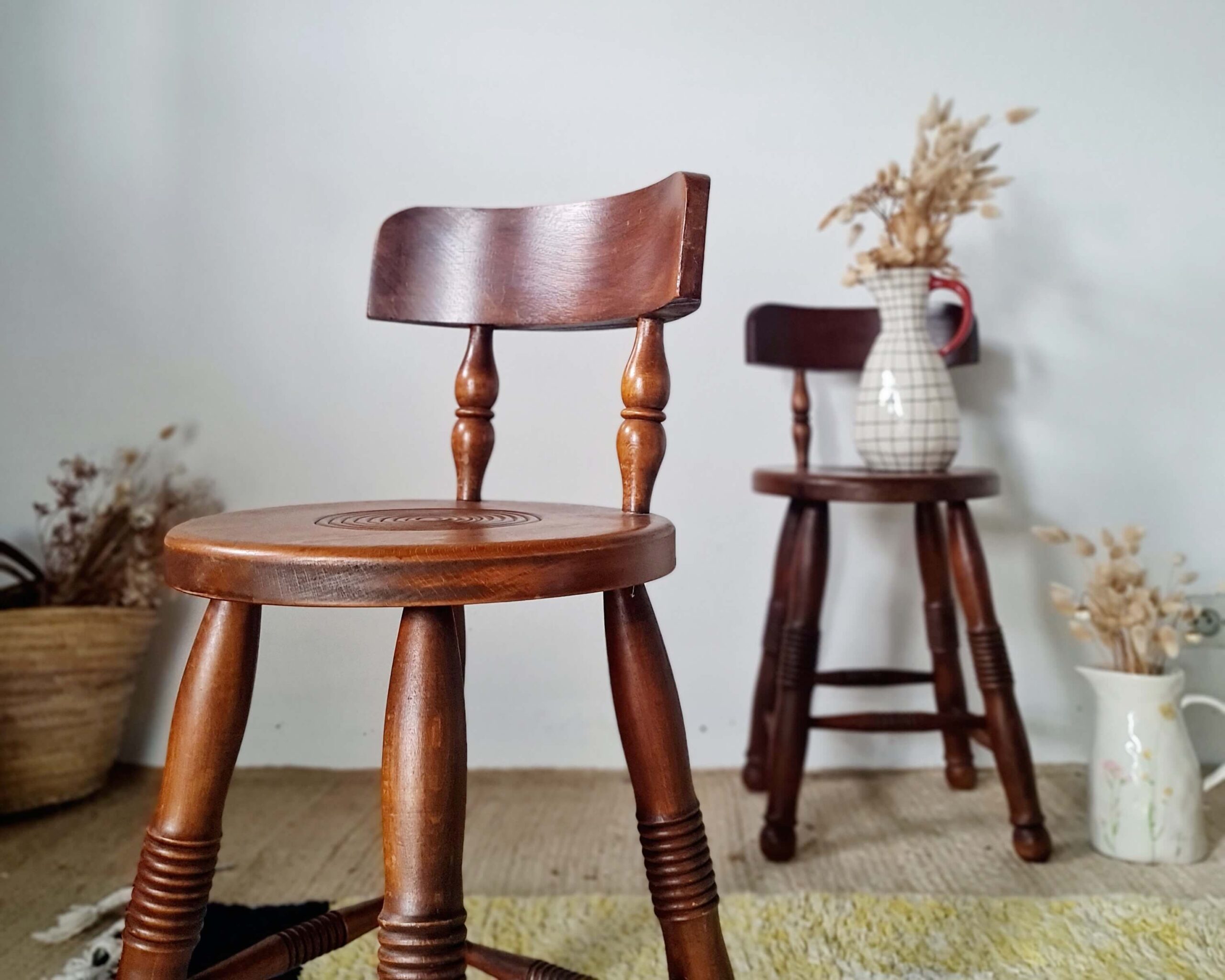 Tout en chêne, cette paire de chaises en chêne d’art populaire date du milieu du siècle dernier.