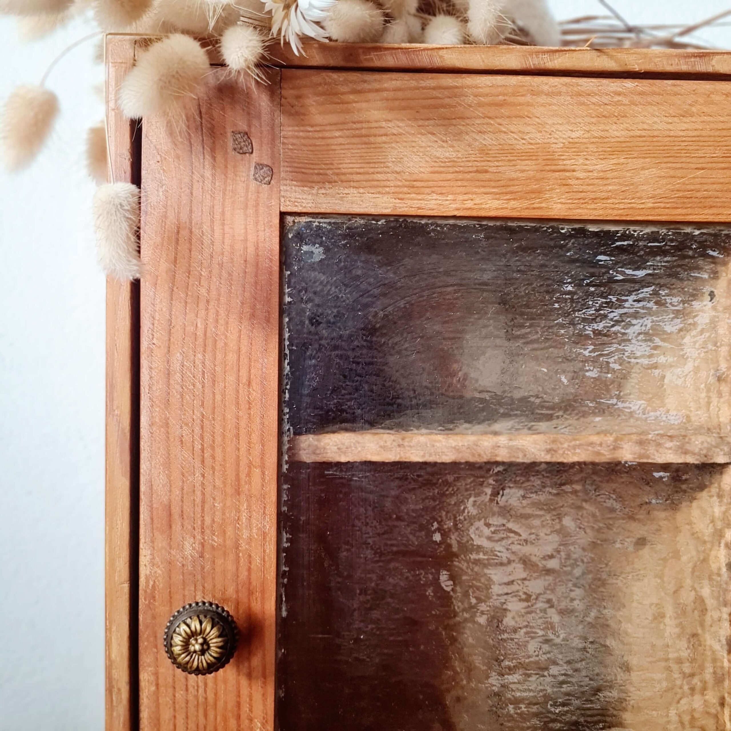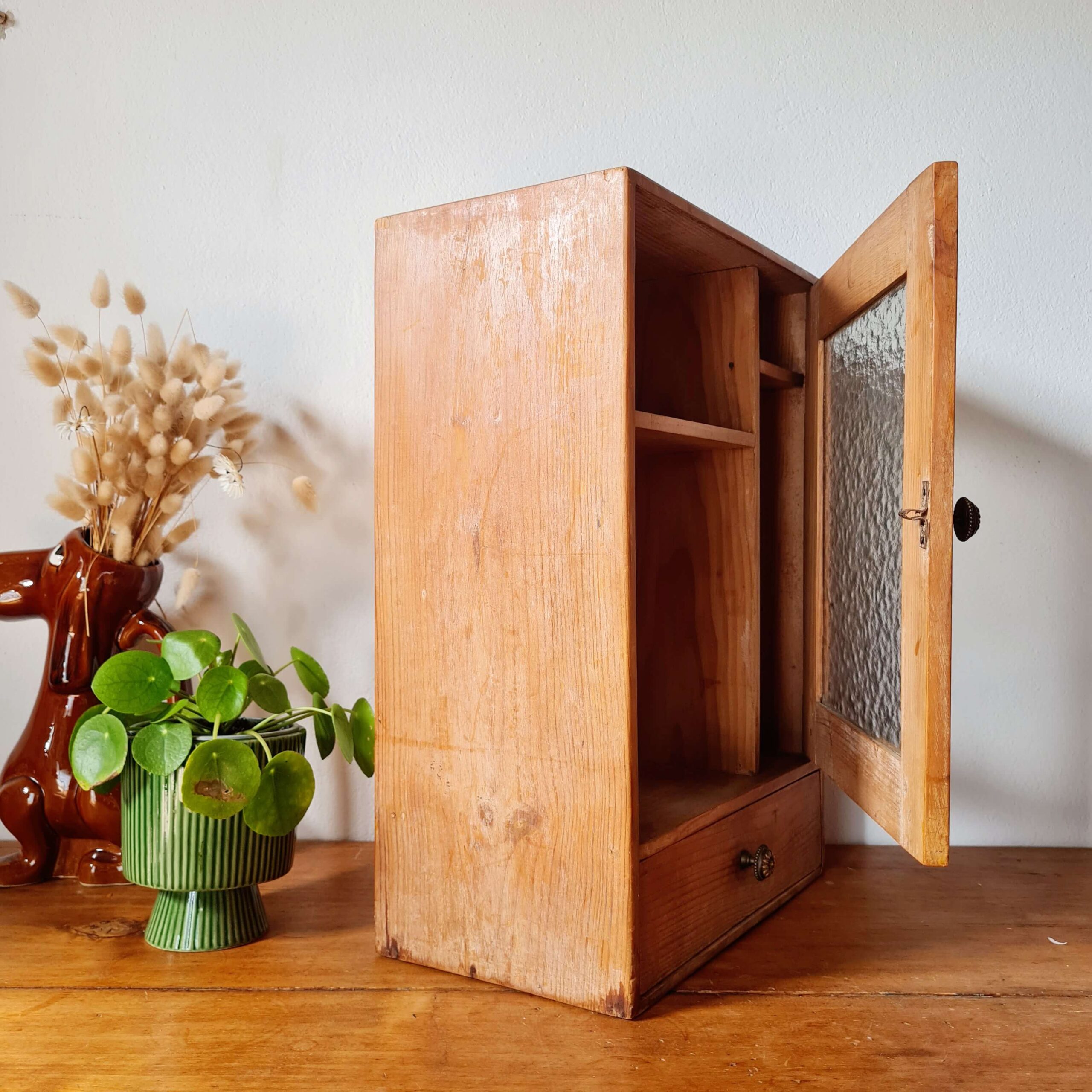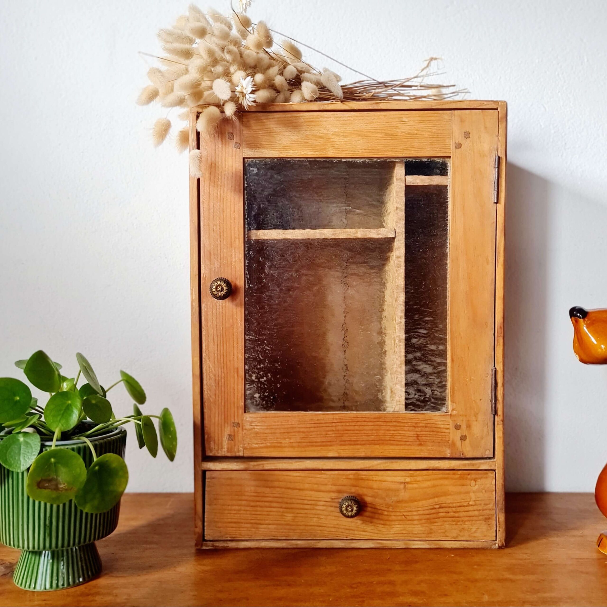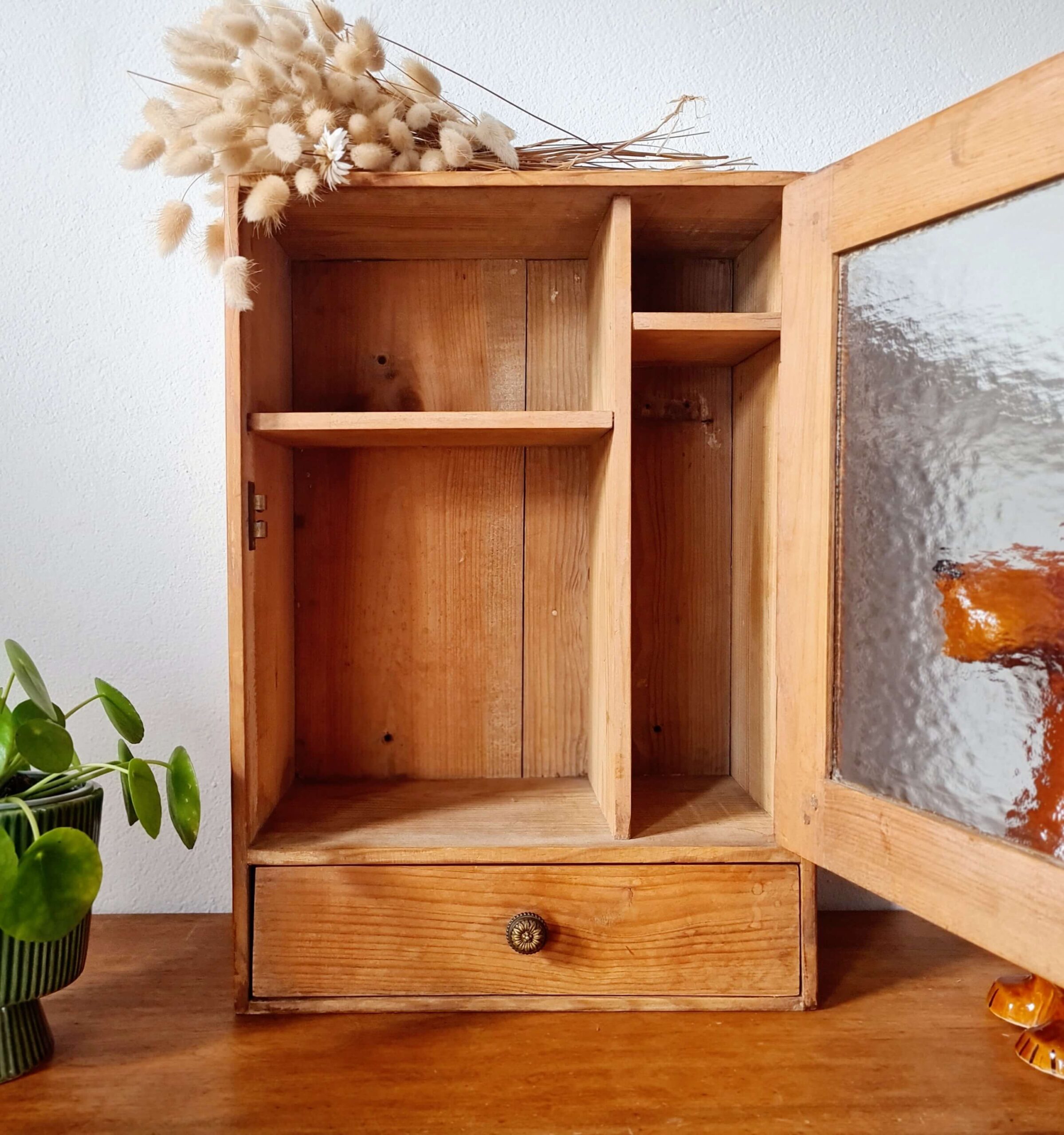 Cette armoirette ancienne se compose d’une porte vitrée avec un verre ancien texturé, laissant entrevoir un aménagement intérieur original à deux compartiments.