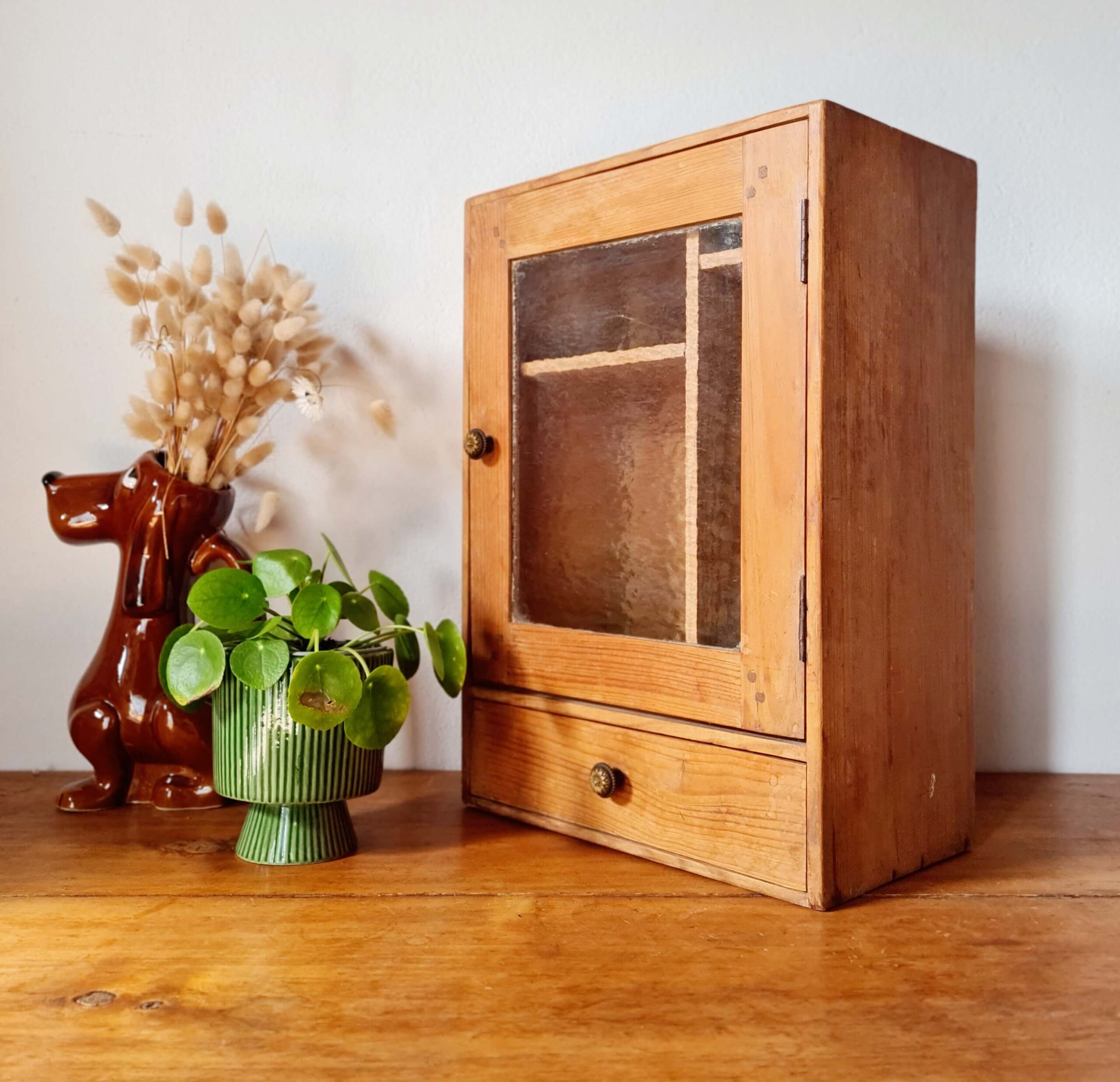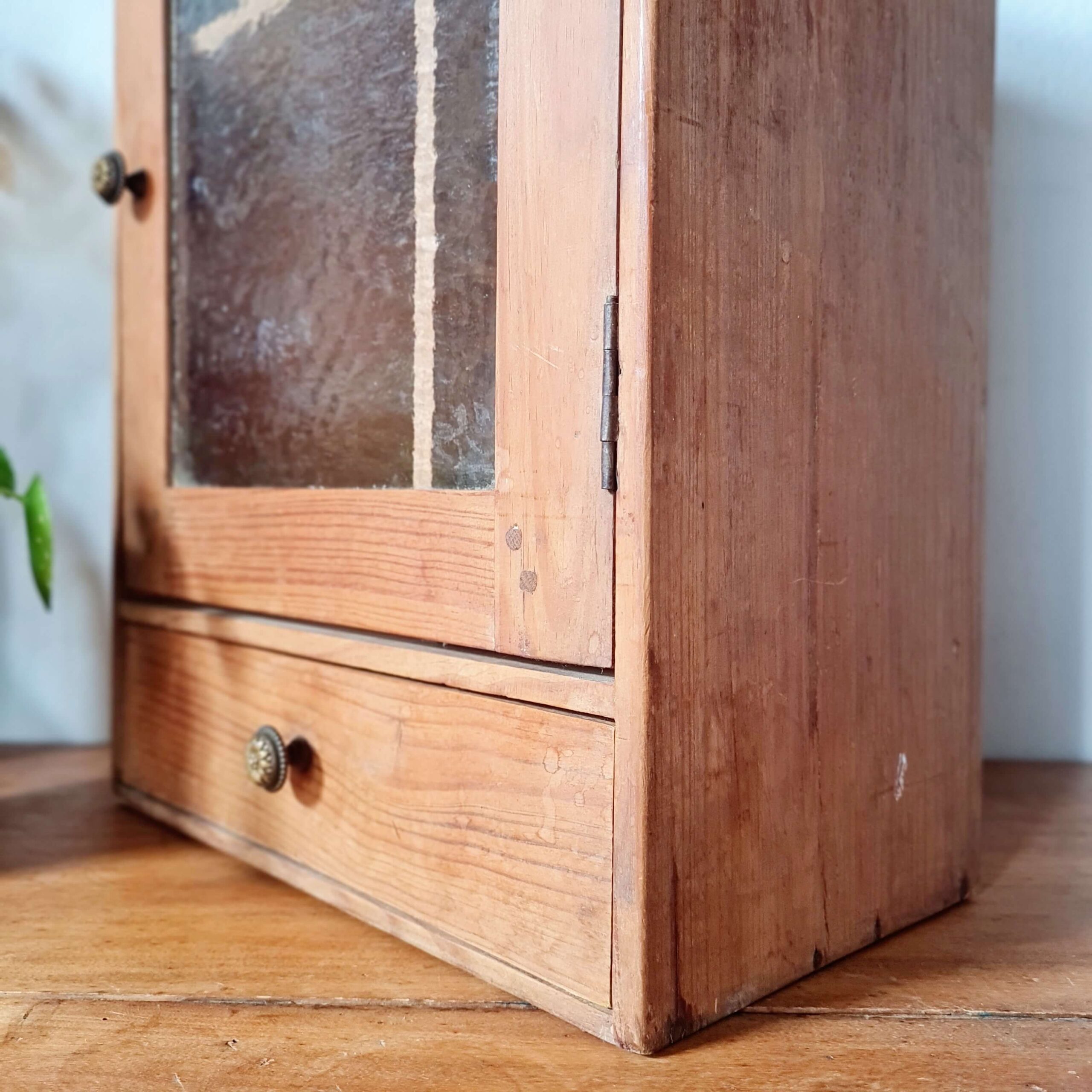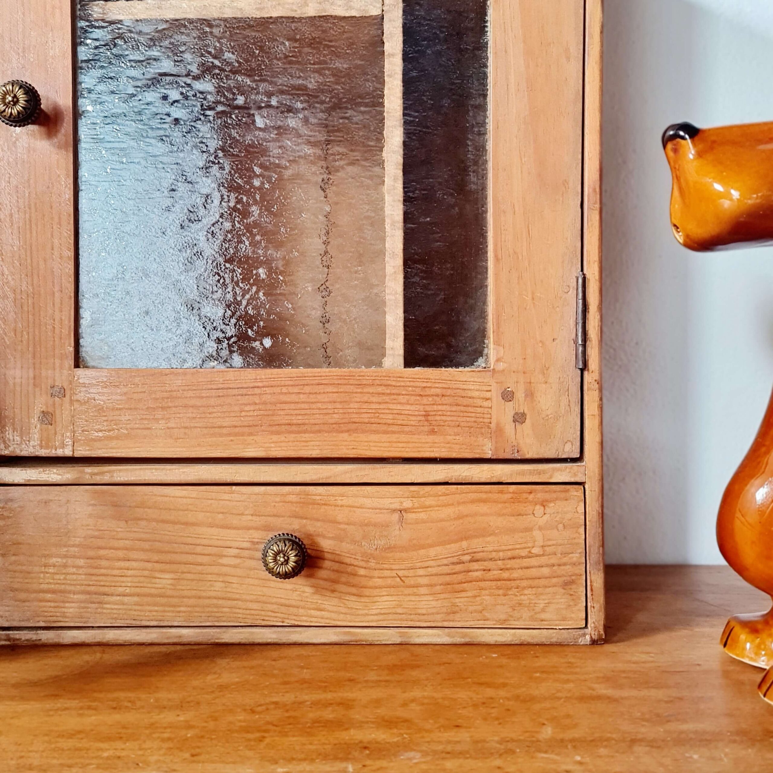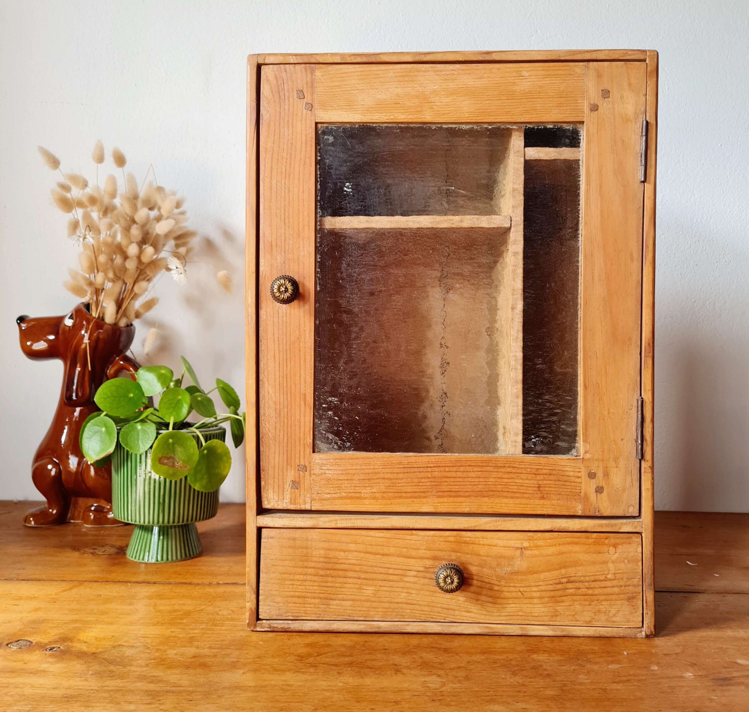 Cette armoirette ancienne se compose d’une porte vitrée avec un verre ancien texturé, laissant entrevoir un aménagement intérieur original à deux compartiments.
