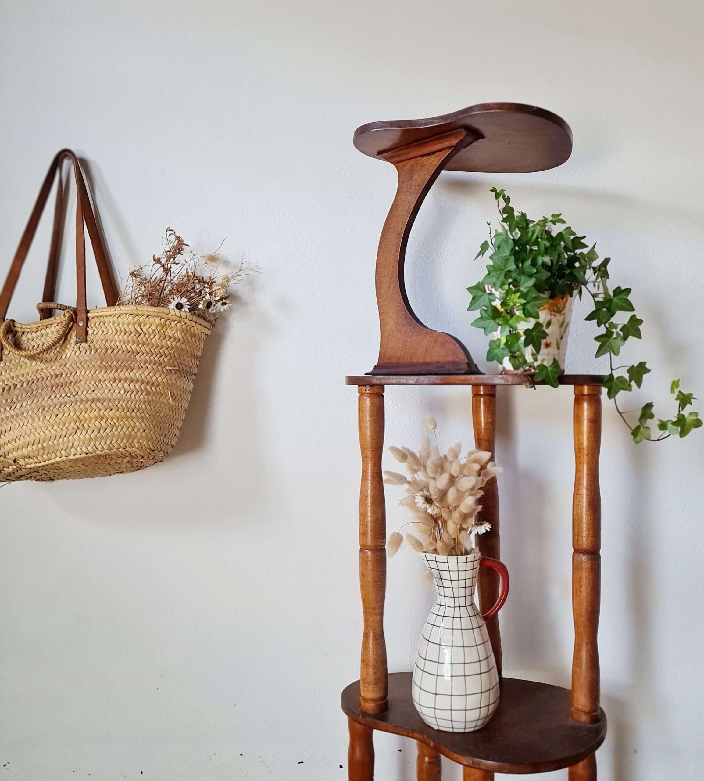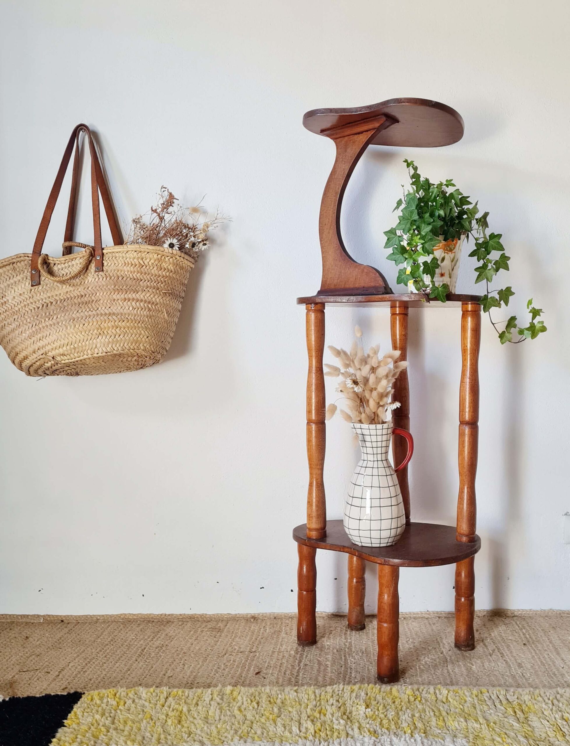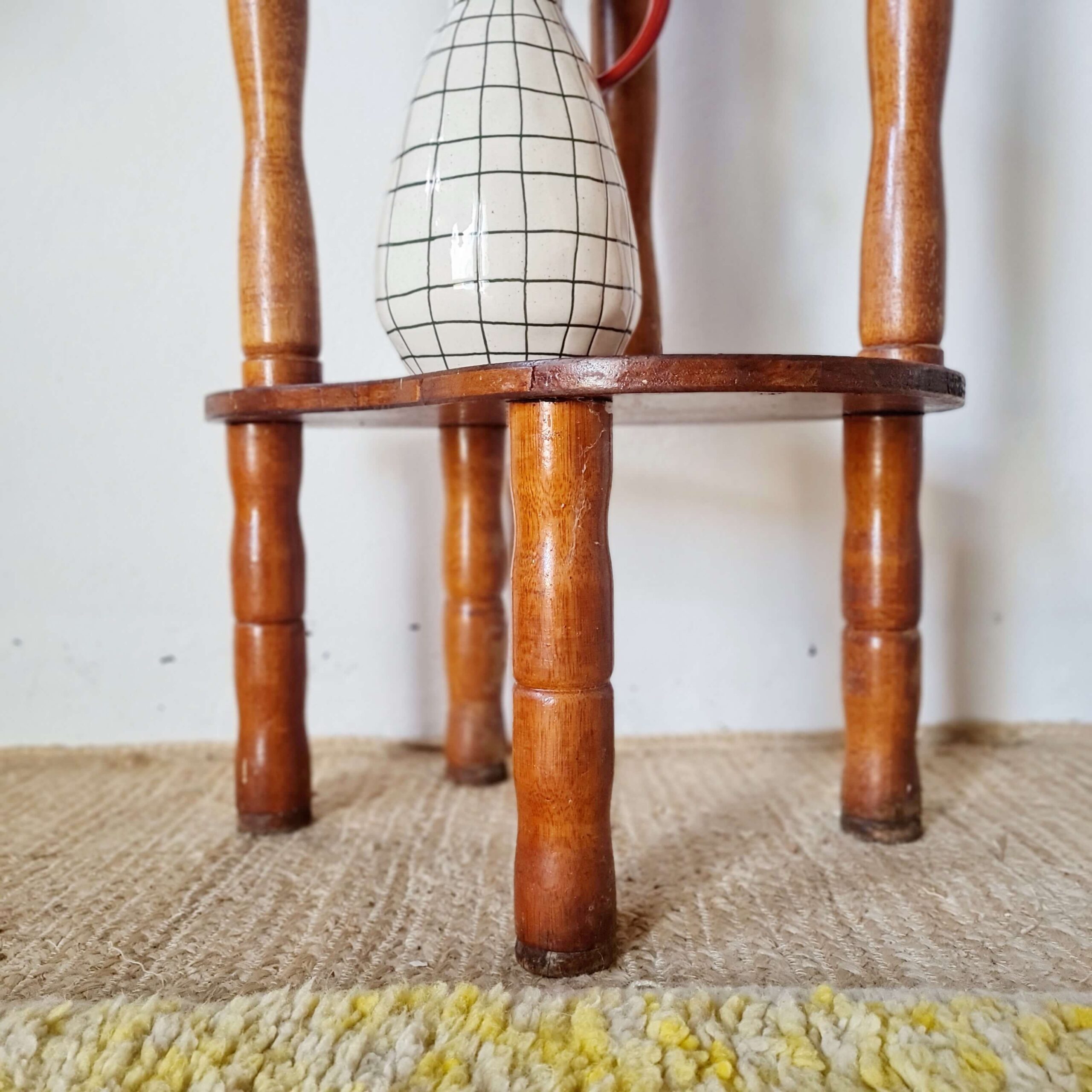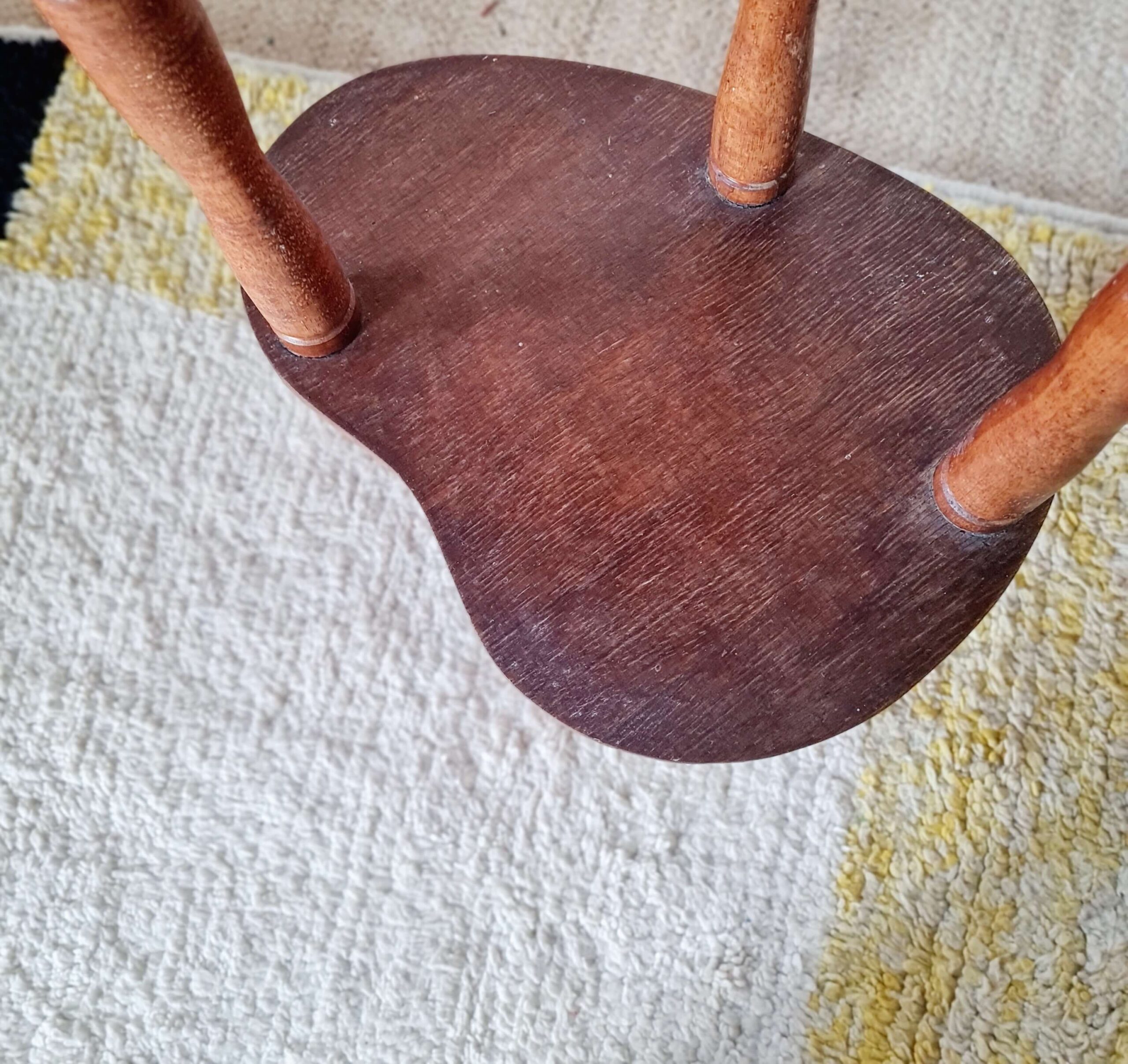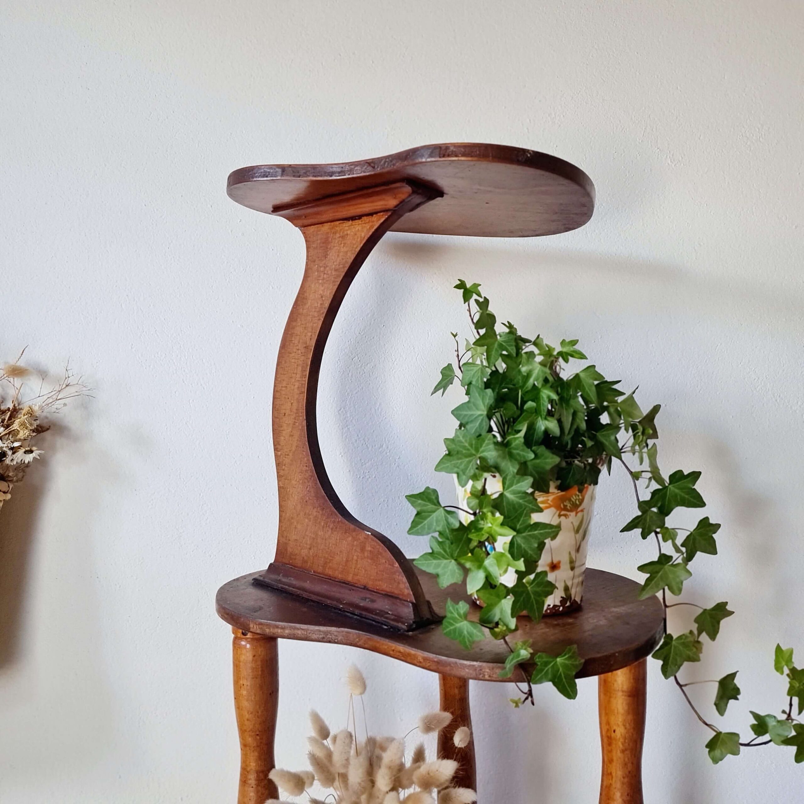 Ancienne, cette sellette reste en bel état avec une patine d’usage. Elle est réalisée en bois et contreplaqué de bois teinté.