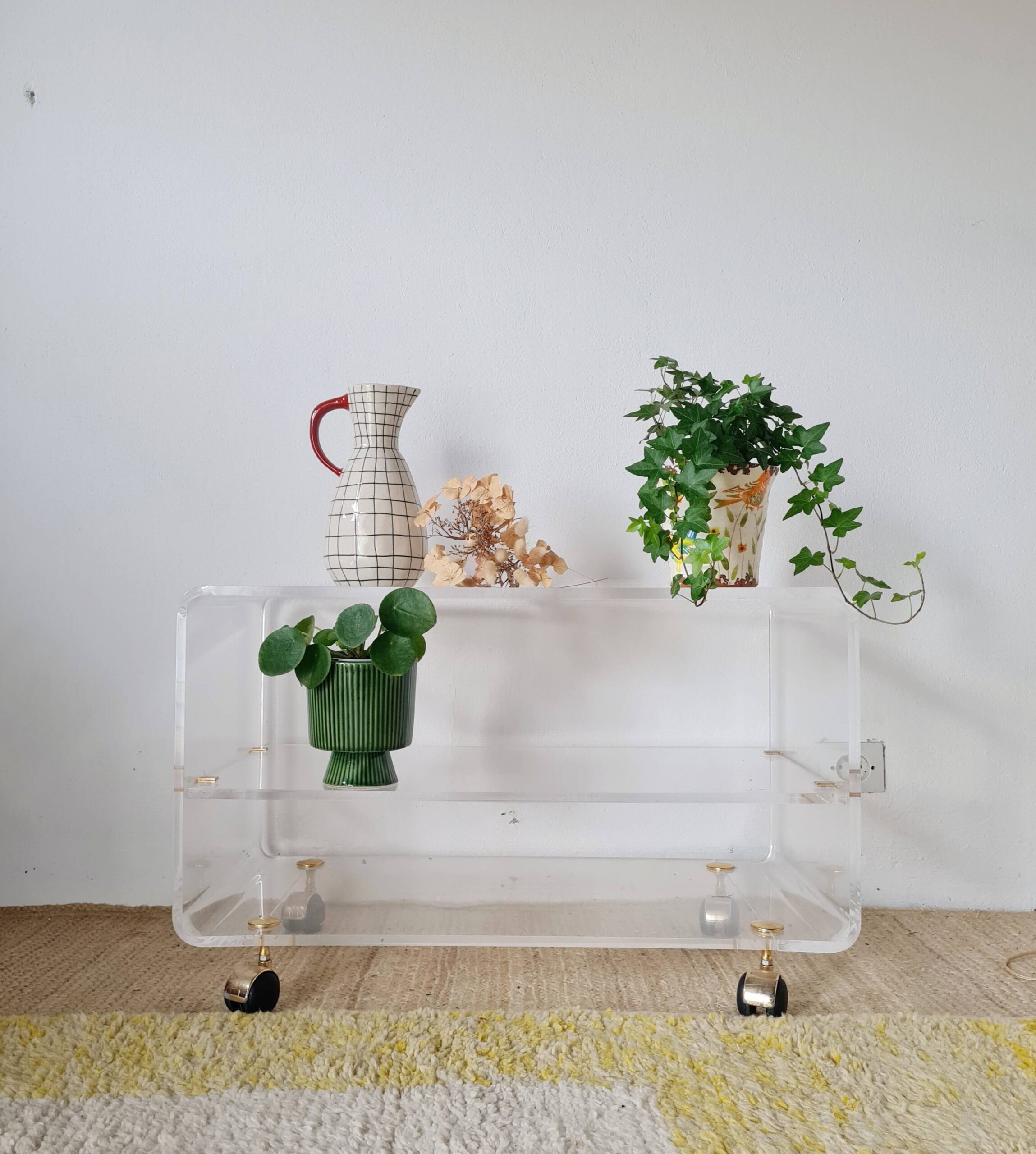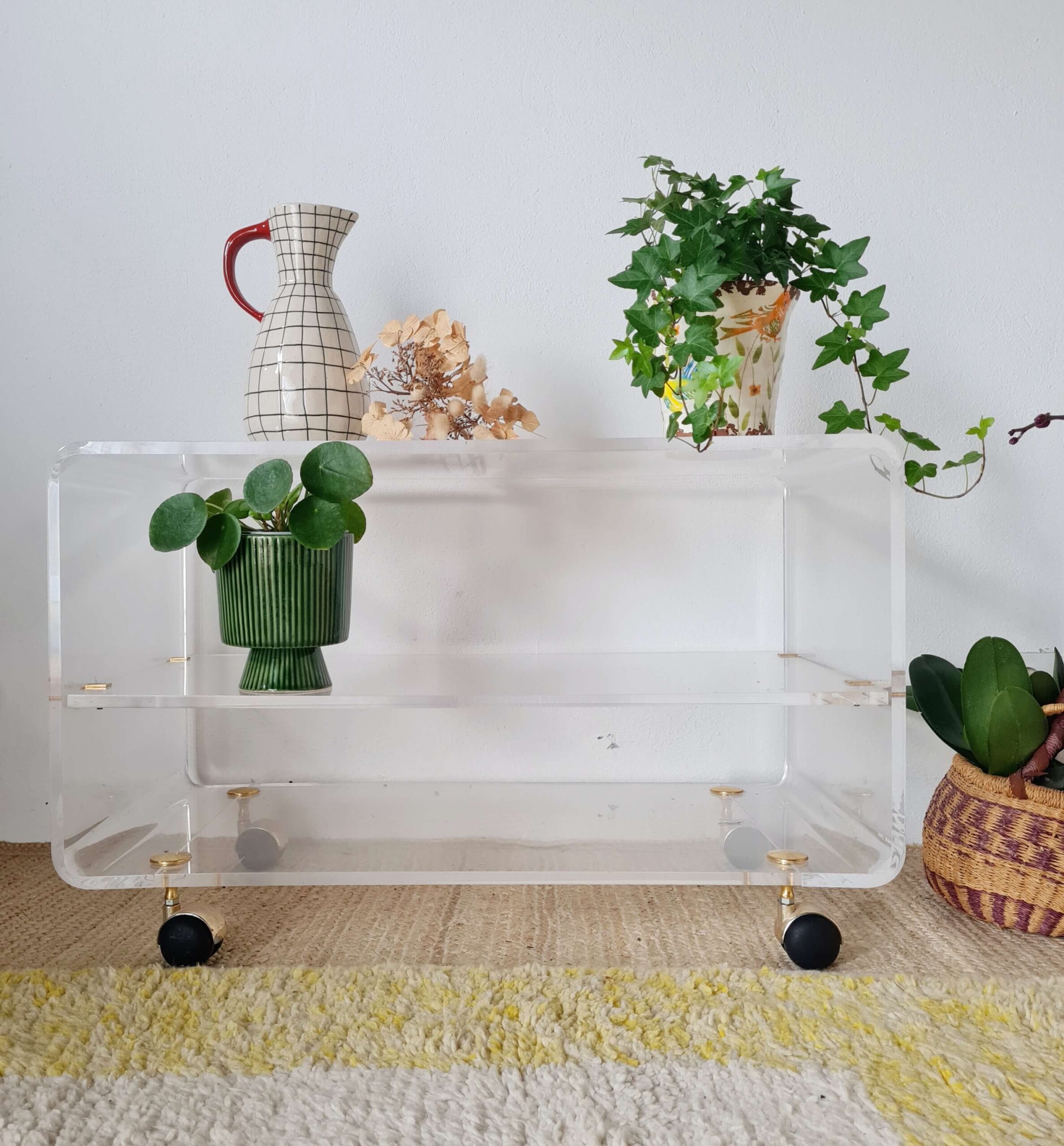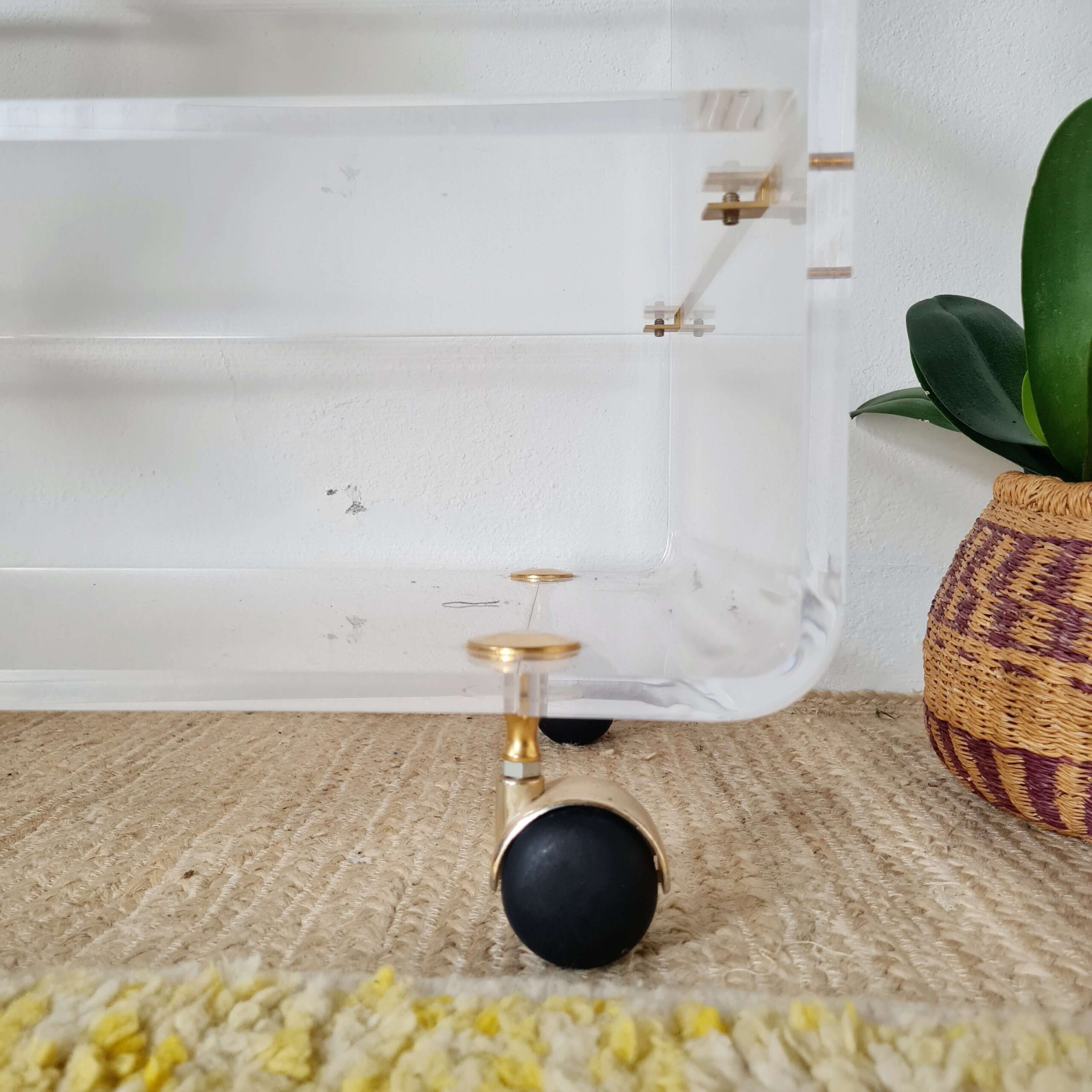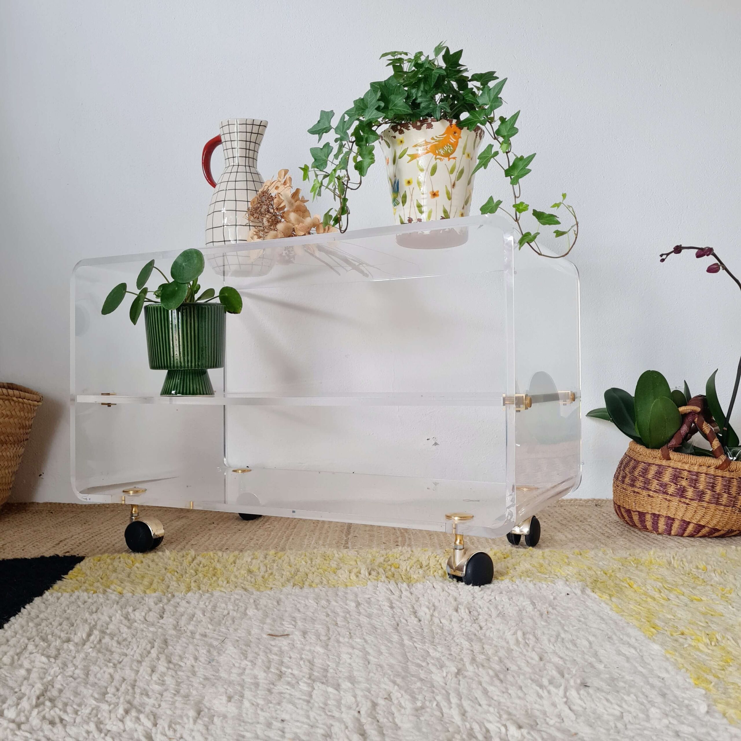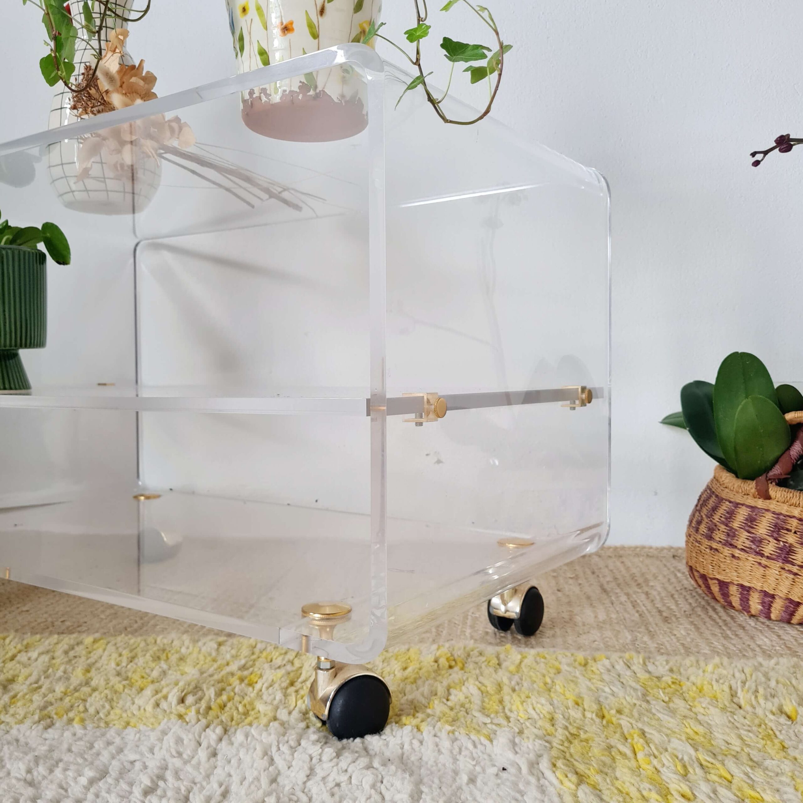 Elle date des années 70. La structure est fabriquée en en Altuglas, les roulettes sont en laiton.