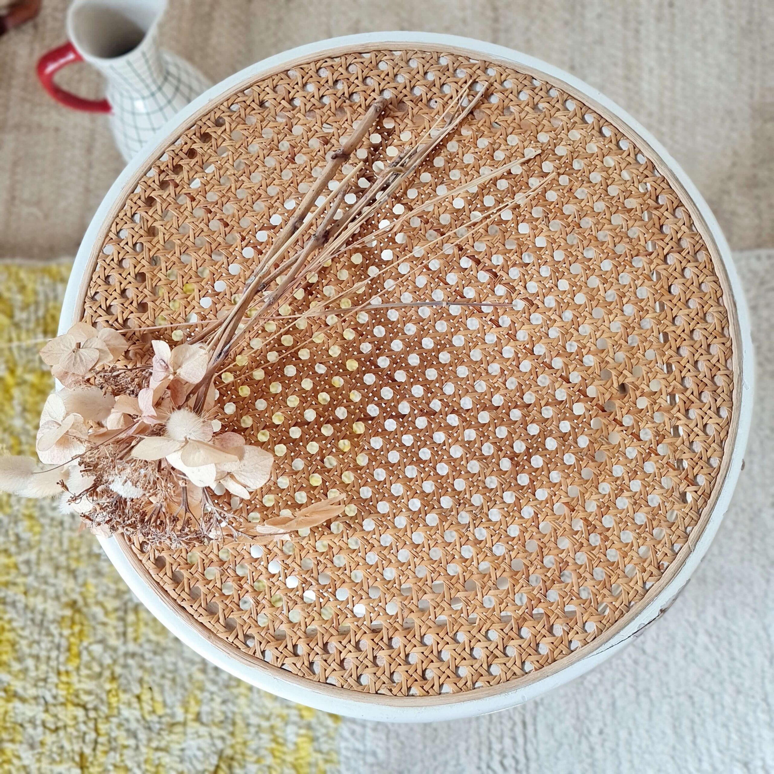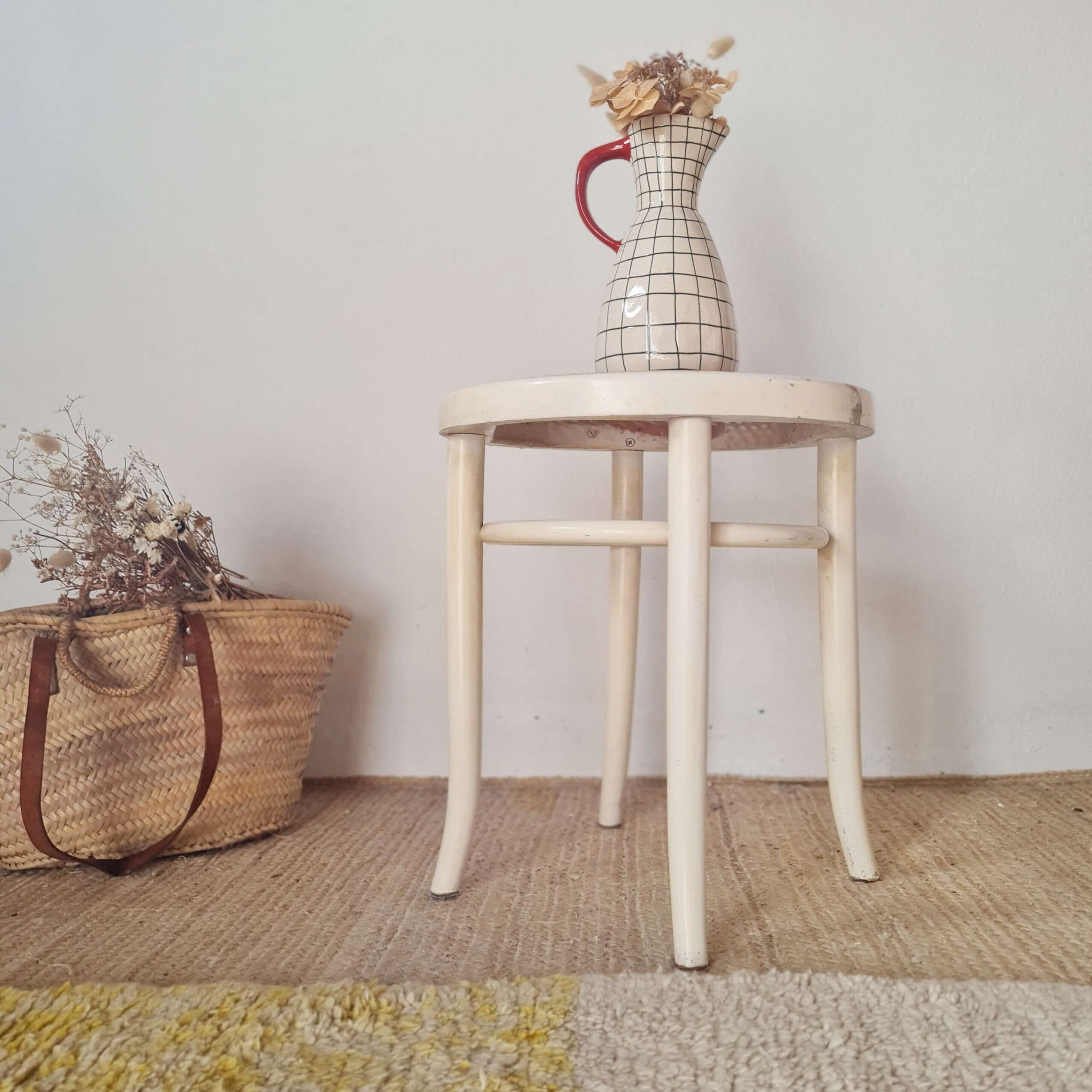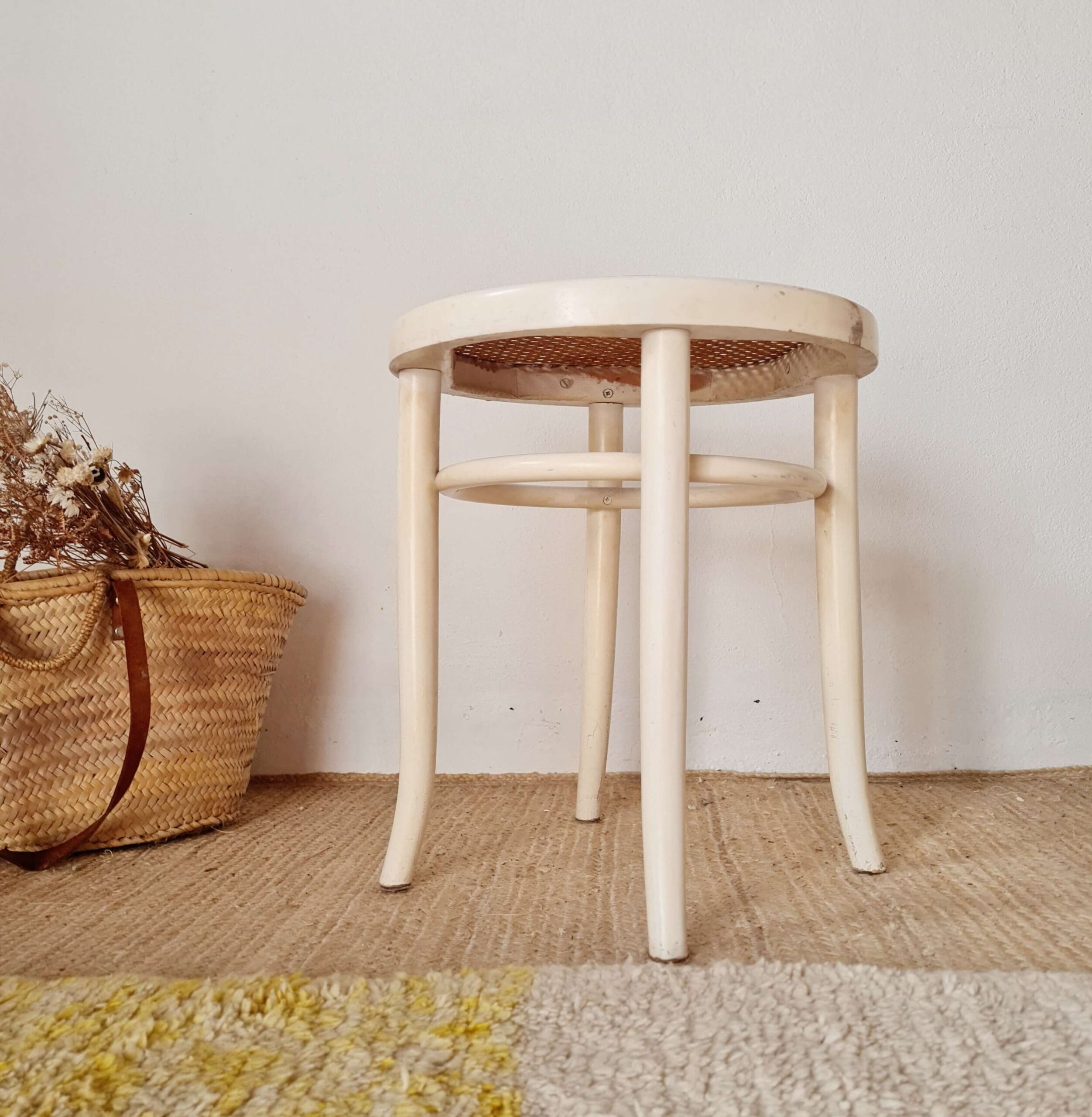 Cet ancien tabouret est en bois plié, laqué blanc crème et son assise est en cannage.