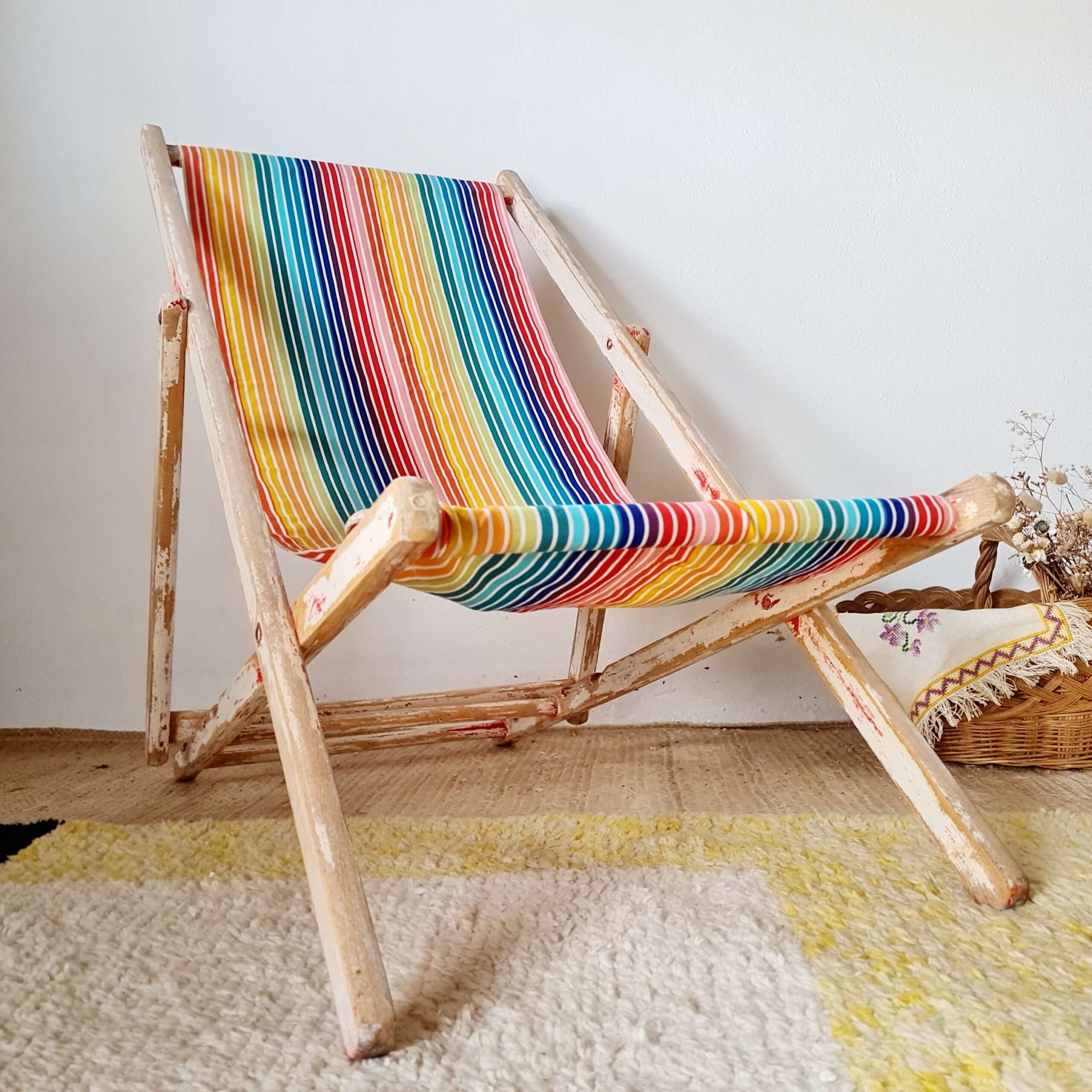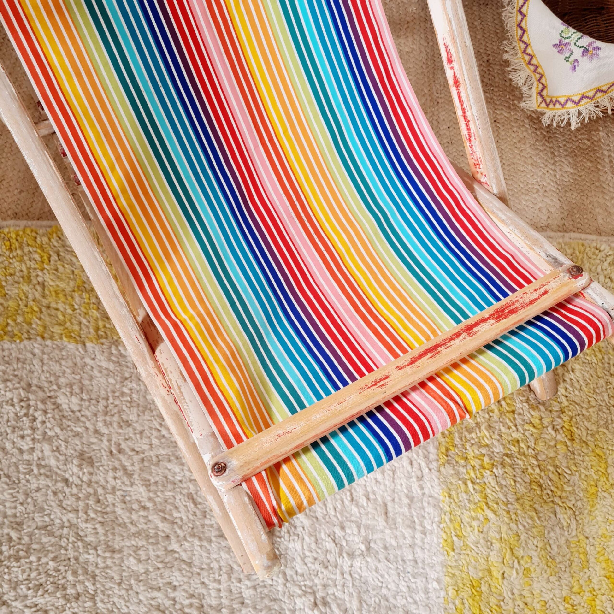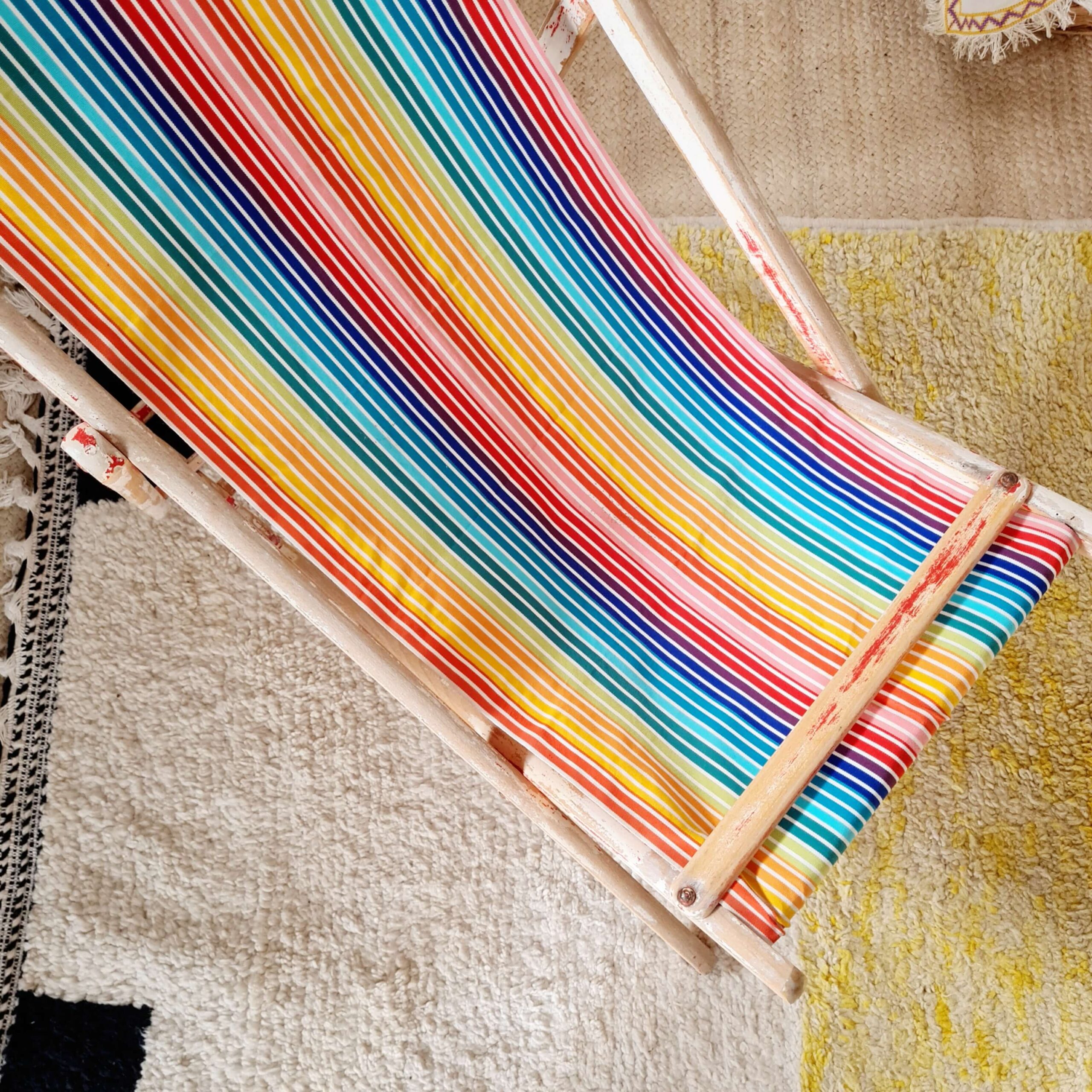 Cette ancienne chaise longue s’est parée d’une nouvelle toile à transat à larges rayures multicolores,