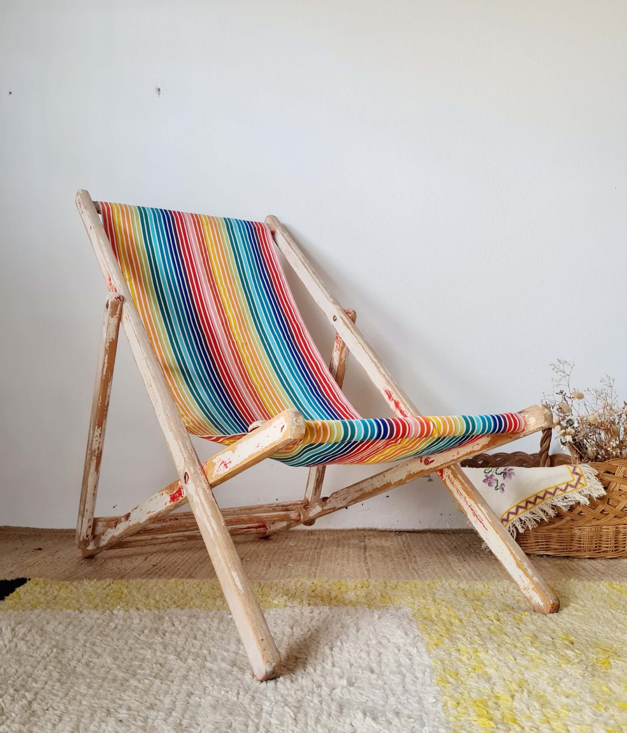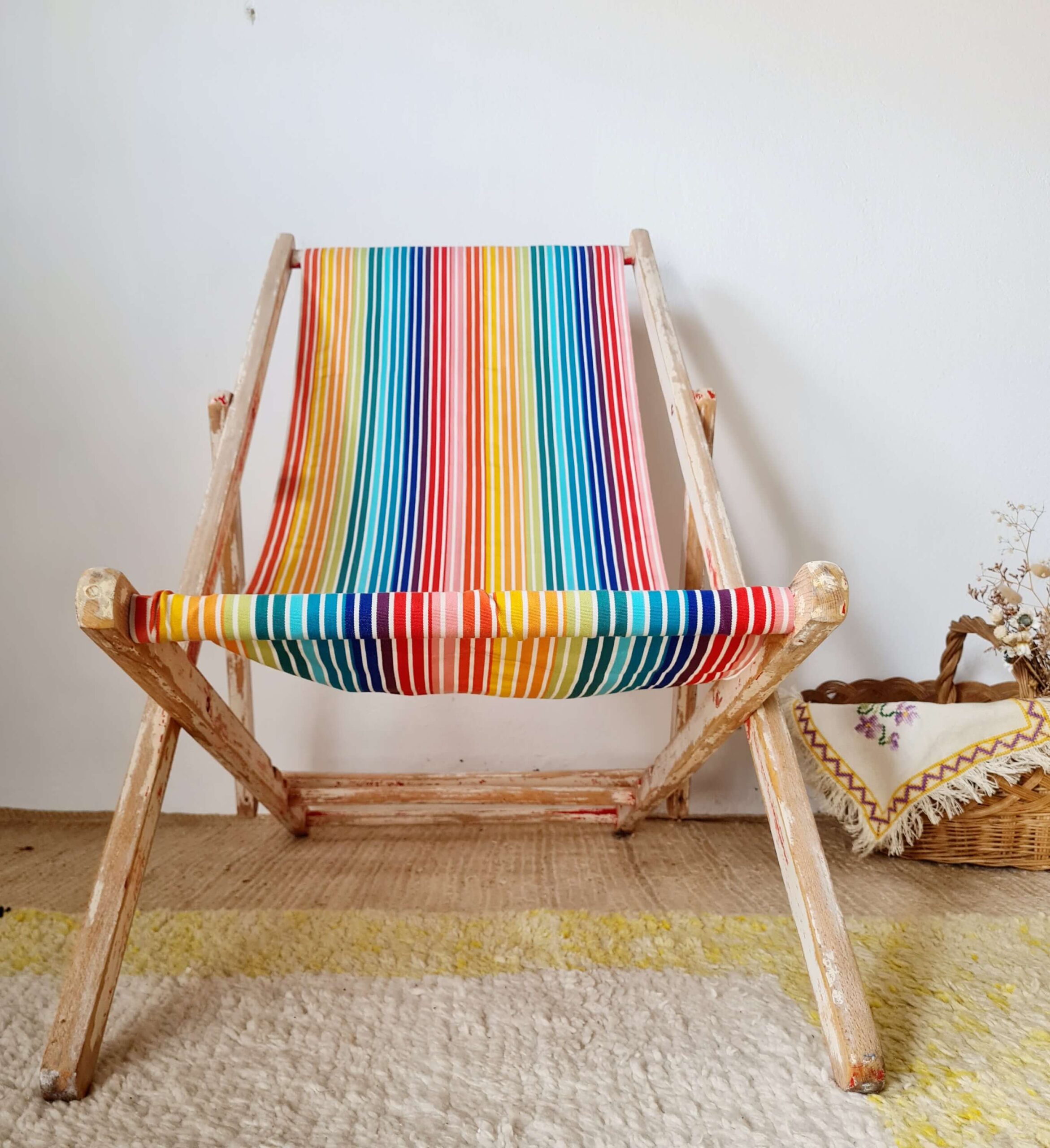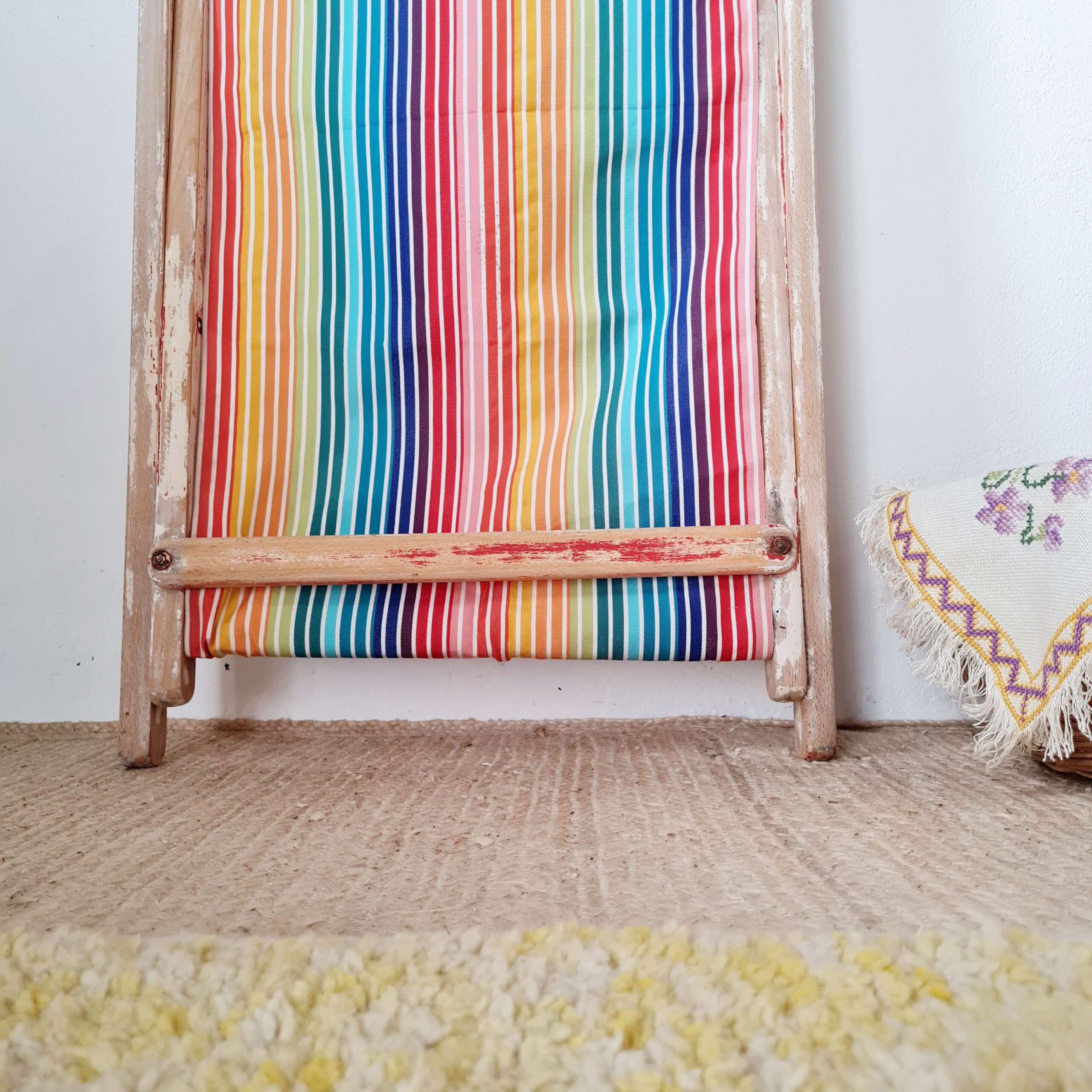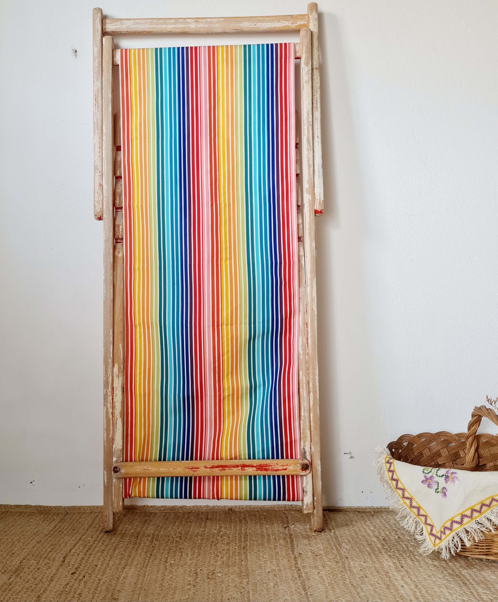 Cette ancienne chaise longue s’est parée d’une nouvelle toile à transat à larges rayures multicolores,