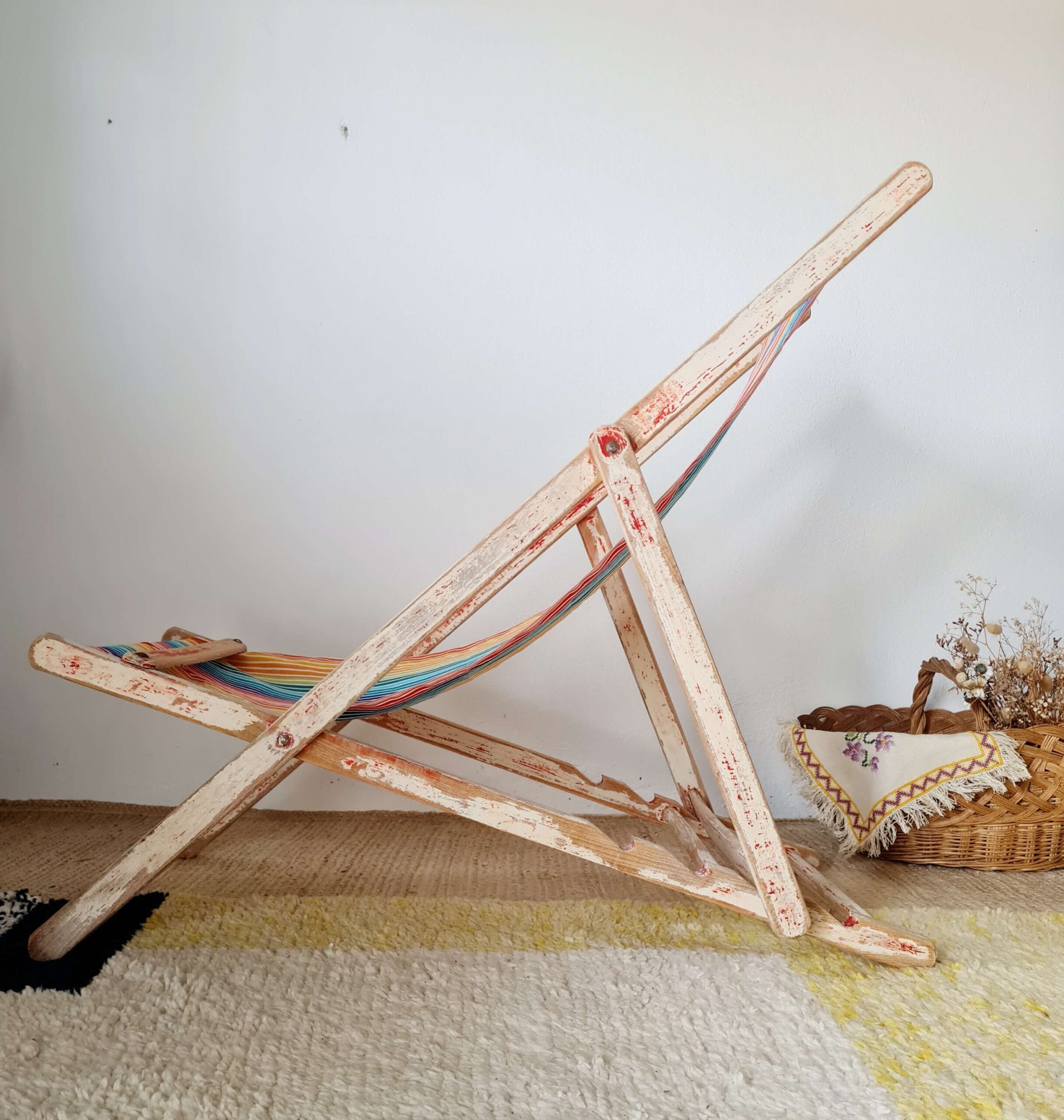 Cet ancien transat à rayures plie entièrement pour un gain de place et un rangement aisé.