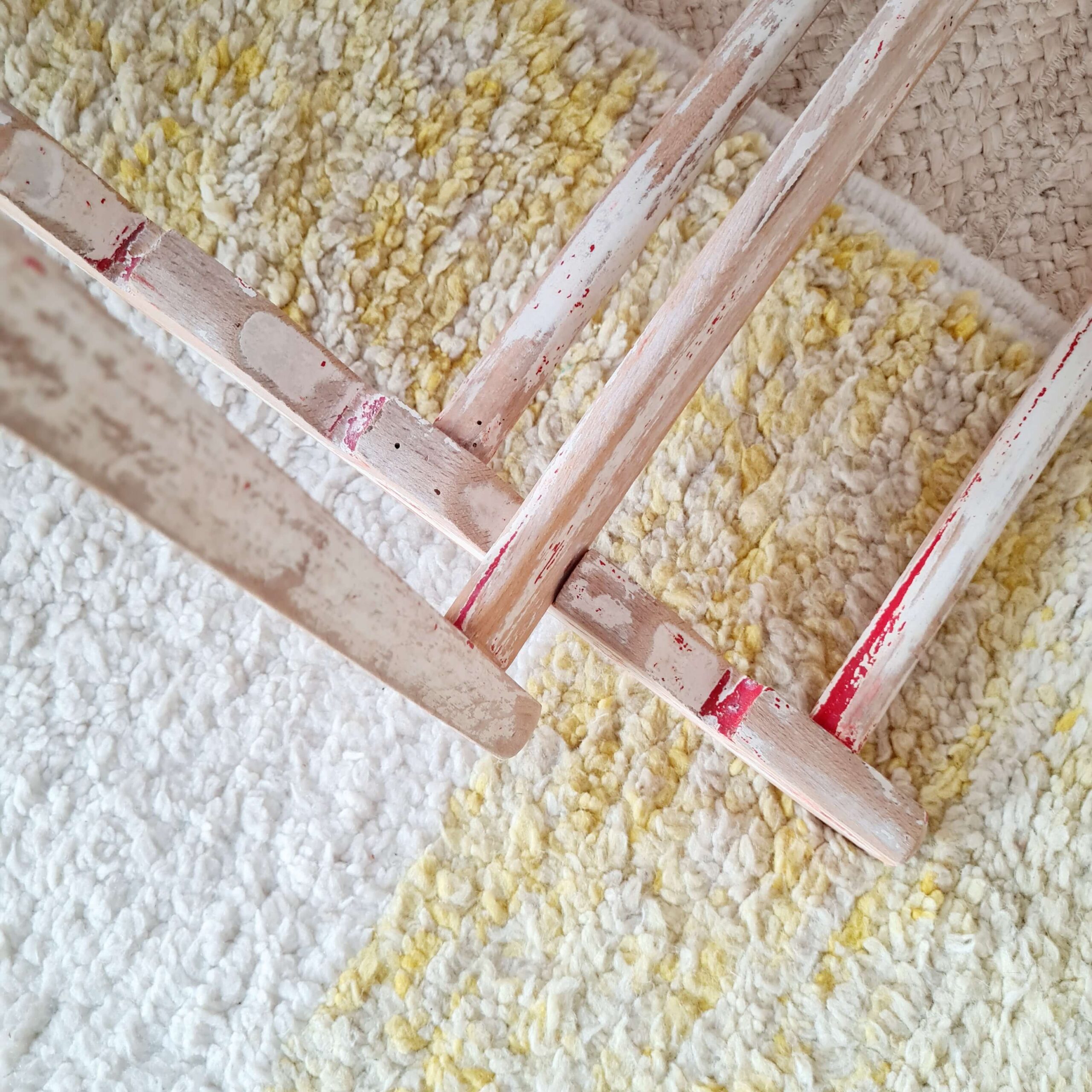 La structure ancienne est en bois, de couleur blanche fortement patinée laissant apparaître des touches de peinture rouge.